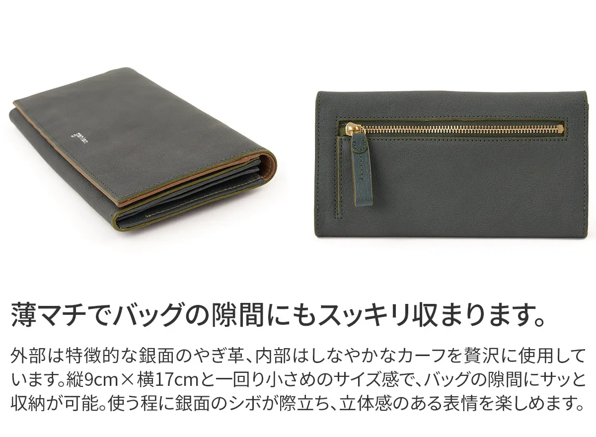 シンプルで、軽快に仕上げたカジュアルなゴート(山羊革)のイメージをくつがえすシリーズ。インド原皮のゴートは、パキスタン原皮に比べてシボが四角く立っているのが特徴です。(パキスタン原皮は流れるようなシボ)その中でも小判のゴートを使用。きめ細やかな肌目はカジュアルになりすぎず、革の地艶の輝きを出し、瑞々しく上品な印象になるよう仕上げています。 <素材の特徴・メリット>インド原皮のゴートをLWGゴールドレートを獲得したインドのタンナーで鞣しています。小物だからこそ版が取れる小判のゴートを使用しています。キットまではいきませんが、シボが四角くきめ細やかで、銀面が強いのも特徴です。内装はインドでピット鞣しをしたカーフを使用。 一回りコンパクトで、実用性の高いロングウォレットです。 お札やカード、レシート類を分けられるポケットを完備しているので整理整頓がしやすい作りとなっています。小銭入れは外に備えられており、少額のお買い物の際やとっさのお支払いに便利です。