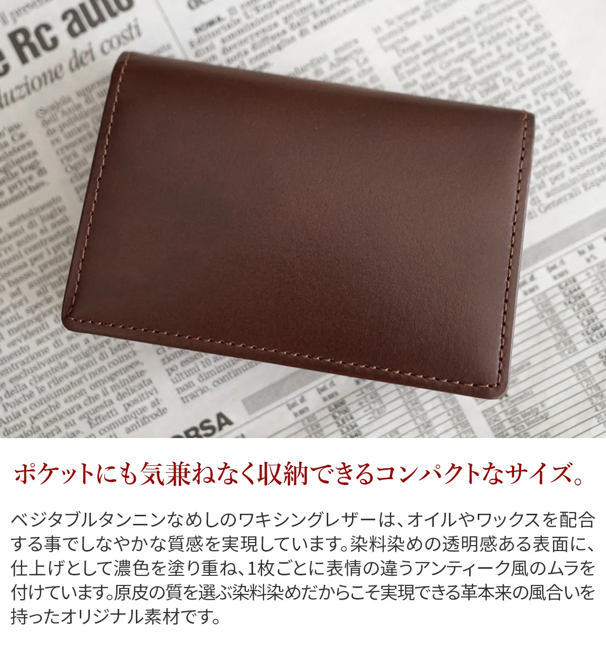ベジタブルタンニンなめしのワキシングレザーは、オイルやワックスを配合する事でしなやかな質感を実現しています。 染料染めの透明感ある表面に、仕上げとして濃色を塗り重ね、1枚ごとに表情の違うアンティーク風のムラを付けています。 原皮の質を選ぶ染料染めだからこそ実現できる革本来の風合いを持ったオリジナル素材です。 背面にスリットが入っているので、名刺交換の際に大変役立ちます。シンプルな作りなので、ギフトにもいお勧めです。