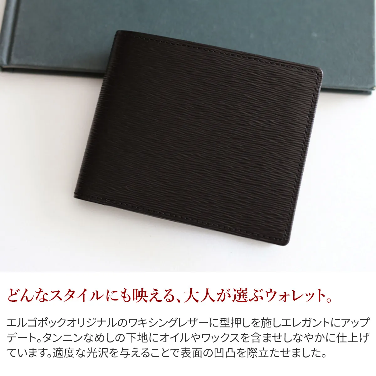 エルゴポックオリジナルのワキシングレザーに型押しを施しエレガントにアップデート。 タンニンなめしの下地にオイルやワックスを含ませしなやかに仕上げています。 適度な光沢を与えることで表面の凹凸を際立たせました。 06シリーズ(ワキシングレザー)から型押し素材がラインナップ。 こちらは二つ折り財布。革の厚さ調整をコンマ数ミリ単位でおこなった薄づくりな財布です。 スッキリしたフォルムと上品な型押しレザーなので、二つ折りタイプながらオンタイムでも使える面持ち。 型押しレザーは傷が目立ちにくく、ポケットに入れてデイリーにご使用いただきたい財布です。
