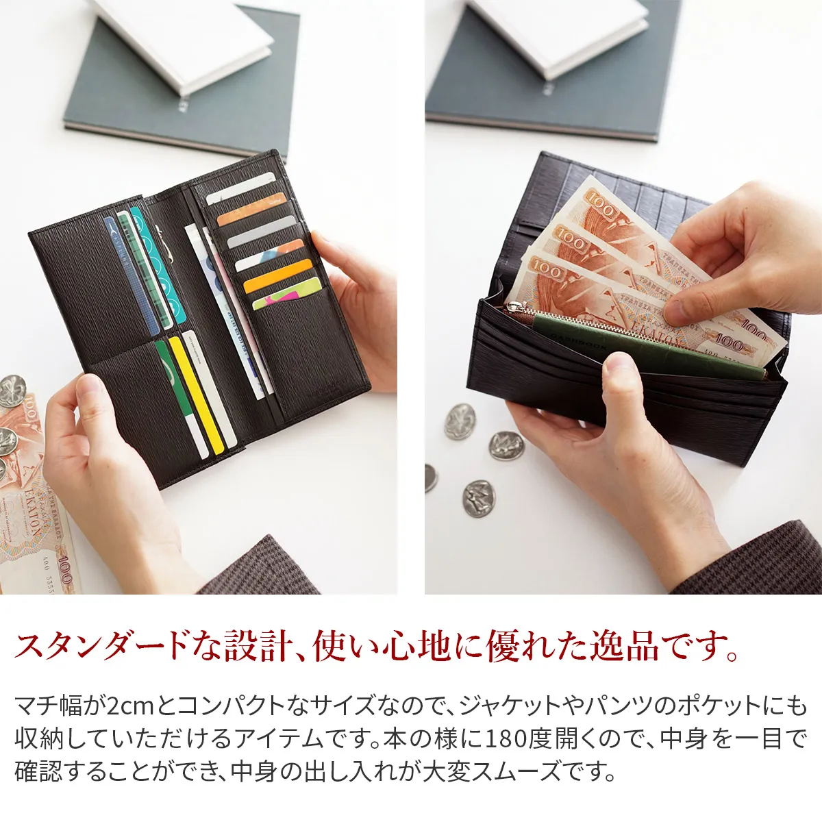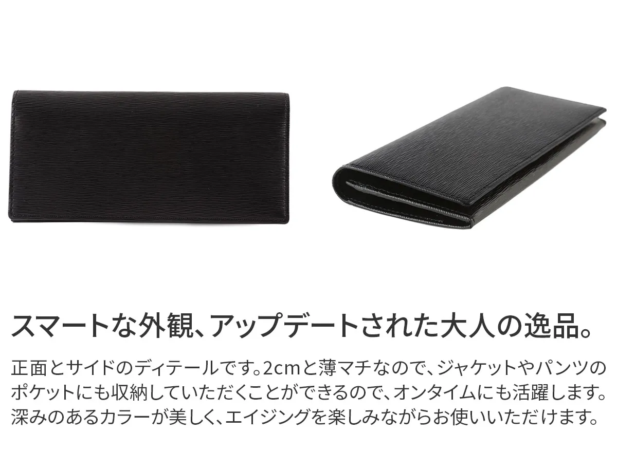 エルゴポックオリジナルのワキシングレザーに型押しを施しエレガントにアップデート。 タンニンなめしの下地にオイルやワックスを含ませしなやかに仕上げています。 適度な光沢を与えることで表面の凹凸を際立たせました。 06シリーズ(ワキシングレザー)から型押し素材がラインナップ。 こちらはフラップタイプの長財布。スマートな見た目でありながら、小銭入れと充分なカードスリットを装備。 内ポケットに入れてもジャケットのシルエットが崩れにくい薄づくりな構造にこだわりました。