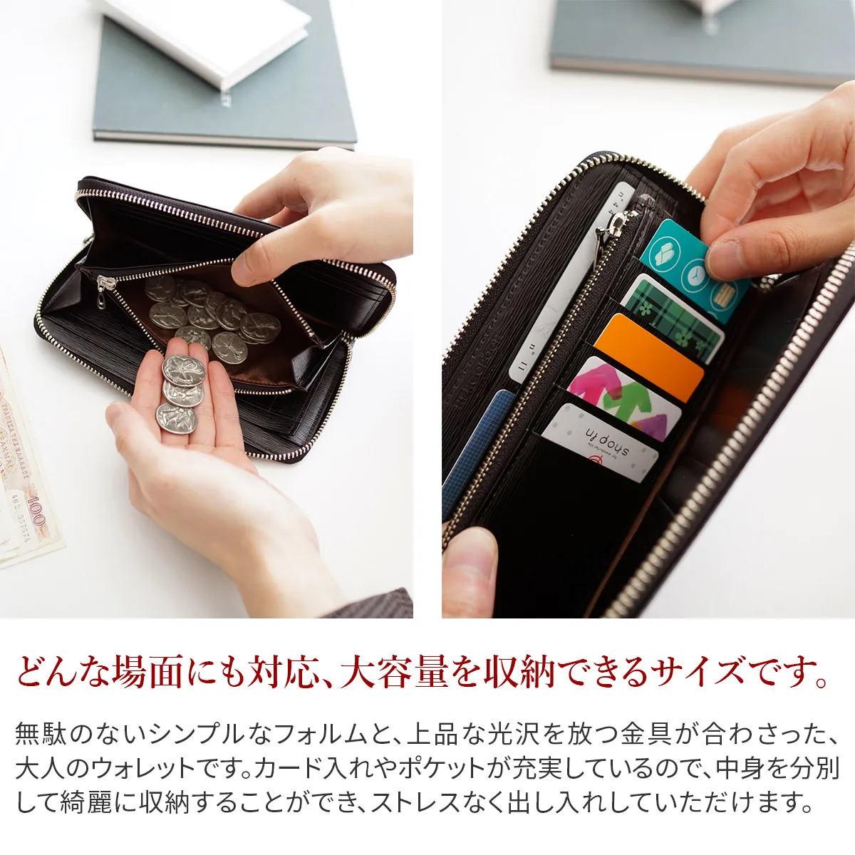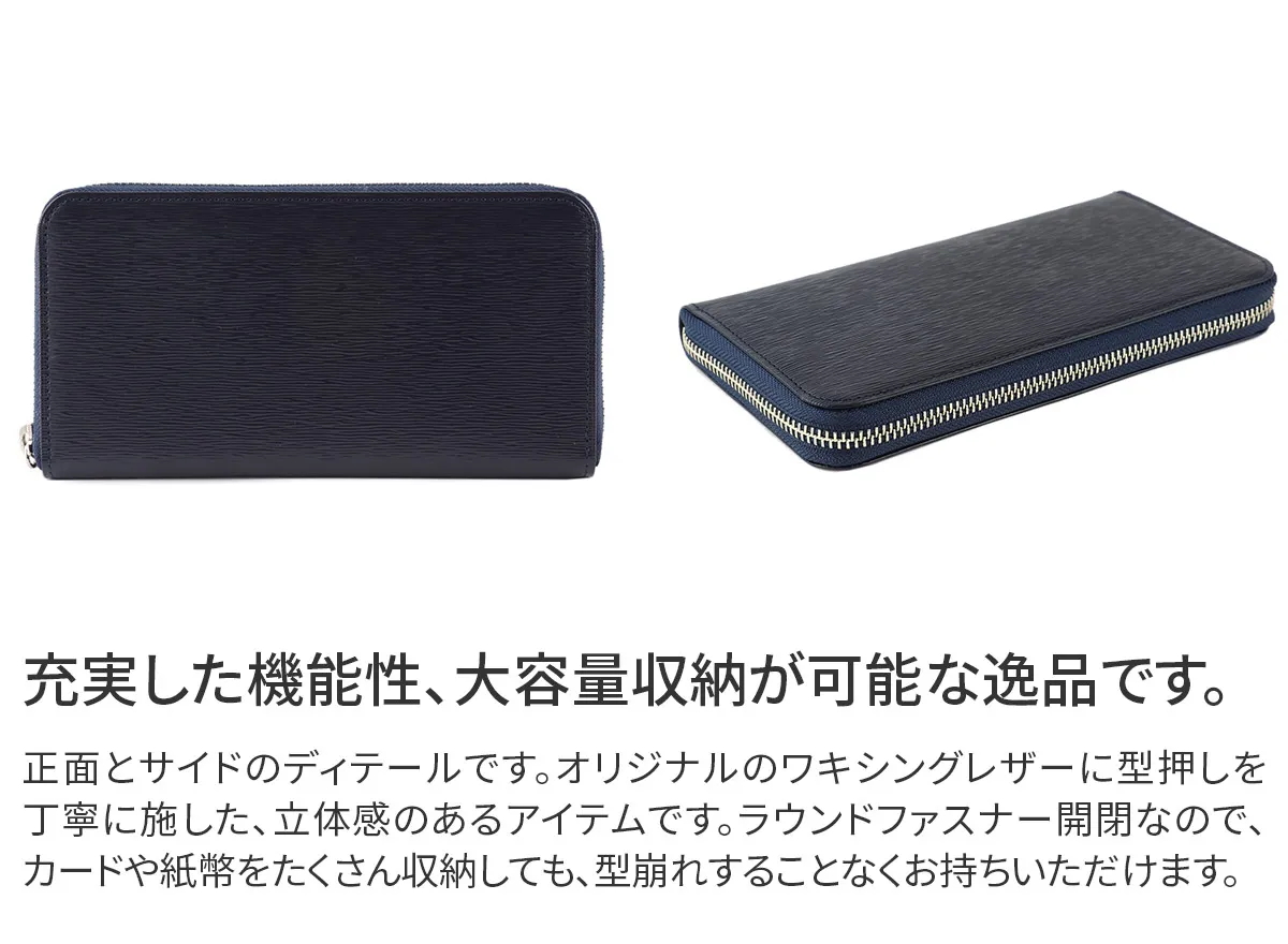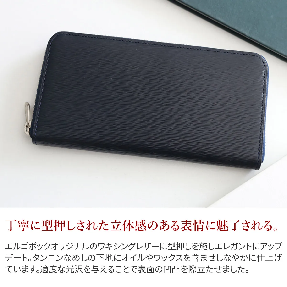 エルゴポックオリジナルのワキシングレザーに型押しを施しエレガントにアップデート。 タンニンなめしの下地にオイルやワックスを含ませしなやかに仕上げています。 適度な光沢を与えることで表面の凹凸を際立たせました。 06シリーズ(ワキシングレザー)から型押し素材がラインナップ。 こちらはファスナータイプの長財布。 3方に開くラウンドファスナー仕様のゆったりとしたつくりで、大きなスリットポケットを複数備え、さらに21枚ものカードポケットも有する充実した収納スペースが魅力。 取り出し易さを追求し片側にマチを設けています。