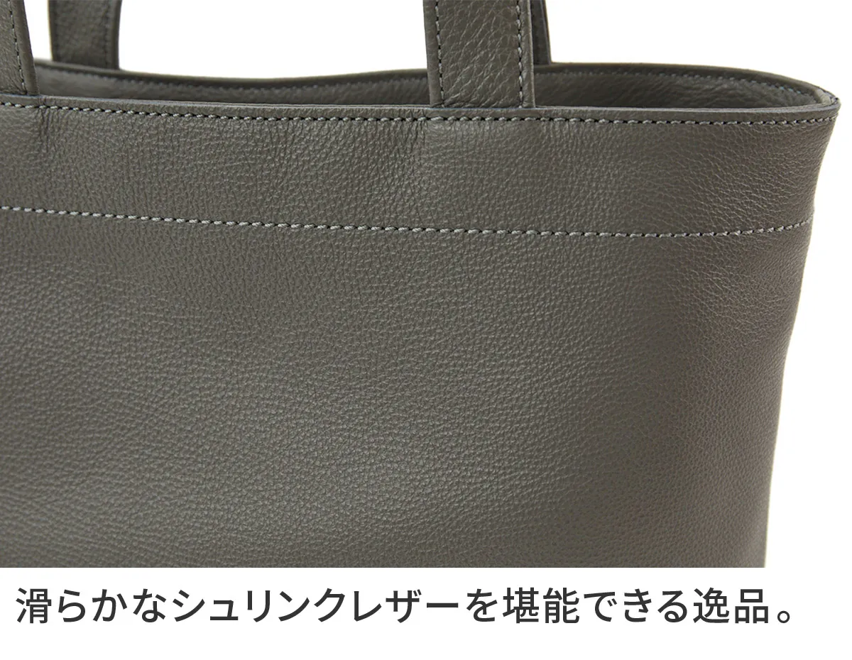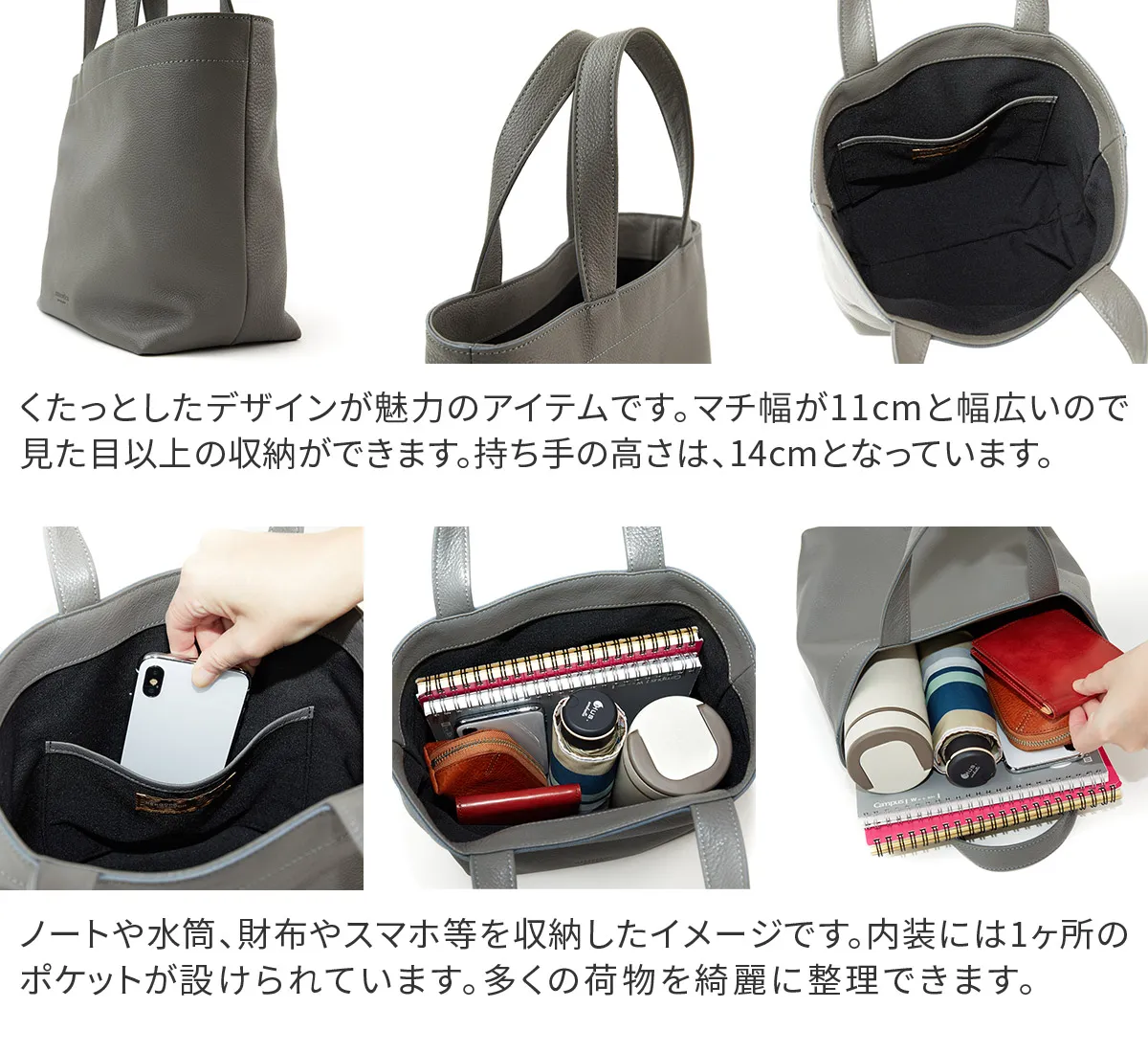 一般的にキャンバス生地のものをよく見かける所謂「カフェバッグ」をレザー仕様にアップデート。 くたっと感が魅力のソフトシュリンクレザーなので使用感は布帛のバッグのように軽く日常使いに最適なバッグです。 飽きのこないミニマルデザインとカラーでユニセックスにお持ちいただけます。 シンプルな台形フォルムのトートバッグです。 程よいサイズ感で気兼ねなくお使いいただけます。 オープン開閉で中身の取り出しもしやすく、様々なシーンで活躍します。