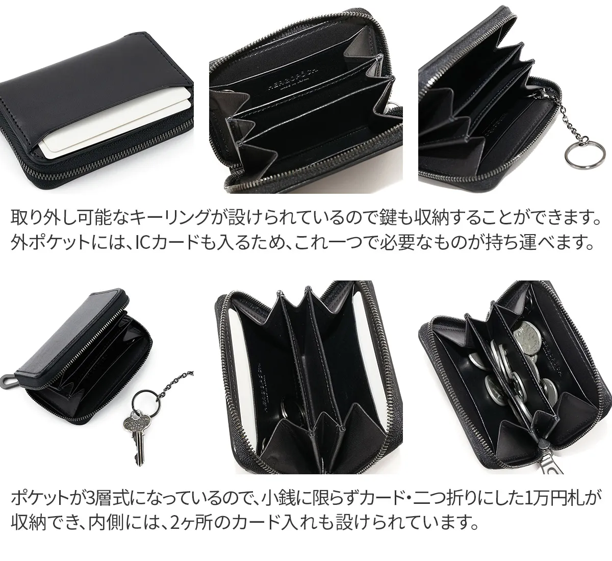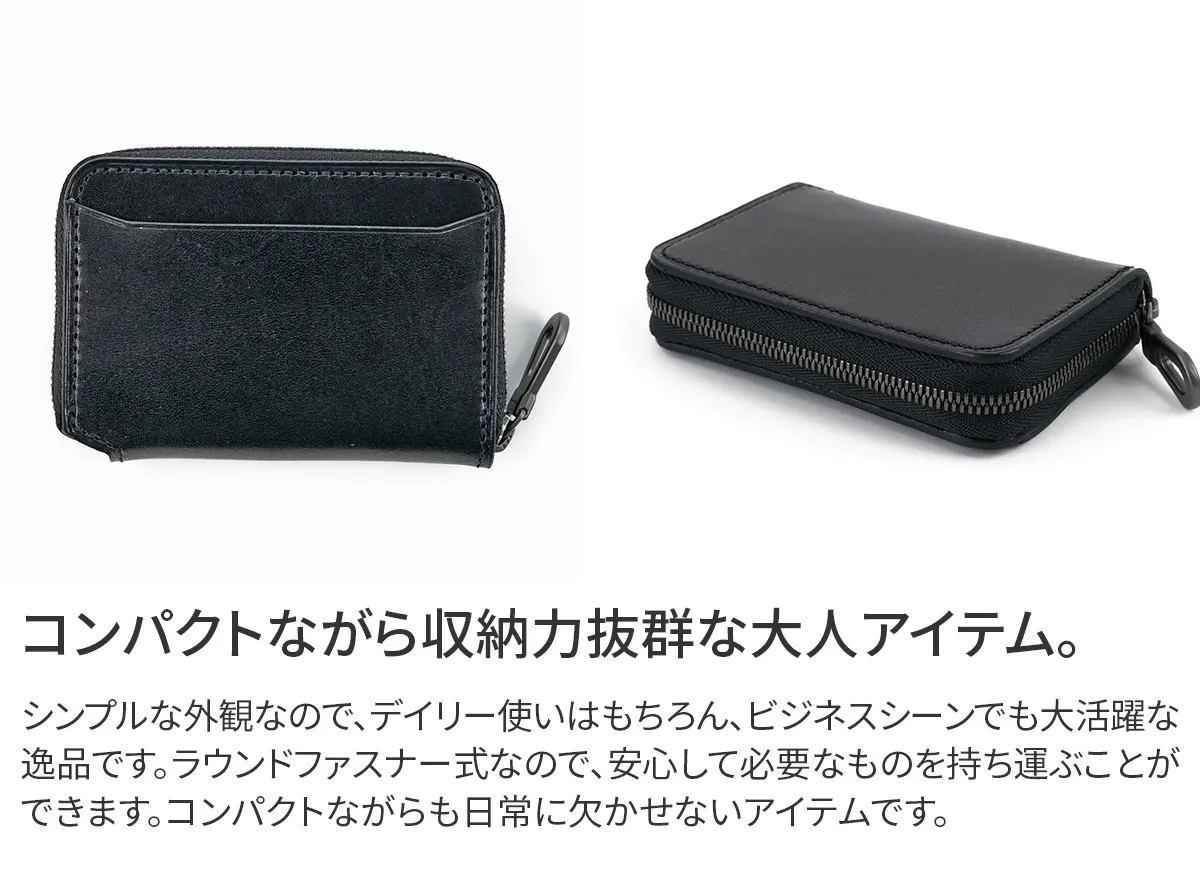 外装にピット鞣しの本ヌメ革を使用し男らしい雰囲気が漂います。 日常的に手に触れることの多い革小物は、堅牢なピット鞣し革の魅力を最大限引き出せるアイテム。 内装のレザーにはソフトヌメ革を使用しているので馴染みが早く、使い心地も良いのが特徴です。 コンパクトな3層式のコインケース。小銭はもちろん、二つ折りのお札やカードも収納できます。 取り外し可能なキーリングも付いており、鍵を収納することも可能です。