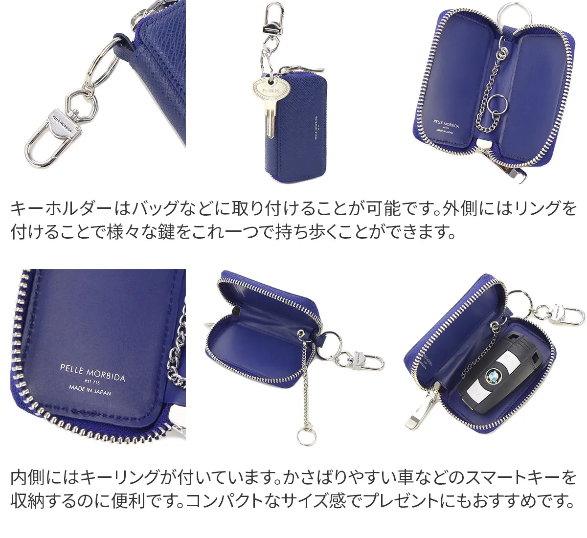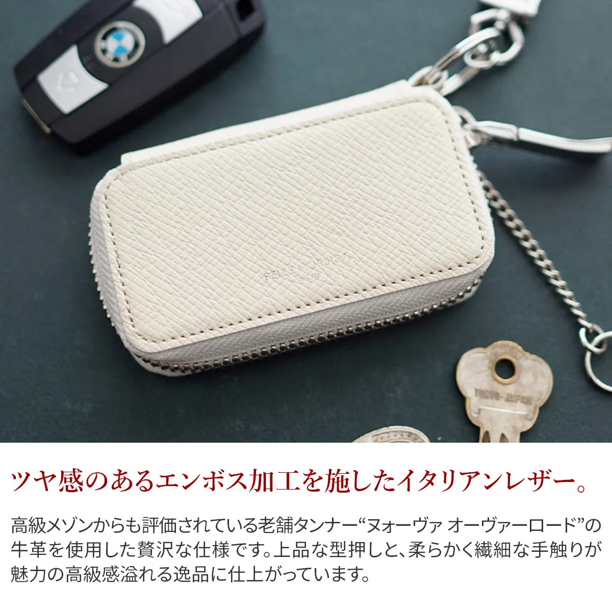 かさばりやすい車などのスマートキーを収納できるスマートキーケースです。外側にリングを付けることで様々な鍵を持ち歩くことができるデザインになっています。バッグなどに付けることでチャームのように持ち歩くことができます。 高級メゾンからも評価されている老舗タンナー“ヌォーヴァ オーヴァーロード”の牛革を使用した贅沢な仕様です。上品な型押しと、柔らかく繊細な手触りが魅力の高級感溢れる逸品に仕上がっています。