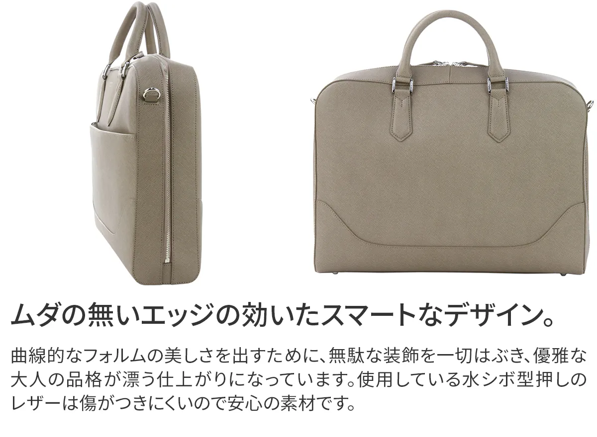 曲線的なフォルムの美しさを出すために、無駄な装飾を一切はぶき、優雅な大人の品格が漂う仕上がり。 使用している水シボ型押しのレザーは傷がつきにくく、エッジの効いたスマートな印象です。 普段のビジネスシーンを、一層上品で都会的なスタイルに見せてくれる優秀バッグです。 A4冊子が余裕で収まり、中仕切りがあるのでバッグの整理も簡単。 背面内側のスナップボタン付きポケットには肉厚なウレタン素材のクッションを入れているので、タブレットPCを収納するのにも最適です。 ショルダーストラップで斜めがけにする事もでき、ストレスフリーで使える、まさにかゆいところに手の届くデザインです。