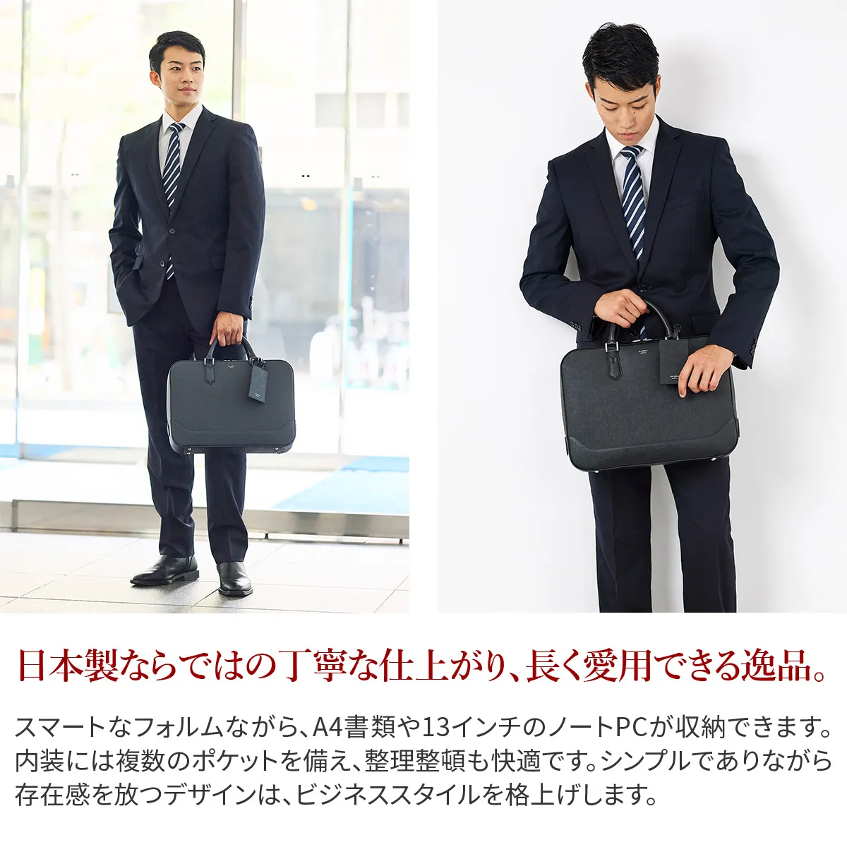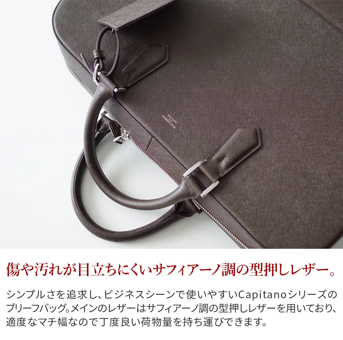 シンプルさを追求し、ビジネスシーンで使いやすいデザインに仕上げたCapitanoシリーズのブリーフバッグ。 メインのレザーはサフィアーノ調の型押しレザーを用いており、スタイリッシュさが強調されます。 適度なマチ幅なので丁度良い荷物量を持ち運びでき、機能性と見た目のバランスが考えられた仕様になっています。 《素材の特徴》 安全性や環境に配慮し、国際団体Leather Working Groupに日本で唯一加盟するタンナーのレザーを採用。 細かな筋を格子状に並べたサフィアーノ調の型押しによって大人の色気を演出するとともに、キズや汚れなど目立ちにくいのが特徴です。