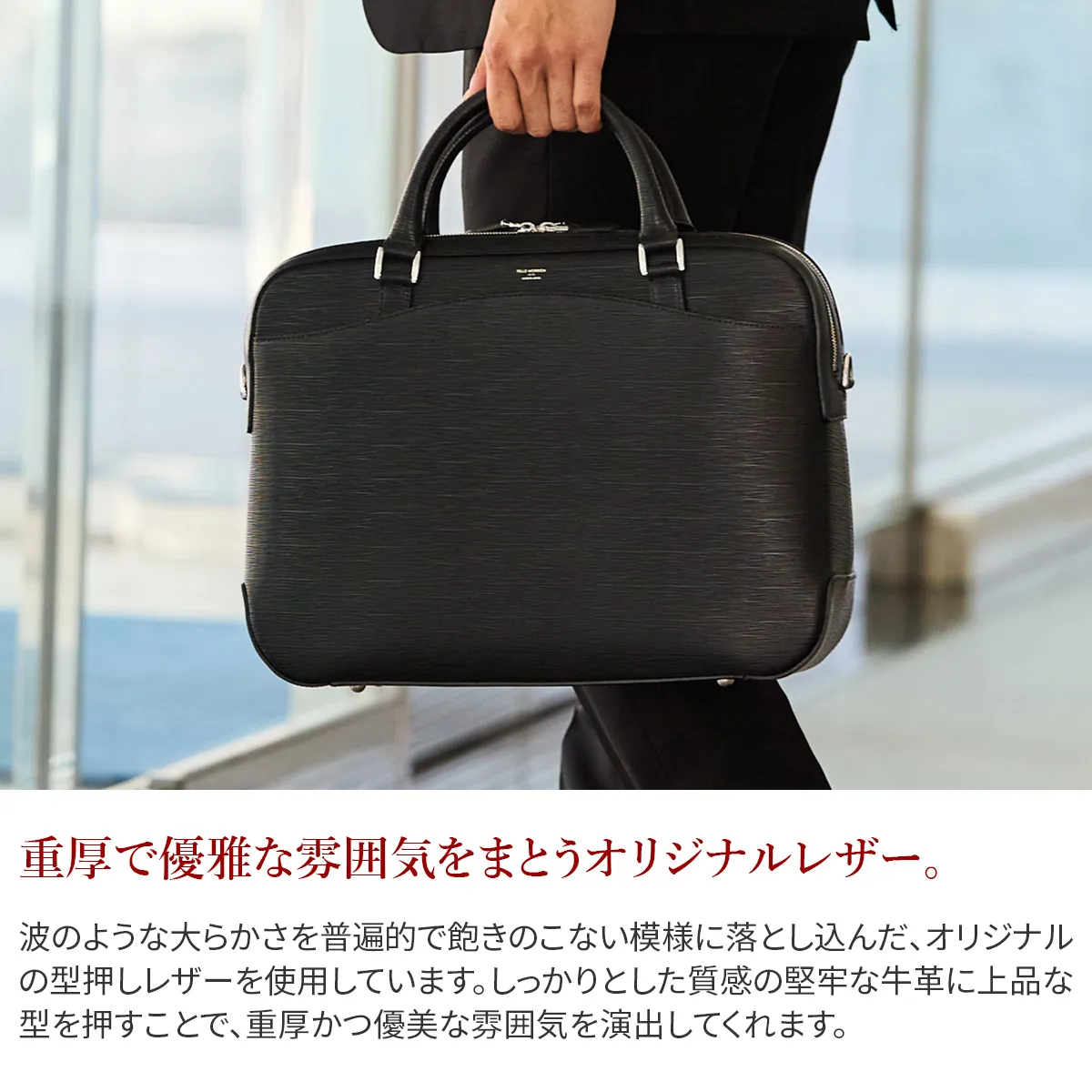 波のような大らかさを普遍的で飽きのこない模様に落とし込んだ、オリジナルの型押しレザー。 しっかりとした質感の上質な牛革にシンプルな型を押すことで、重厚かつ優美な雰囲気を出しました。 傷も目立ちにくくなっています。大人のスーツスタイルを格上げする仕上がりです。