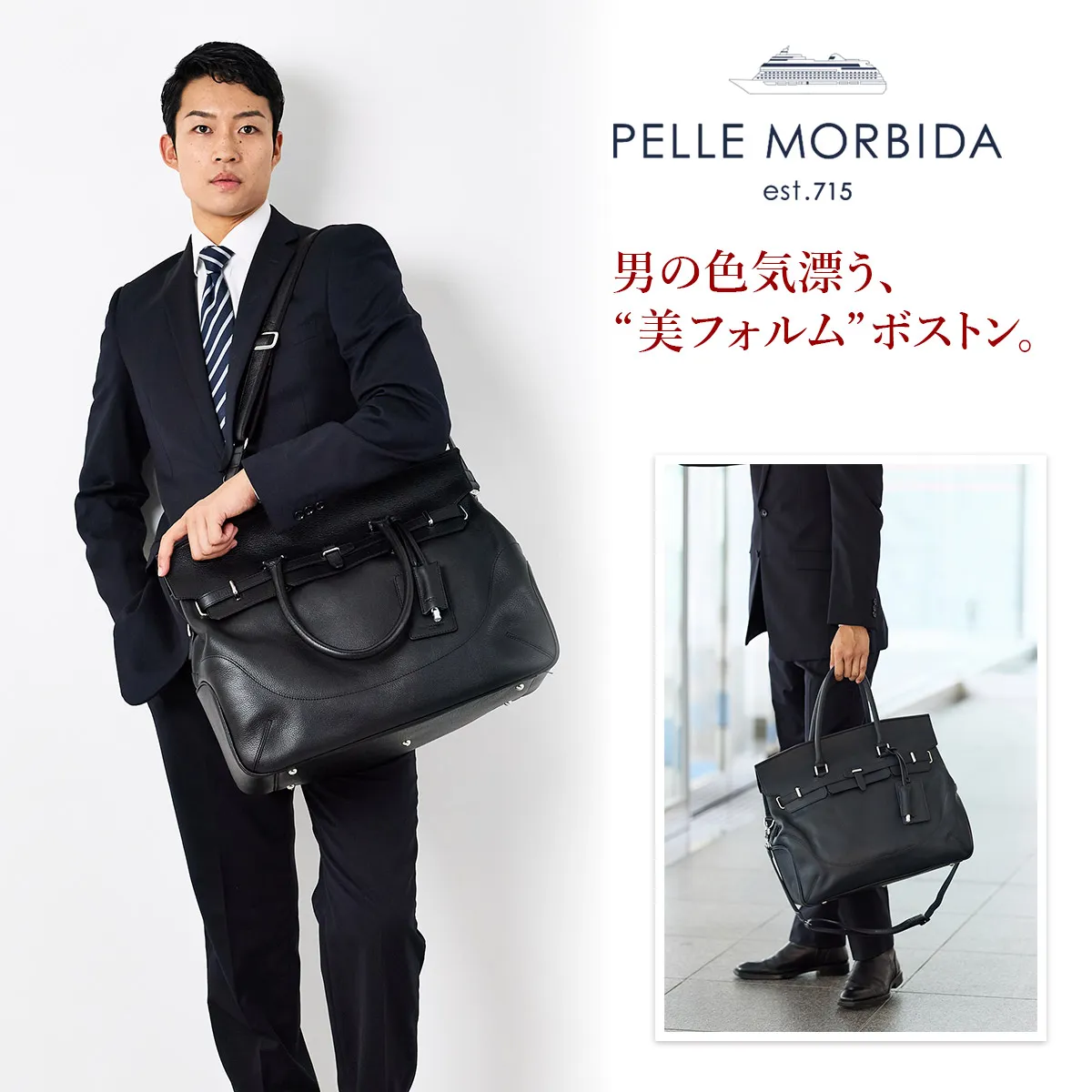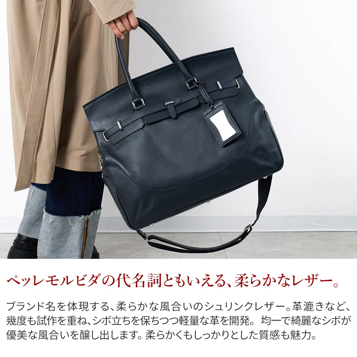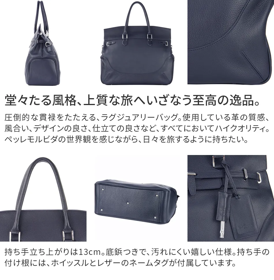 スッキリスマートに収納できる美フォルム。このボストンバッグは”やわらかな肌”という意のブランド名に恥じない、しっとりとした肌触りとリッチな表情。極上コンフォートの逸品は男の色気をさり気なく引き立ててくれます。 ペッレ モルビダの代名詞でもある柔らかな風合いのシュリンクレザー。 革漉きなど、幾度も試作を重ね、シボ立ちを保ちつつ軽量な革を開発。 均一で綺麗なシボが優美な風合いを醸し出します。 柔らかさを表現しつつも、しっかりとしているため長く使えます。