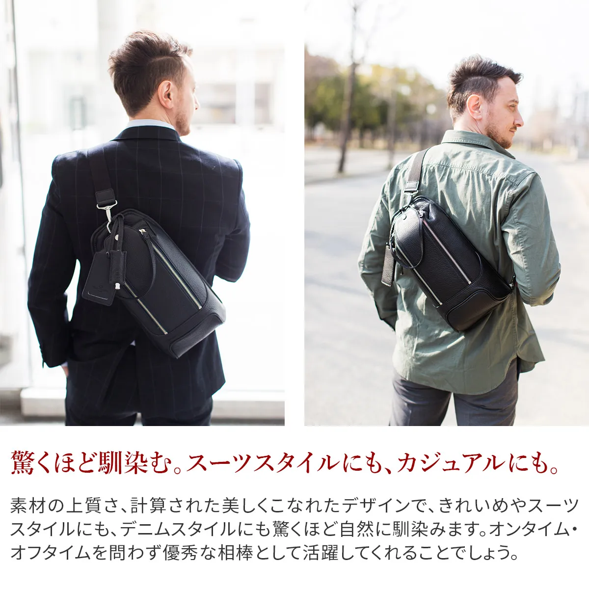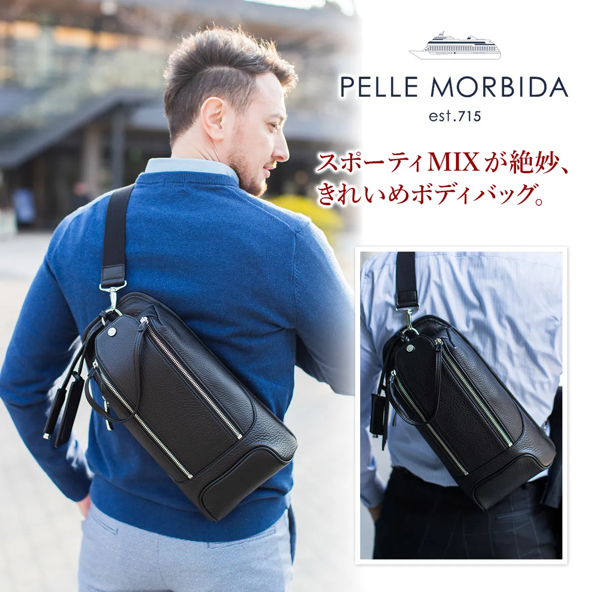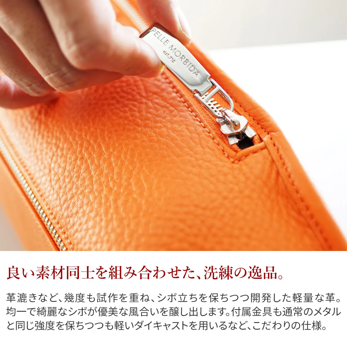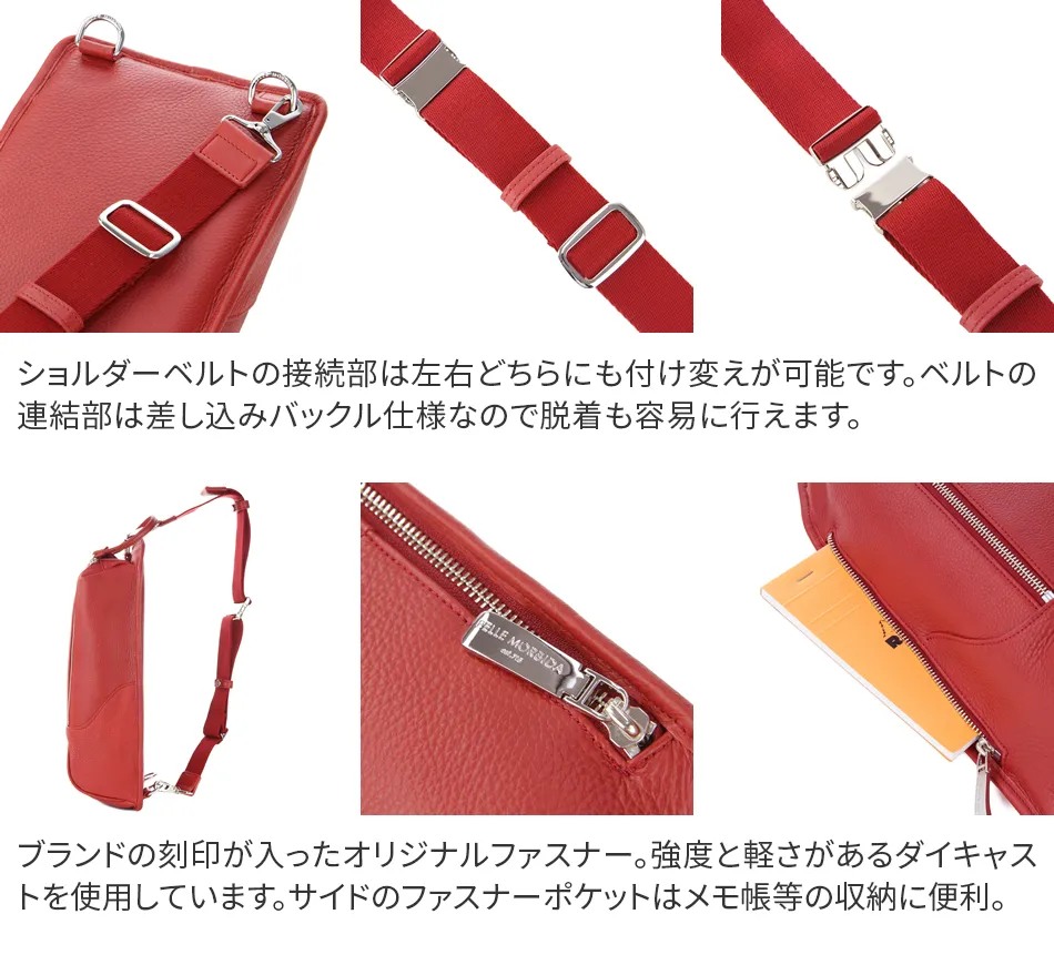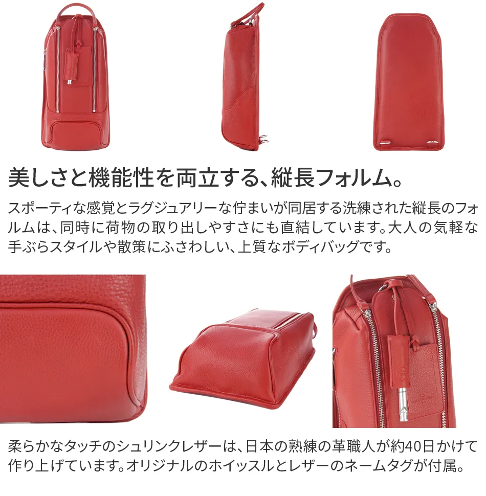 休日などちょっとしたお出かけに持っていけるバッグには様々なスタイルがあるもの。 この縦型ボディバッグは、荷物をコンパクトにまとめて持ち運べる優れもの。 シュリンクレザーで贅沢に仕上げているので、カジュアルになりすぎない風格を残します。 大人のスポーティースタイルに持ちたいアイテムです。 ペッレ モルビダの代名詞でもある柔らかな風合いのシュリンクレザー。 革漉きなど、幾度も試作を重ね、シボ立ちを保ちつつ軽量な革を開発。 均一で綺麗なシボが優美な風合いを醸し出します。 柔らかさを表現しつつも、しっかりとしているため長く使えます。