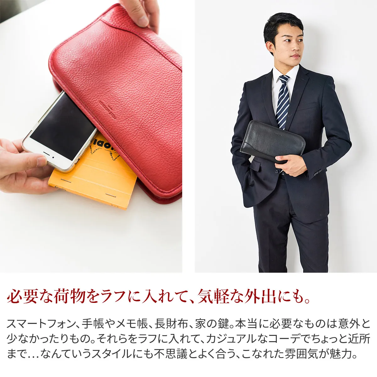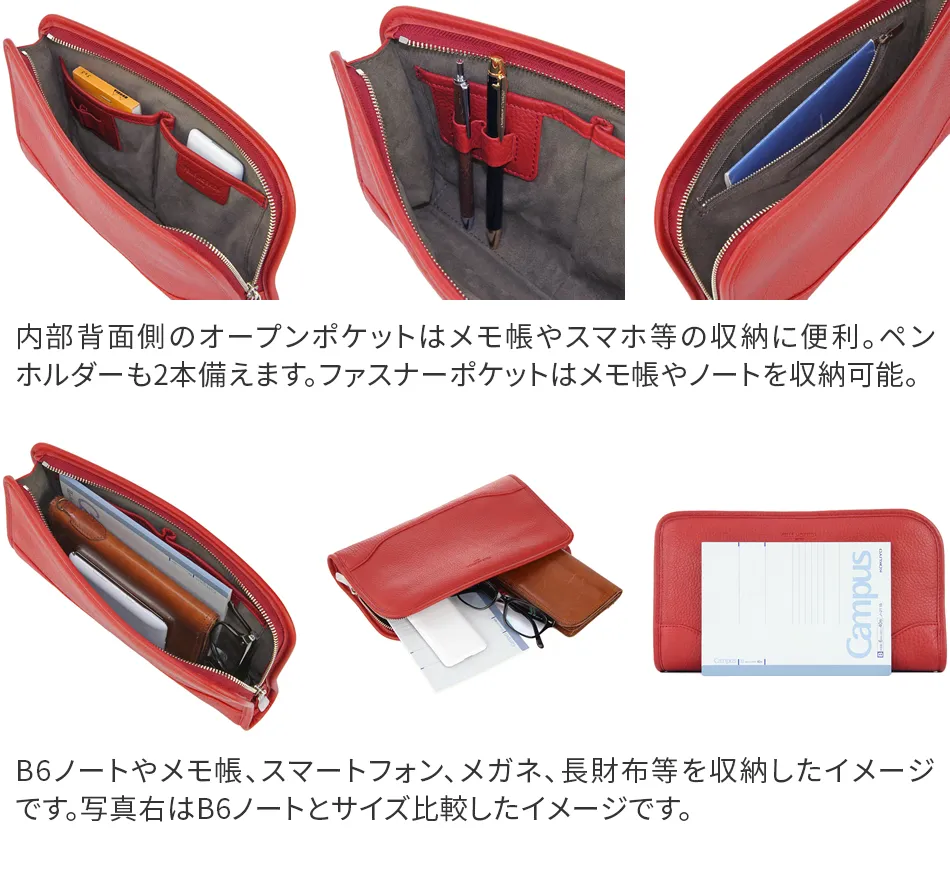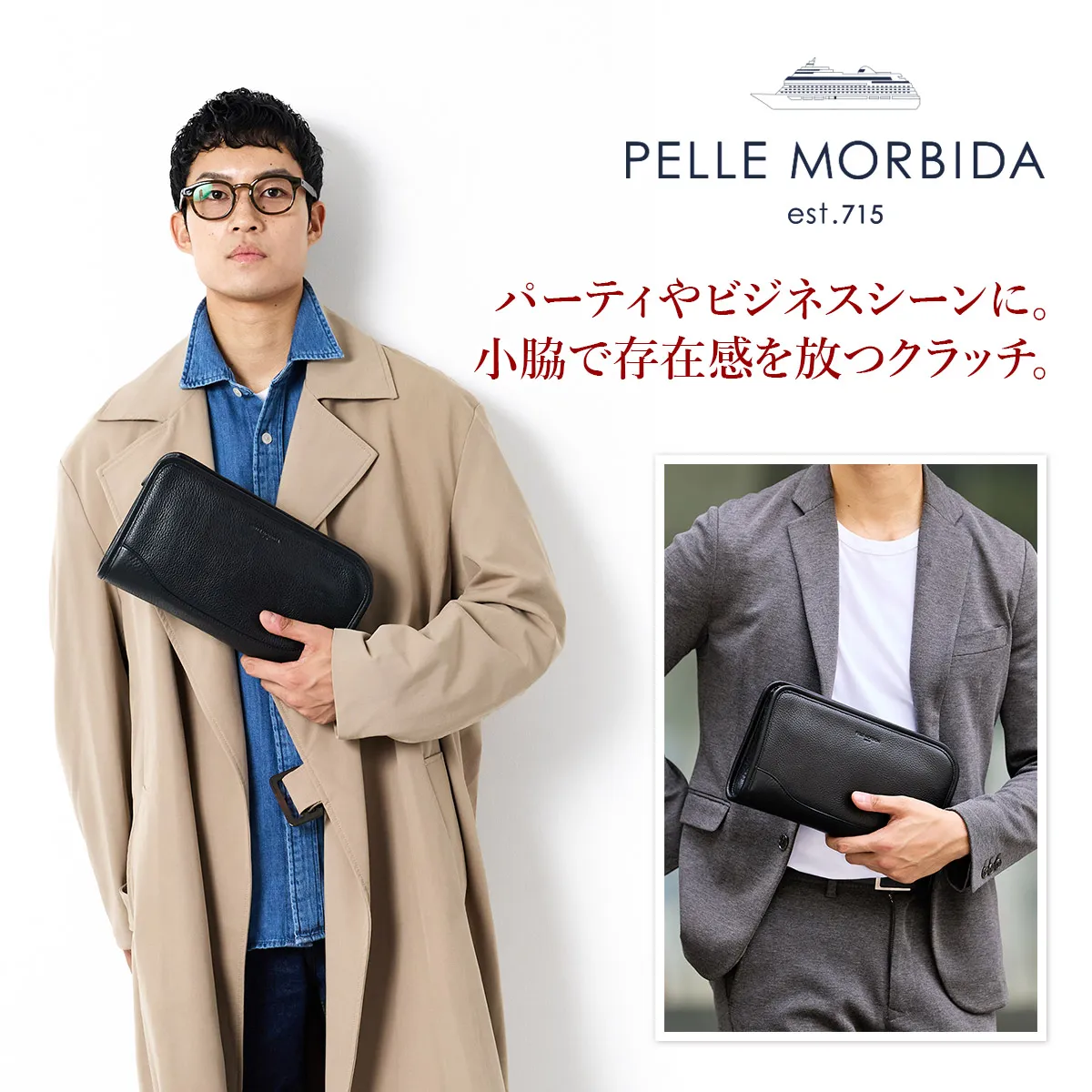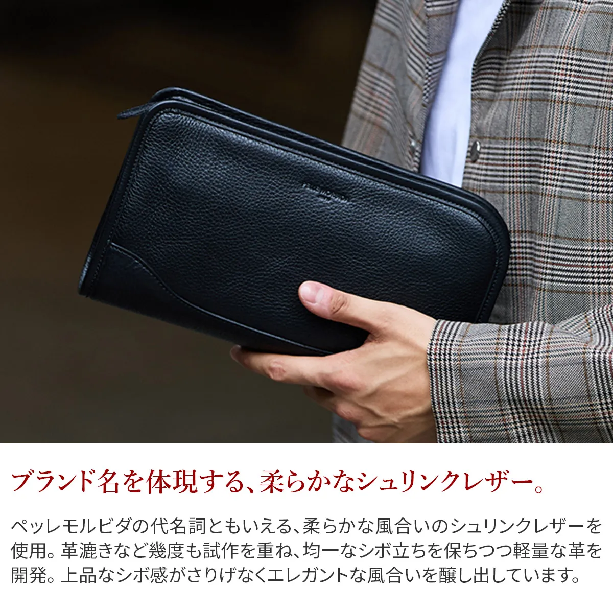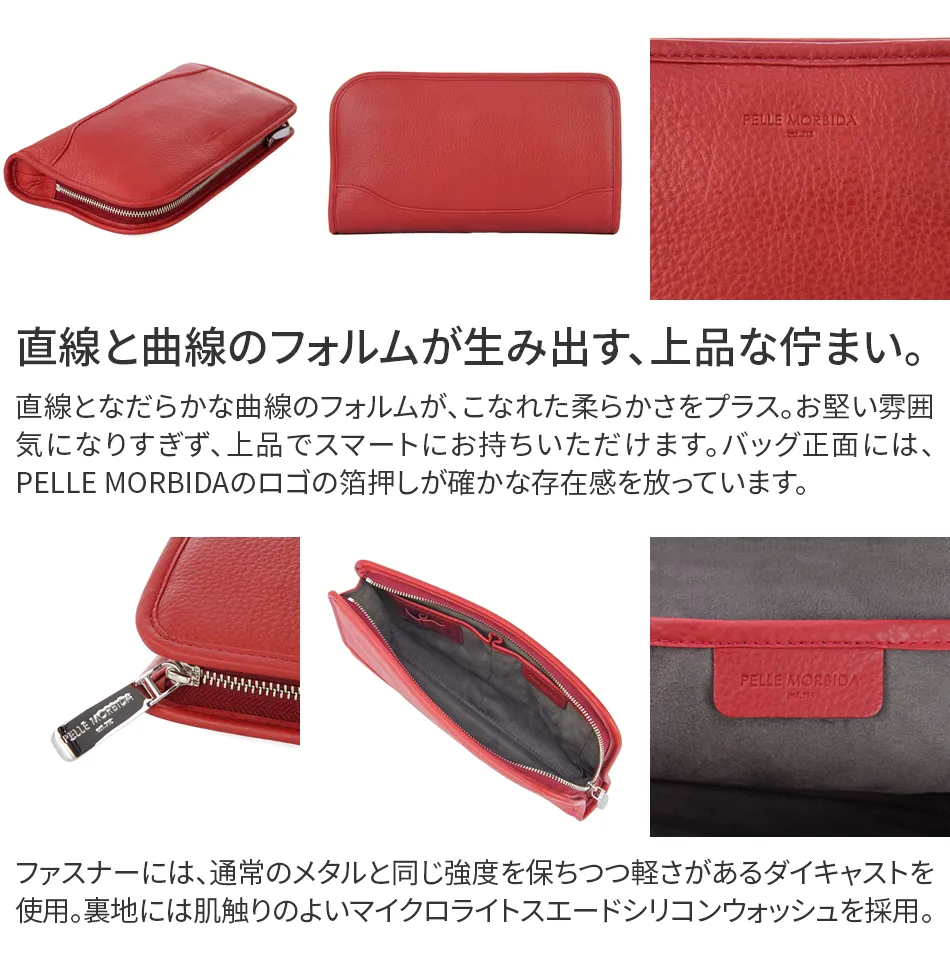 オフスタイルだけでなくビジネスシーンでクラッチバッグが活躍することも増えてきた今日このごろ。このクラッチバッグはガシっと手で持つアイテムなので、シュリンクレザーのやわらかさをダイレクトに感じることができます。さりげないデザインなのでパーティーシーンのドレスアップを引き立てます。 ペッレ モルビダの代名詞でもある柔らかな風合いのシュリンクレザー。 革漉きなど、幾度も試作を重ね、シボ立ちを保ちつつ軽量な革を開発。 均一で綺麗なシボが優美な風合いを醸し出します。 柔らかさを表現しつつも、しっかりとしているため長く使えます。