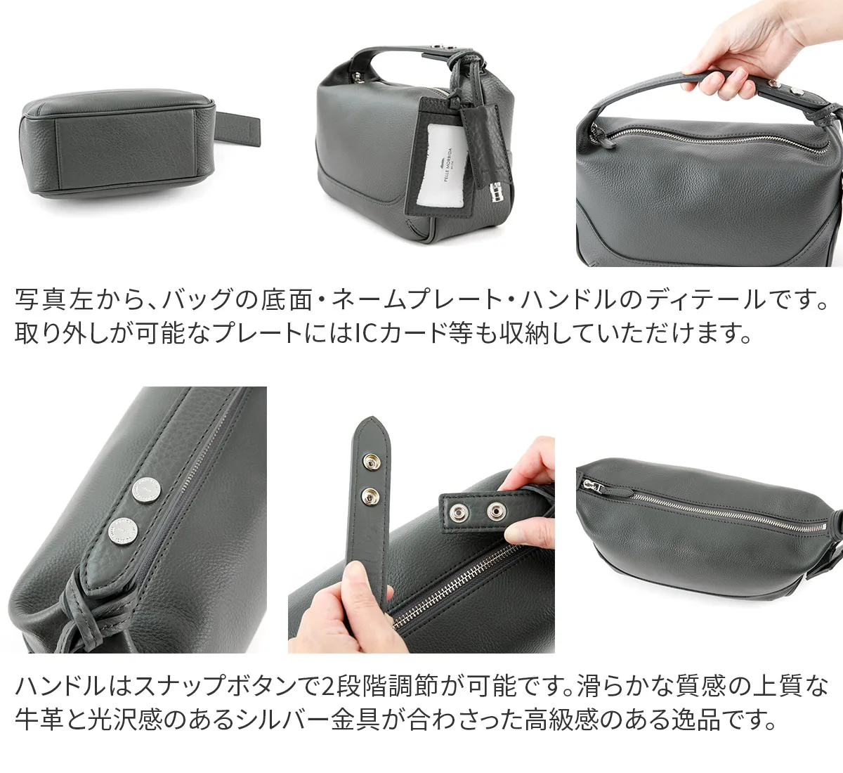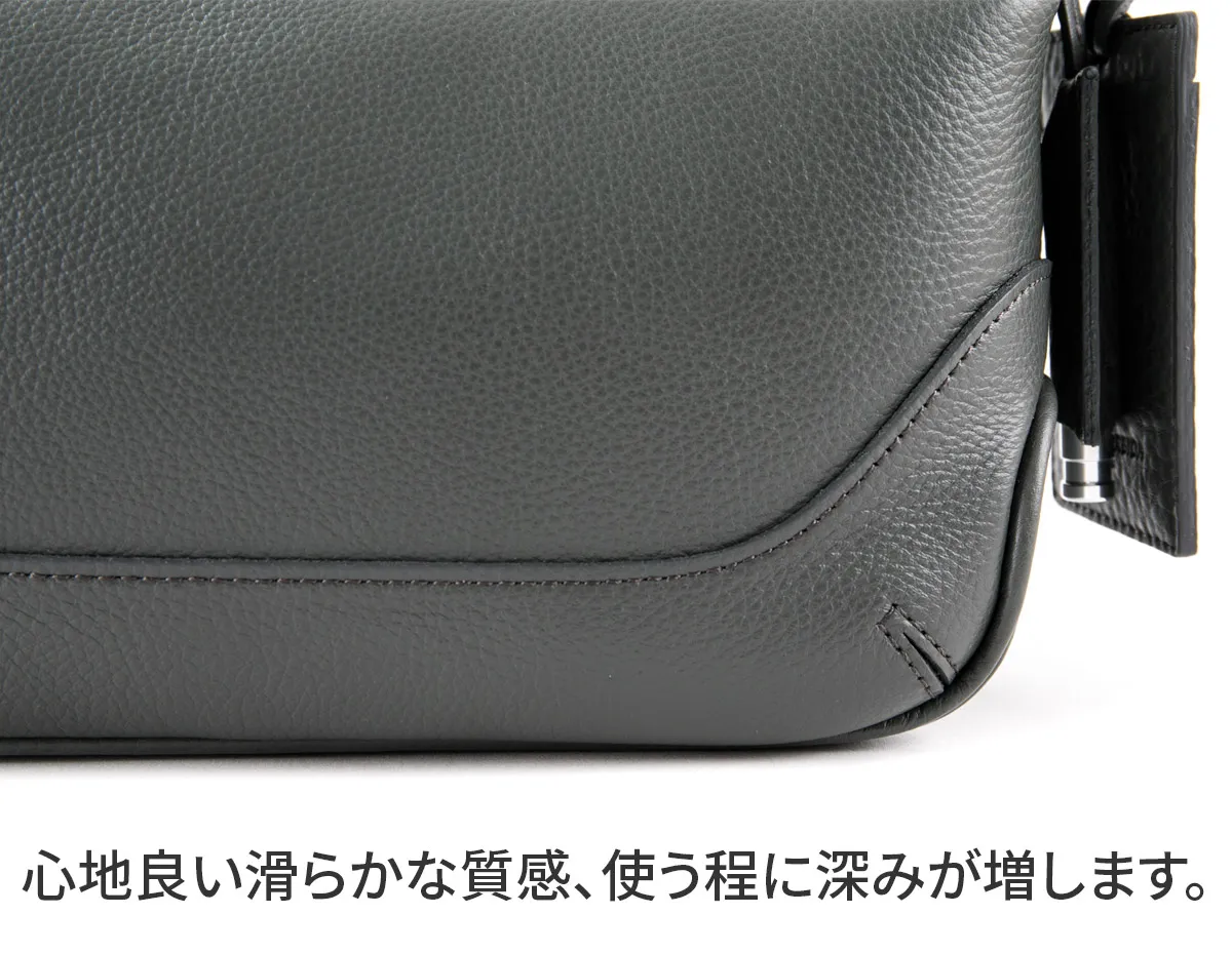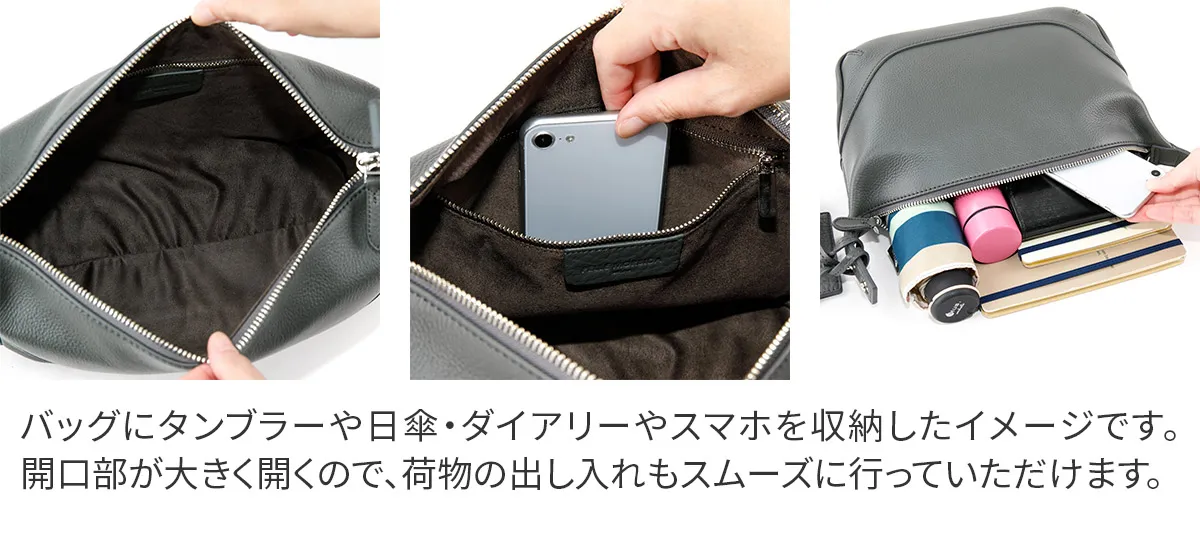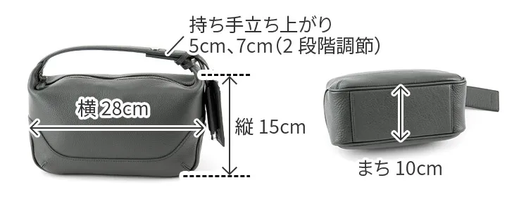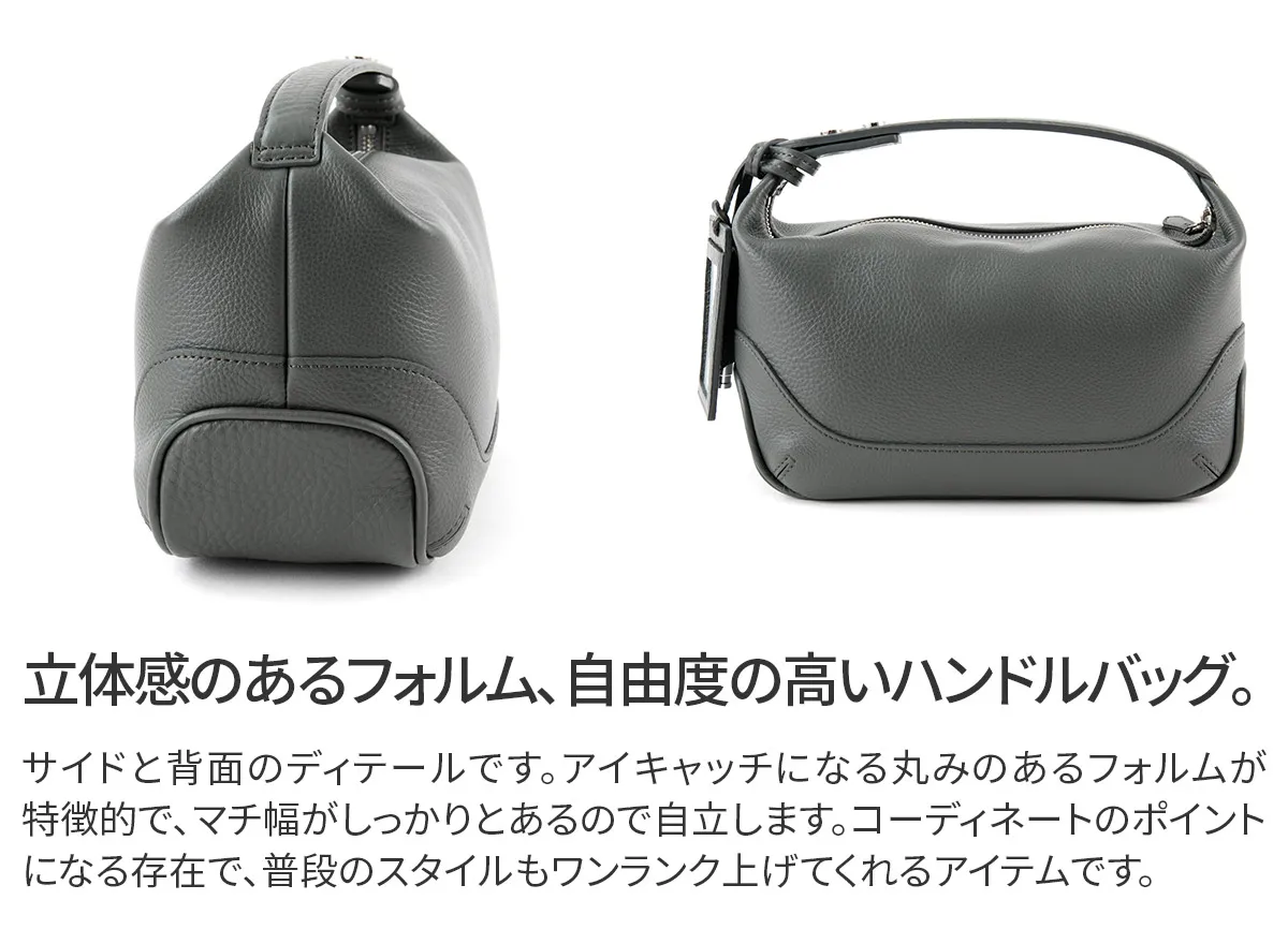 皮革生産地である姫路松原地区で開発したやわらかなシュリンクレザー。 丹念に下地を鞣し、乾燥後にさらに専用のマシーンでバタ振りをすることで上品で味のあるシボ立ちを実現させました。 カラーリングは下地の段階から各カラーごとに芯通し(革の中まで染める)する技法で、色の魅力を最大限に引き出しています。 乾燥後、軽くアイロンがけを施し、表面の艶を調整しています。 日本の革職人ならではの勘と知恵と技術を駆使し、長期間かけて作られた革素材を使用しています。 内装はマイクロライトスエードシリコンウォッシュで心地よい肌触りに。 スーパーホワイト加工によって輝く金具がアクセントになっています。 お出かけにマストな貴重品はしっかりと収納していただけるので、お出かけに最適です。 ハンドル部分はドットボタンで取り外し可能なので、荷物の量やコーディネートに合わせて付け替えていただけます。