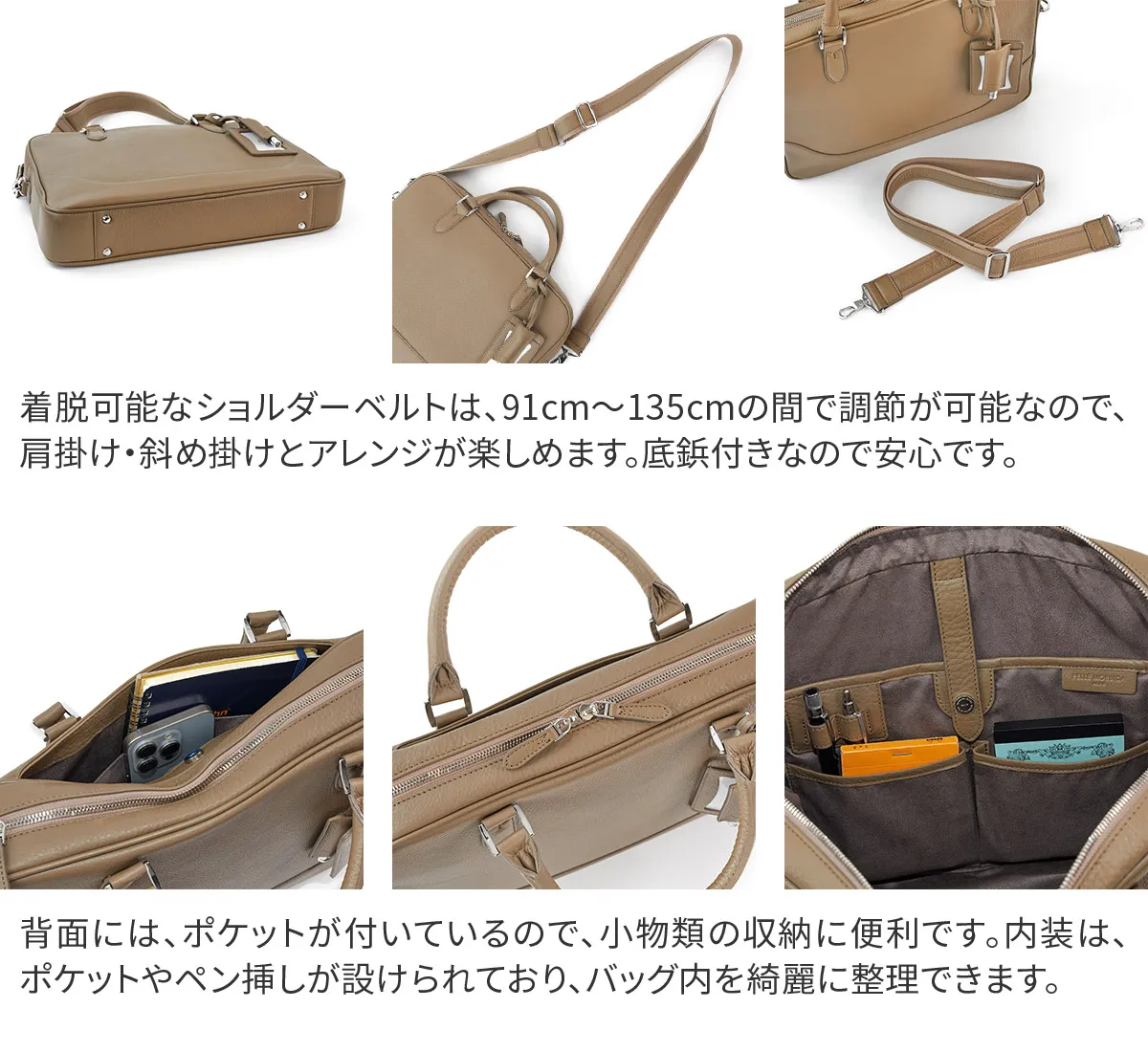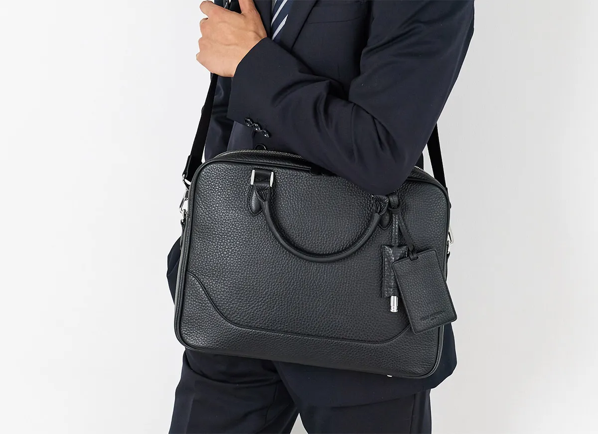 定番ブリーフバッグをミニマムアップデート 大人気シリーズのMaiden Voyageシリーズのブリーフバッグ。 定番で展開していたアイテムに金具のサイズやデザインを変更するなどのミニマムチェンジを施しました。 A4ジャストサイズのコンパクトなサイズながらも、内装は収納しやすいようなポケット、ショルダーベルトも付属しており肩掛け、斜め掛けでも使用可能な仕様です。 《素材》 皮革生産地である姫路松原地区で開発したやわらかなシュリンクレザー。 丹念に下地を鞣し、乾燥後にさらに専用のマシーンでバタ振りをすることで上品で味のあるシボ立ちを実現させました。 カラーリングは下地の段階からカラーごとに芯通し(革の中まで染める)する技法で、色の魅力を最大限に引き出しています。 裏地にはクリスタルのような透明感と、耐久性を備えた東レの“ミラコスモ”を採用。 PELLE MORBIDAらしい、柔らかく気品のあるシュリンクレザーを使用したブリーフバッグ。 ブリーフバッグに適度な抜け感をプラスした絶妙な雰囲気に仕上がっています。 現代のビジネススタイルにマッチした逸品です。