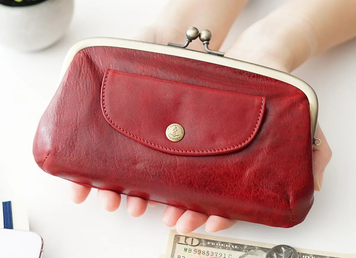 丸みを帯びたがま口が特徴の親子がま口長財布です。小銭入れもがま口になっており、お会計もスムーズに行えます。クラッチバッグのようにお財布単体で持っても品よく決まります。 素材は、イタリアンレザーを使用しています。経年変化が楽しめるのはもちろん透明感があり、落ち着いた印象に見えます。あたりさわりのない革の質感で、何にでも合わせやすいところが嬉しいポイントです。トレンドに左右されないベーシックなデザインなので長くお持ちいただきやすいシリーズになります。