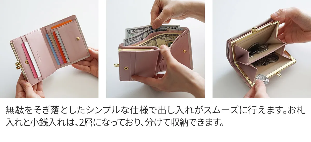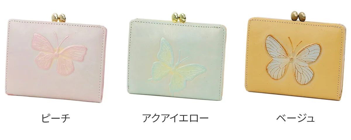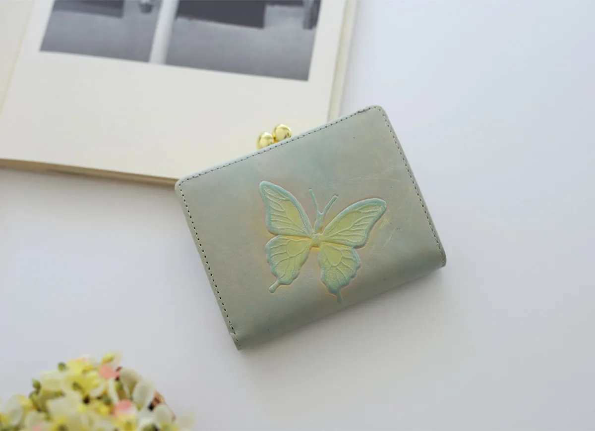 オーダーメイドのように、一点ごとに蝶が優雅に舞う華やかなイタリアンレザーシリーズです。 軽量でコンパクトなサイズの二つ折り財布。 小銭入れはがま口仕様になっており、開閉しやすいのがポイントです。 1点1点模様が違うので、使用する度に愛着が増していく逸品です。