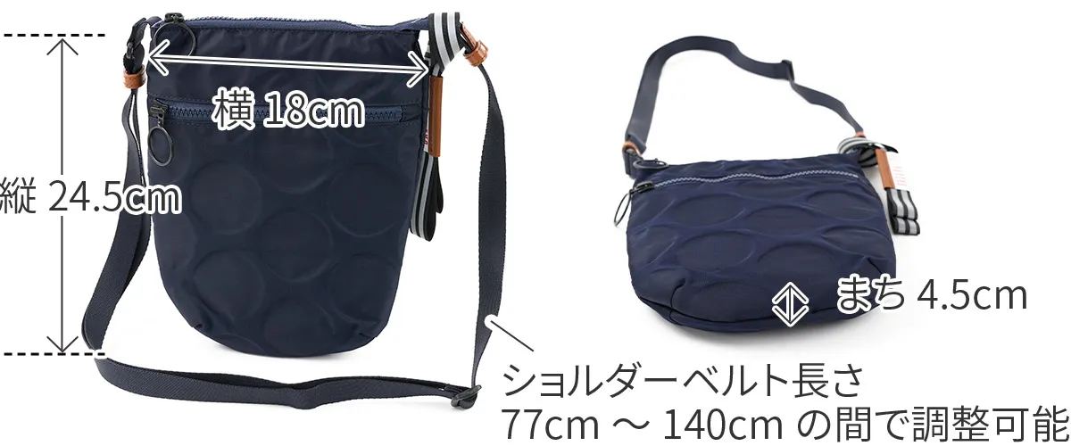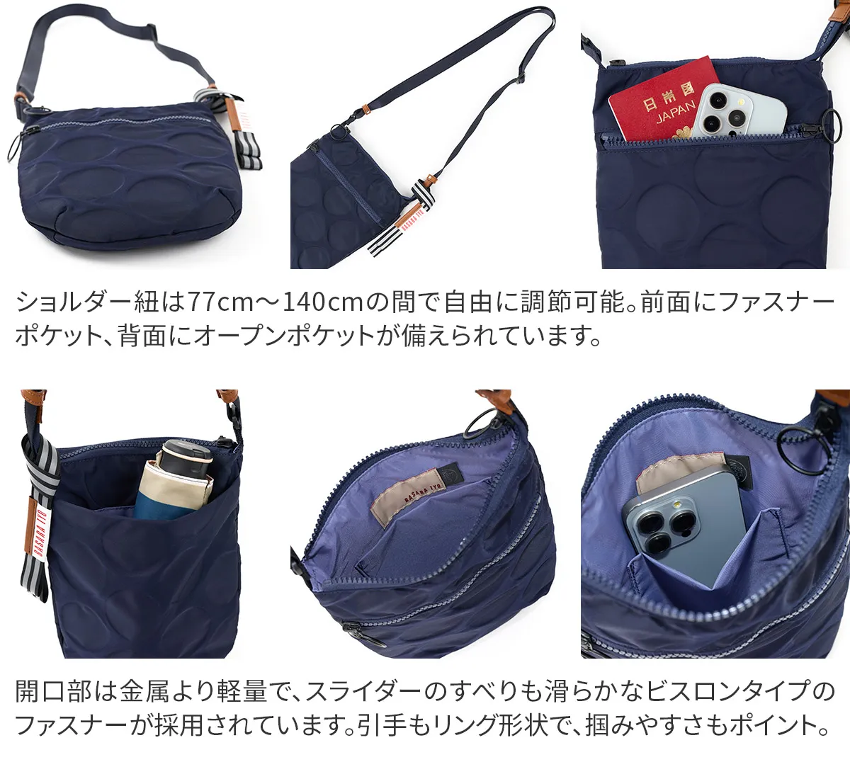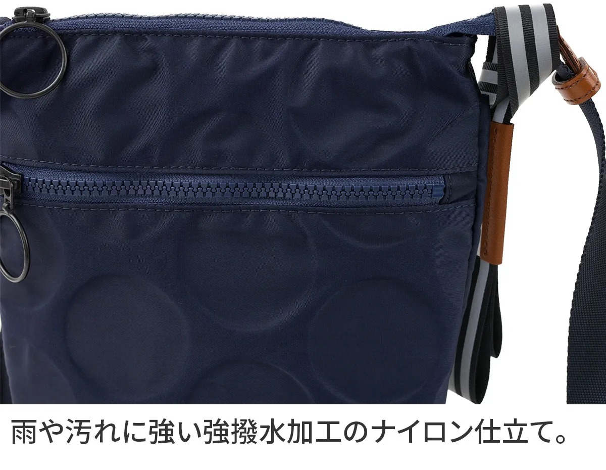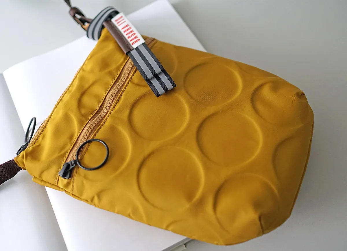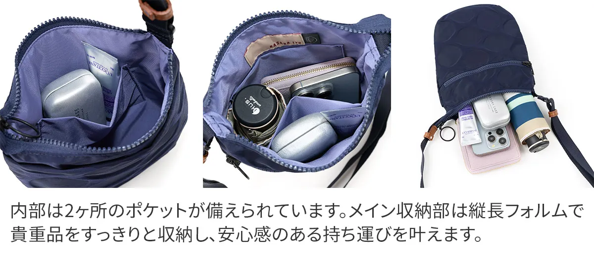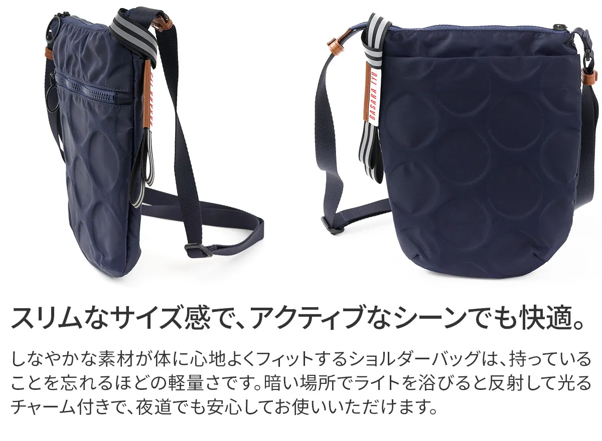 日本が誇る織物の名産地、福井県で丁寧に作られた BASARA TYO オリジナルナイロン。何度も試行錯誤して作られた生地はさらっとした肌触りも魅力。強撥水加工を施しており、雨でも安心してお使い頂けます。付属の牛革も日本産を使用、日本で職人さんが縫製したこだわりのMADE IN JAPANシリーズです。 軽量で雨や汚れに強いナイロン素材を使用し、スリムなサイズ感と相まってアクティブなシーンにもぴったりなショルダーバッグ。収納部は長財布が縦に収まるサイズで、お出かけの必需品をコンパクトにまとめて持ち運べます。暗い場所ではライトに反射して光るチャーム付きで、夜道でも安心してご使用いただけます。