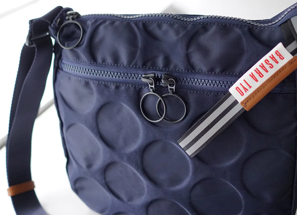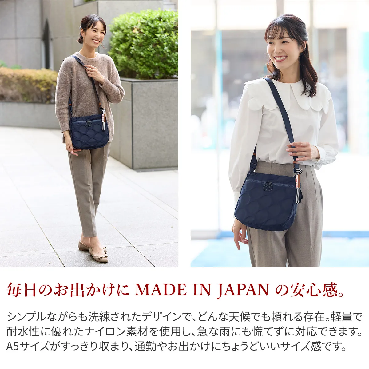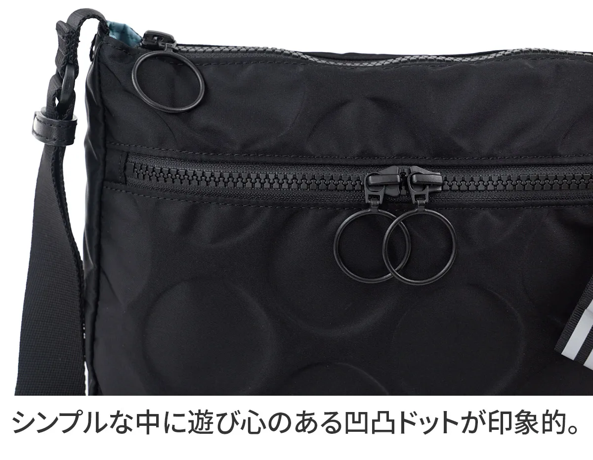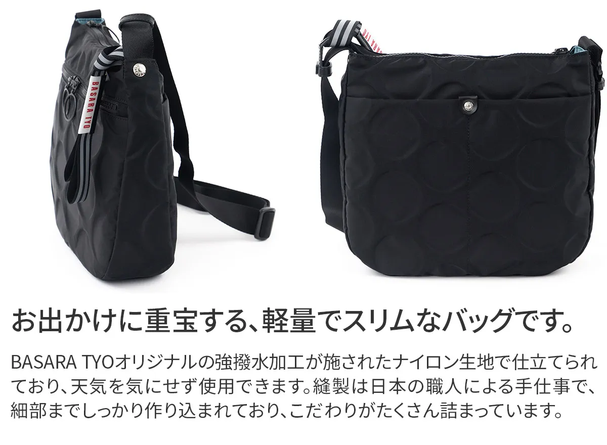 日本が誇る織物の名産地、福井県で丁寧に作られた BASARA TYO オリジナルナイロン。何度も試行錯誤して作られた生地はさらっとした肌触りも魅力。強撥水加工を施しており、雨でも安心してお使い頂けます。付属の牛革も日本産を使用、日本で職人さんが縫製したこだわりのMADE IN JAPANシリーズです。 光の加減で豊かな表情を見せる、ドットの型押し模様が印象的なショルダーバッグ。A5サイズの手帳やノート、お財布などの貴重品がすっきり入り、デイリーユースしやすい便利なサイズ感です。ポケットもしっかりと設けられているので、小物類も定位置に仕分けができる嬉しい仕様となっています。