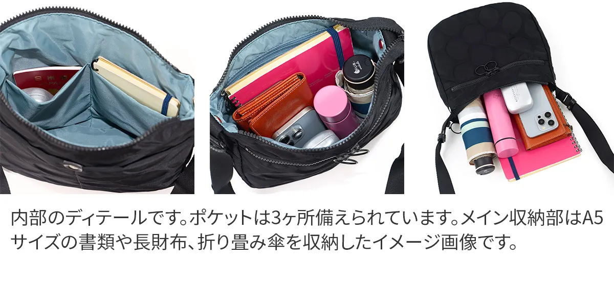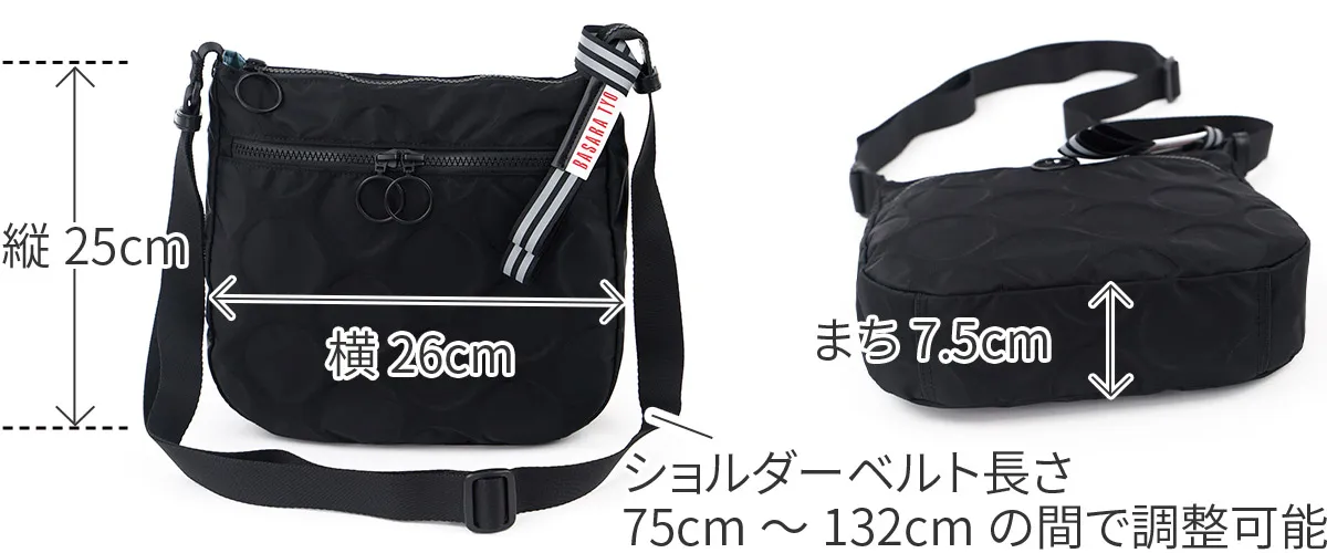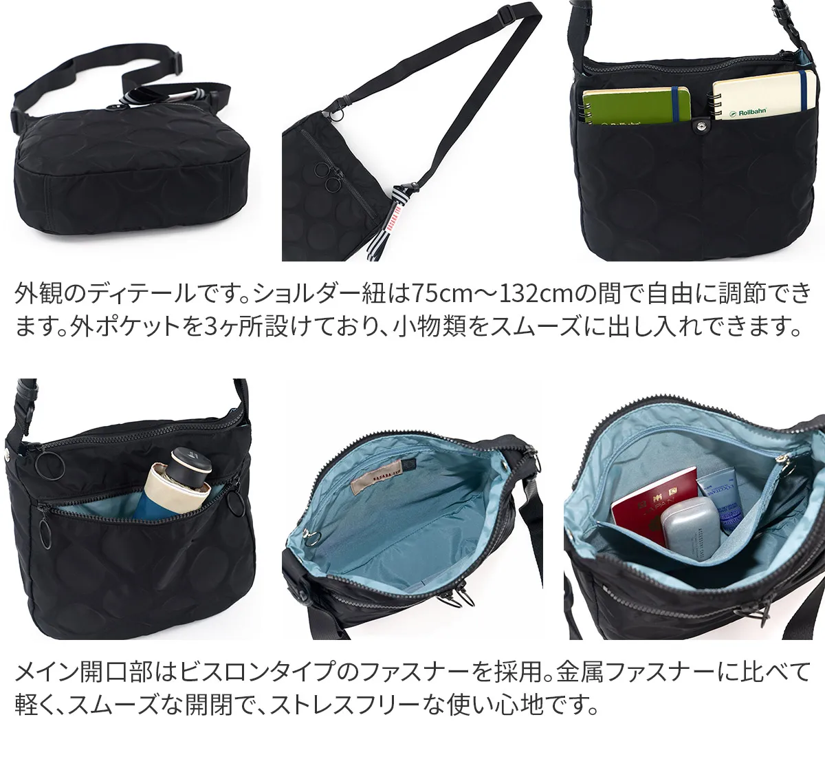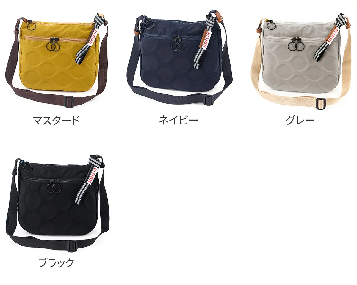 日本が誇る織物の名産地、福井県で丁寧に作られた BASARA TYO オリジナルナイロン。何度も試行錯誤して作られた生地はさらっとした肌触りも魅力。強撥水加工を施しており、雨でも安心してお使い頂けます。付属の牛革も日本産を使用、日本で職人さんが縫製したこだわりのMADE IN JAPANシリーズです。 光の加減で豊かな表情を見せる、ドットの型押し模様が印象的なショルダーバッグ。A5サイズの手帳やノート、お財布などの貴重品がすっきり入り、デイリーユースしやすい便利なサイズ感です。ポケットもしっかりと設けられているので、小物類も定位置に仕分けができる嬉しい仕様となっています。
