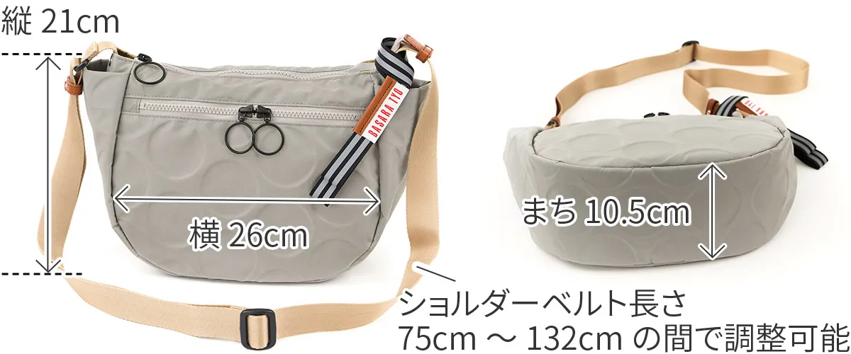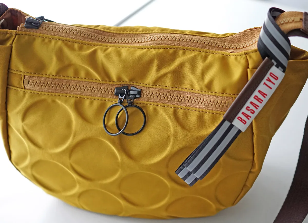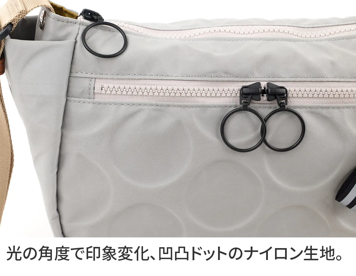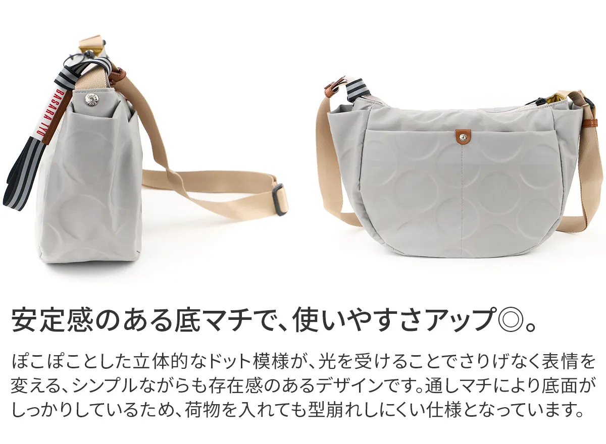 日本が誇る織物の名産地、福井県で丁寧に作られた BASARA TYO オリジナルナイロン。何度も試行錯誤して作られた生地はさらっとした肌触りも魅力。強撥水加工を施しており、雨でも安心してお使い頂けます。付属の牛革も日本産を使用、日本で職人さんが縫製したこだわりのMADE IN JAPANシリーズです。 ドットの型押し模様とリングが施された半月型のショルダーバッグ。雨や汚れに強いナイロン素材で仕立てており、天気を気にせず気兼ねなくお使いいただけます。上に行くほどスリムなマチは心地良く身体にフィットし、軽量なので長時間のご使用でも疲れにくい設計です。暗い所でライトを浴びると反射して光るチャームが付いており、日中はバッグのアクセントとして、夜は反射板として活躍します。