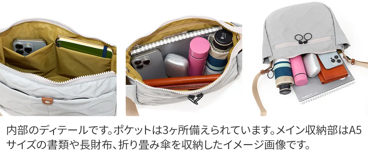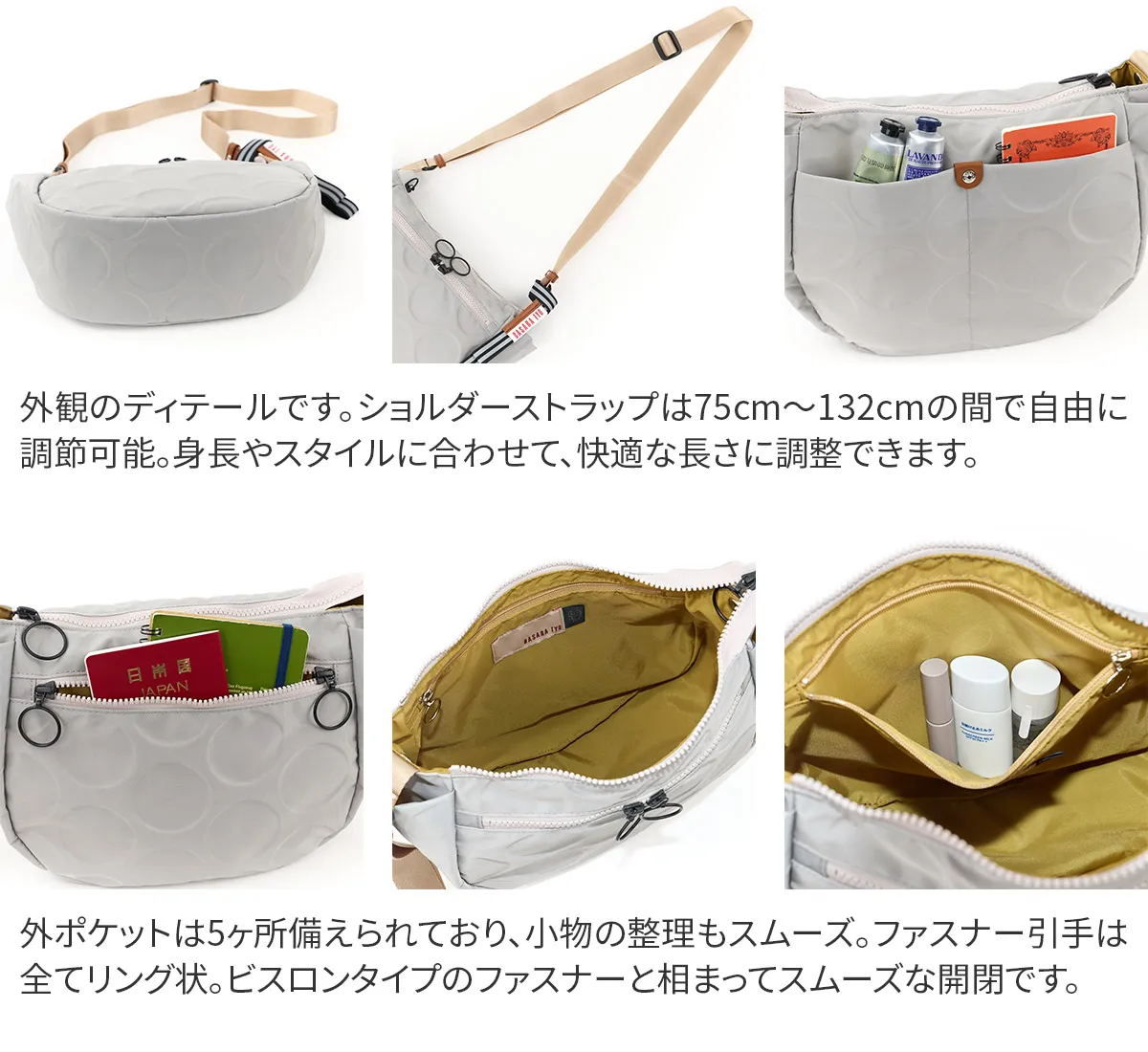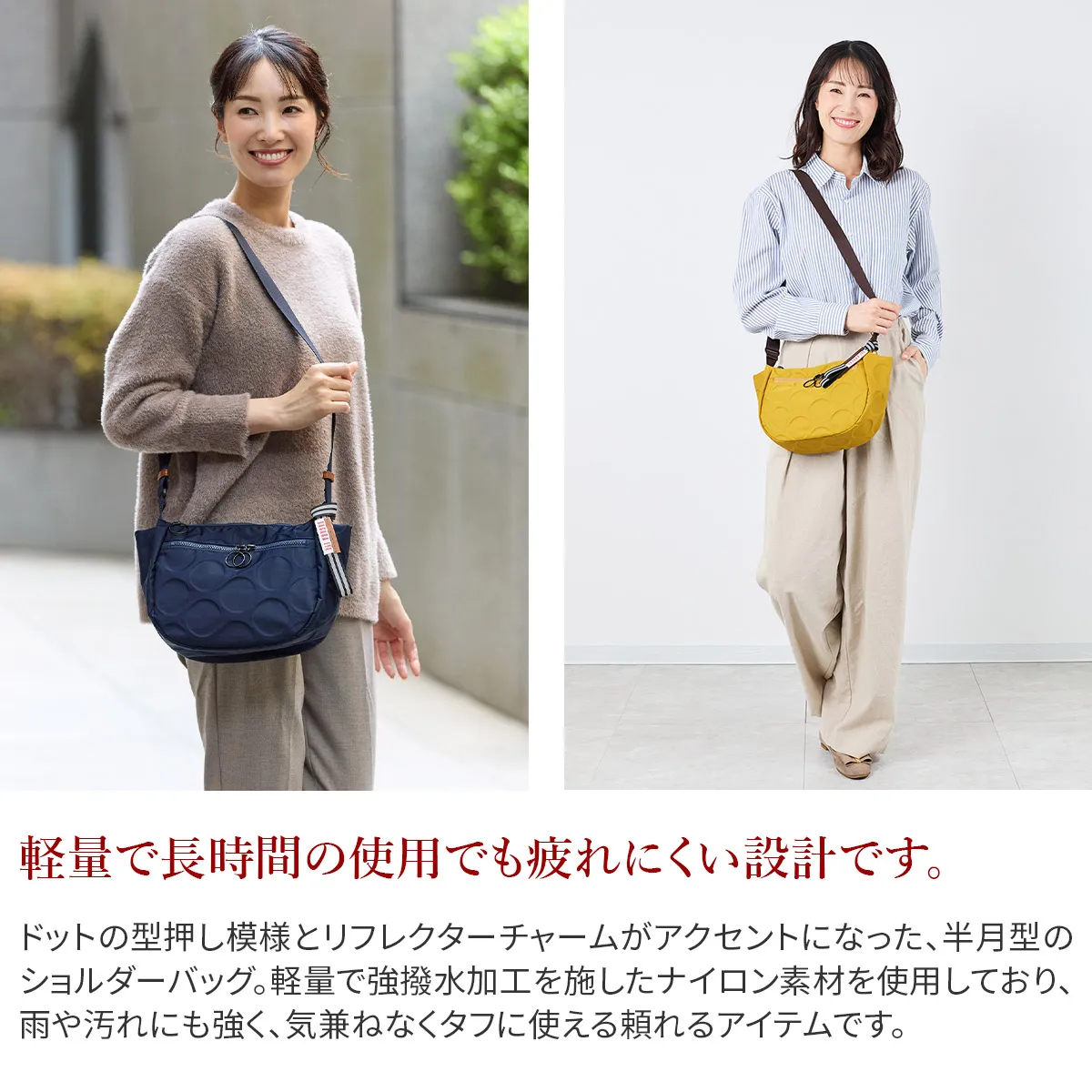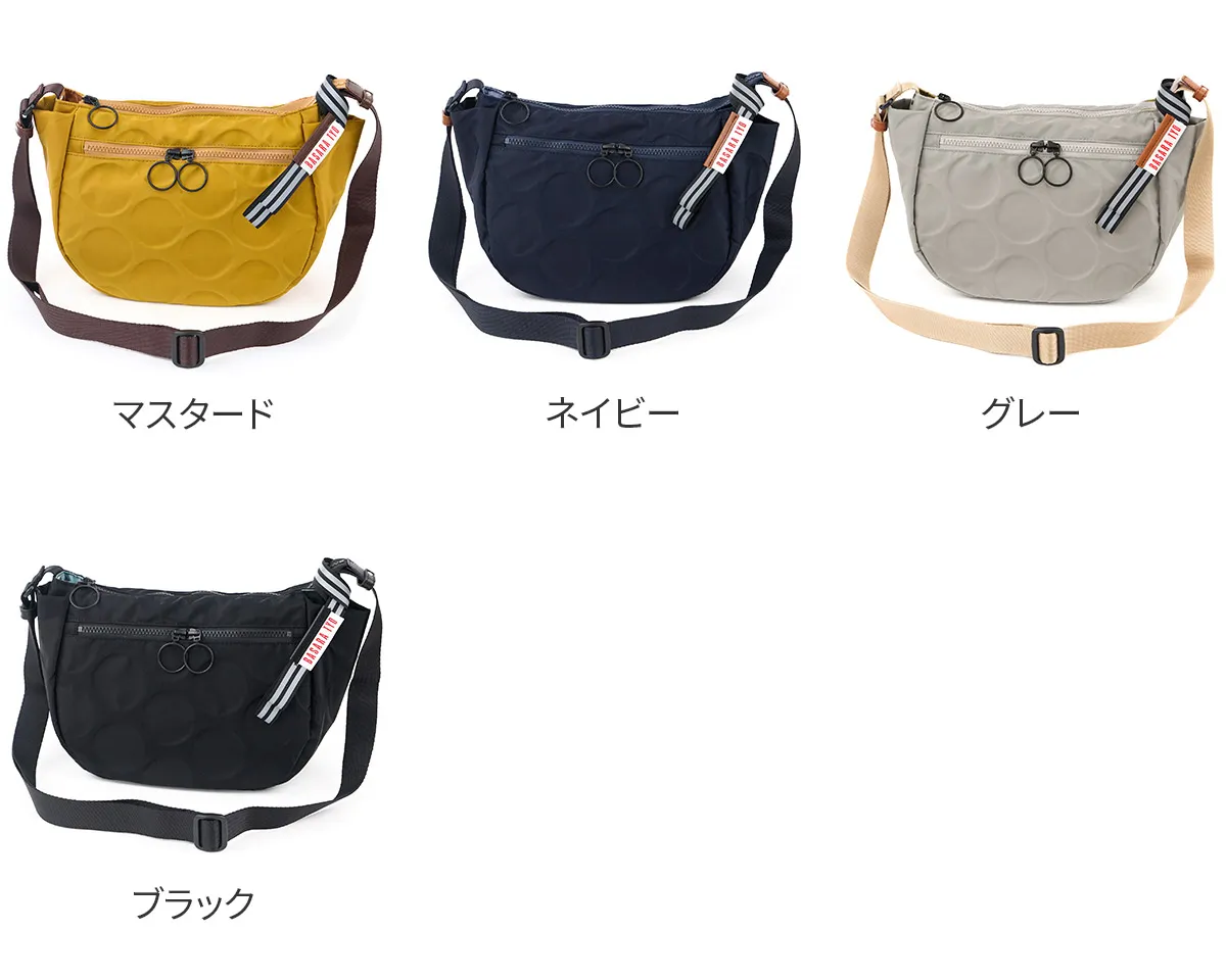 日本が誇る織物の名産地、福井県で丁寧に作られた BASARA TYO オリジナルナイロン。何度も試行錯誤して作られた生地はさらっとした肌触りも魅力。強撥水加工を施しており、雨でも安心してお使い頂けます。付属の牛革も日本産を使用、日本で職人さんが縫製したこだわりのMADE IN JAPANシリーズです。 ドットの型押し模様とリングが施された半月型のショルダーバッグ。雨や汚れに強いナイロン素材で仕立てており、天気を気にせず気兼ねなくお使いいただけます。上に行くほどスリムなマチは心地良く身体にフィットし、軽量なので長時間のご使用でも疲れにくい設計です。暗い所でライトを浴びると反射して光るチャームが付いており、日中はバッグのアクセントとして、夜は反射板として活躍します。