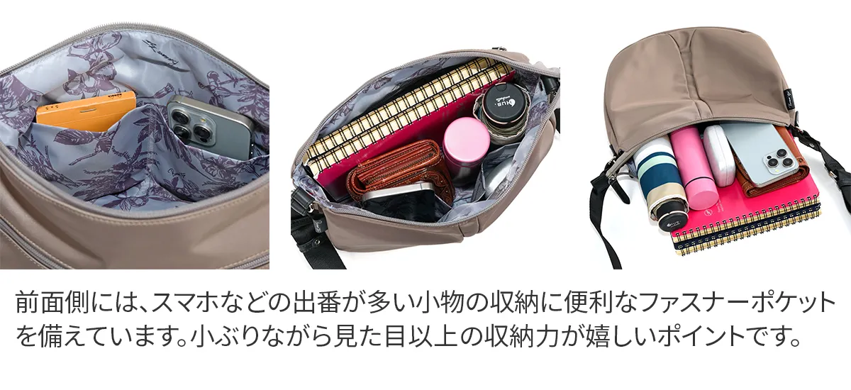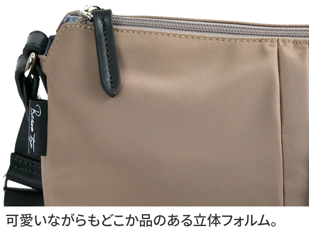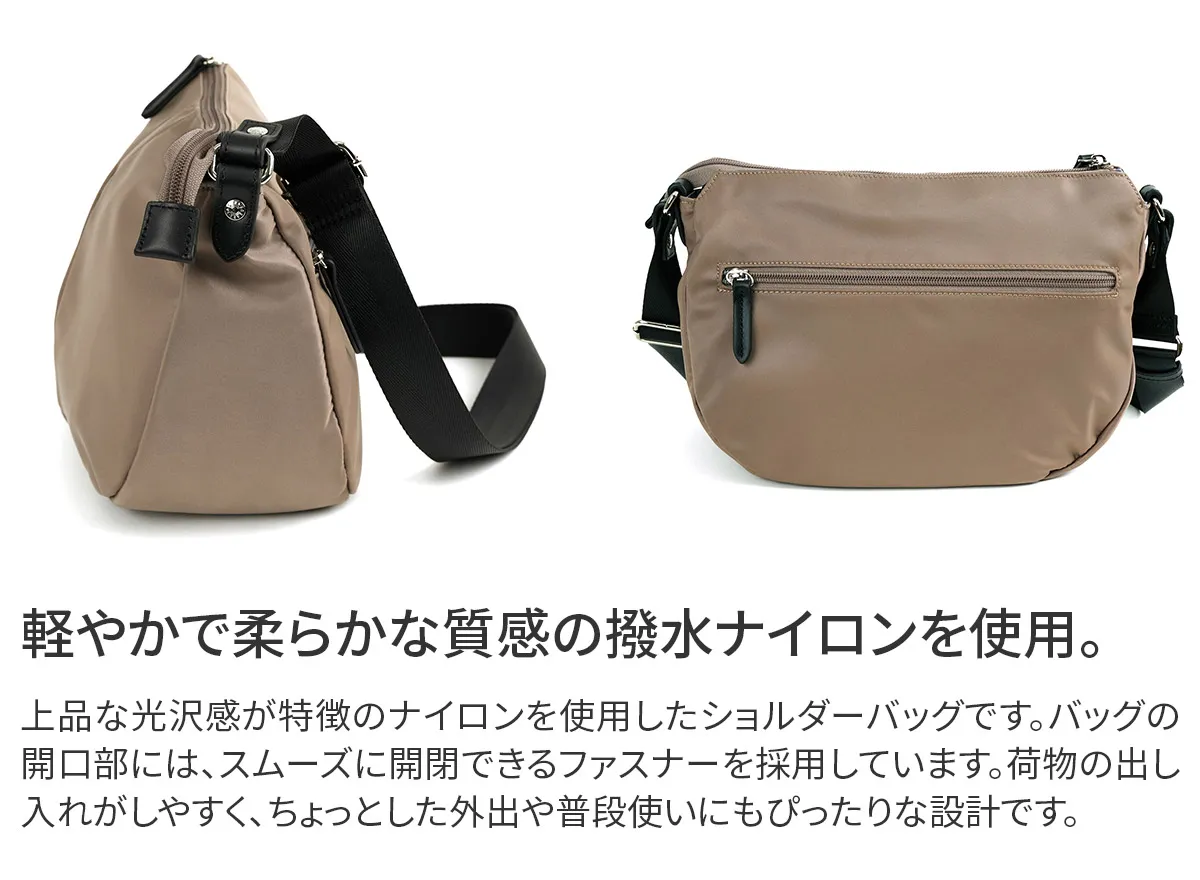 丸みのあるフォルムが魅力の、機能性に優れたデイリーバッグシリーズ。 雨の日でも安心な撥水ナイロンを使用。 持ったときに女性が美しく見えるデザインに仕立てられています。 《素材の特性》 デュケムの外面に使用している生地は撥水生地です。非常に強い撥水性がありますが完全防水の仕様ではありません。 撥水加工は使用過程で薄れていくものです。防水とは異なります。 撥水スプレーなどをご使用になる場合は、目立たない部分で試してからご使用下さい。革など色落ちする恐れがあります。十分にご注意下さい。 ※牛革は撥水仕様ではありません。ファスナーは止水ファスナーではありません。 軽量なナイロンを使用した、発色の良さと上品な艶感が魅力のショルダーバッグ。 長財布を横にしても余裕がある、使いやすいサイズ感です。 底マチをしっかり設け、上部に向かいスリムなフォルムが心地よく体にフィット。 裏地にはブランドオリジナルのボタニカル柄を使い、コントラストを楽しめます。 革の組み合わせが上質感を引き立て、様々なコーデに馴染むアイテムです。