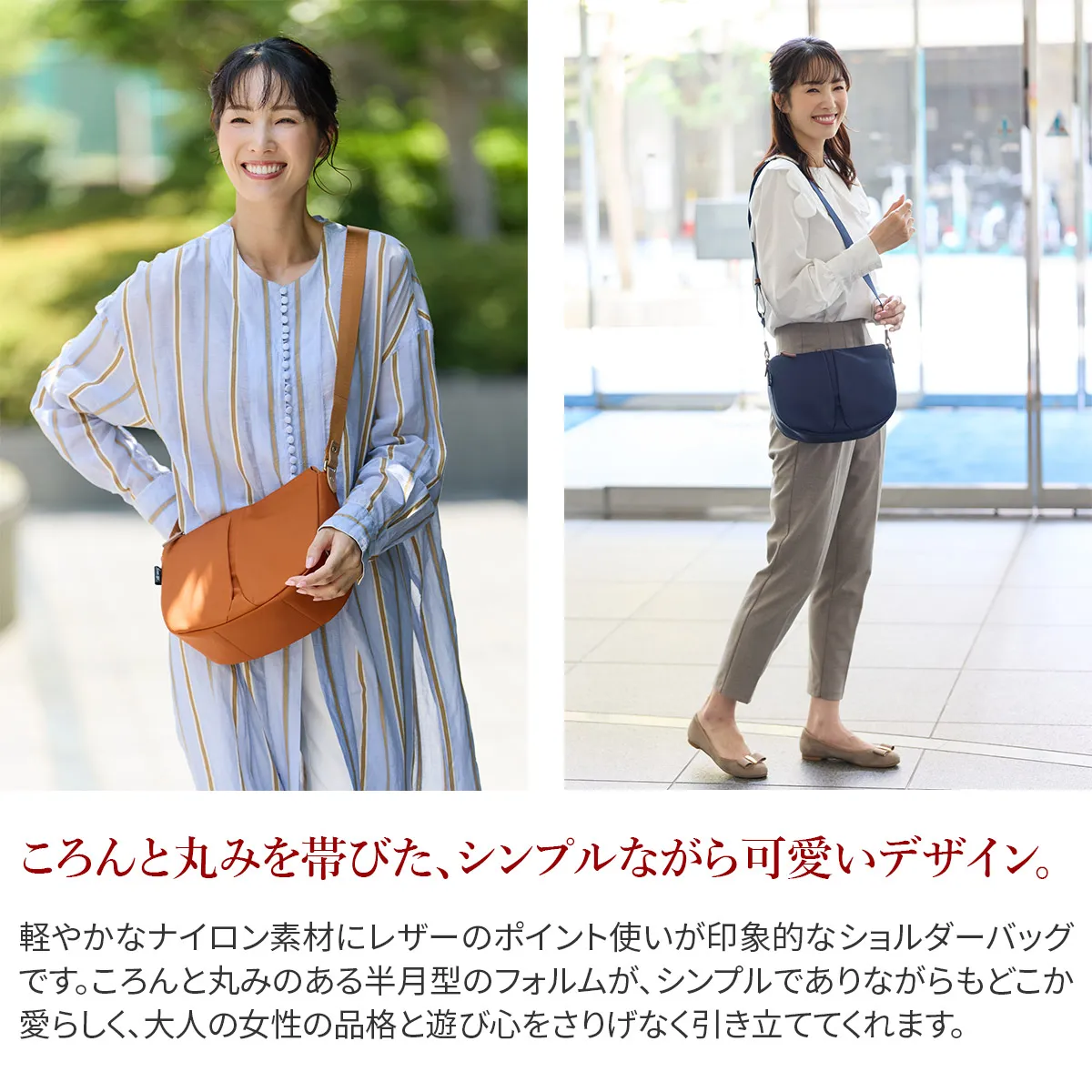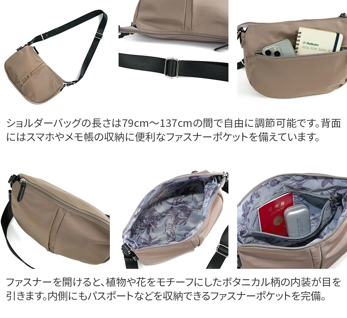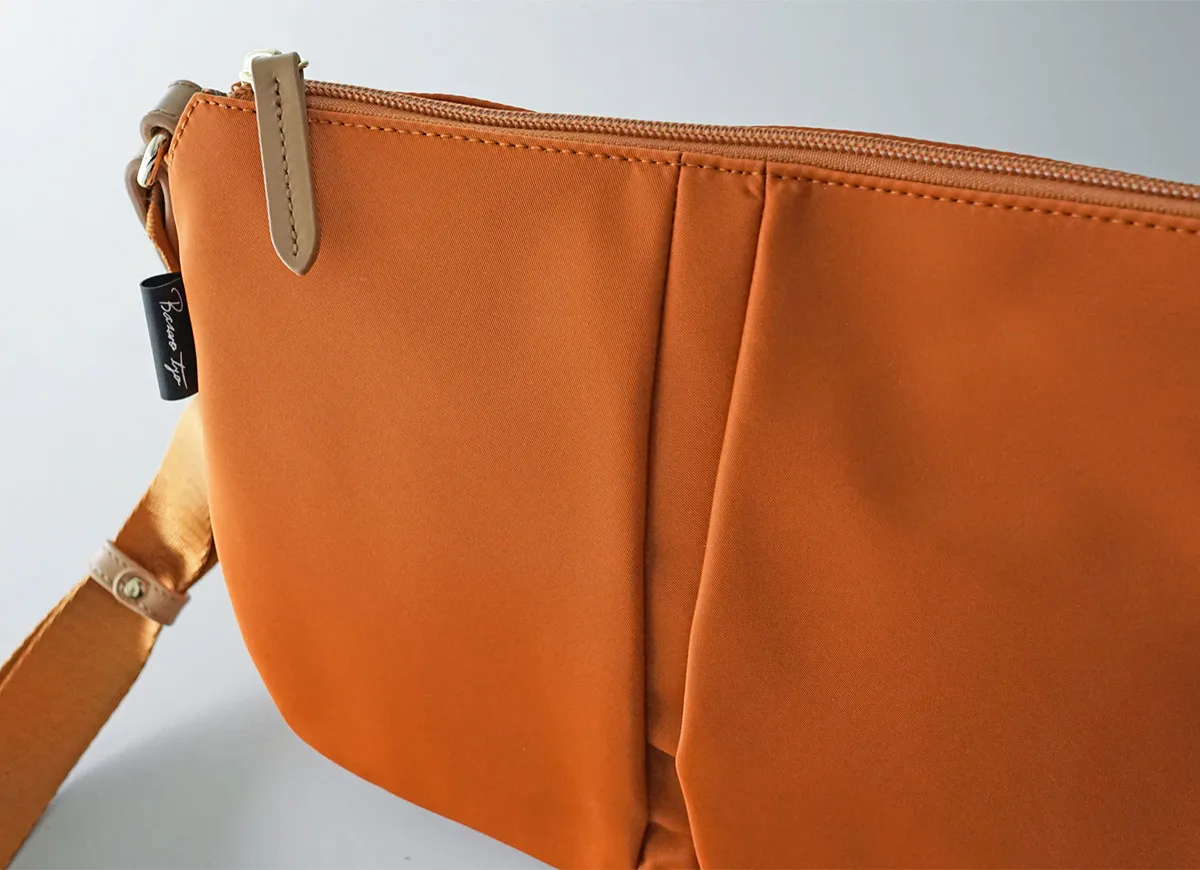 丸みのあるフォルムが魅力の、機能性に優れたデイリーバッグシリーズ。 雨の日でも安心な撥水ナイロンを使用。 持ったときに女性が美しく見えるデザインに仕立てられています。 《素材の特性》 デュケムの外面に使用している生地は撥水生地です。非常に強い撥水性がありますが完全防水の仕様ではありません。 撥水加工は使用過程で薄れていくものです。防水とは異なります。 撥水スプレーなどをご使用になる場合は、目立たない部分で試してからご使用下さい。革など色落ちする恐れがあります。十分にご注意下さい。 ※牛革は撥水仕様ではありません。ファスナーは止水ファスナーではありません。 軽量なナイロンを使用した、発色の良さと上品な艶感が魅力のショルダーバッグ。 長財布を横にしても余裕がある、使いやすいサイズ感です。 底マチをしっかり設け、上部に向かいスリムなフォルムが心地よく体にフィット。 裏地にはブランドオリジナルのボタニカル柄を使い、コントラストを楽しめます。 革の組み合わせが上質感を引き立て、様々なコーデに馴染むアイテムです。