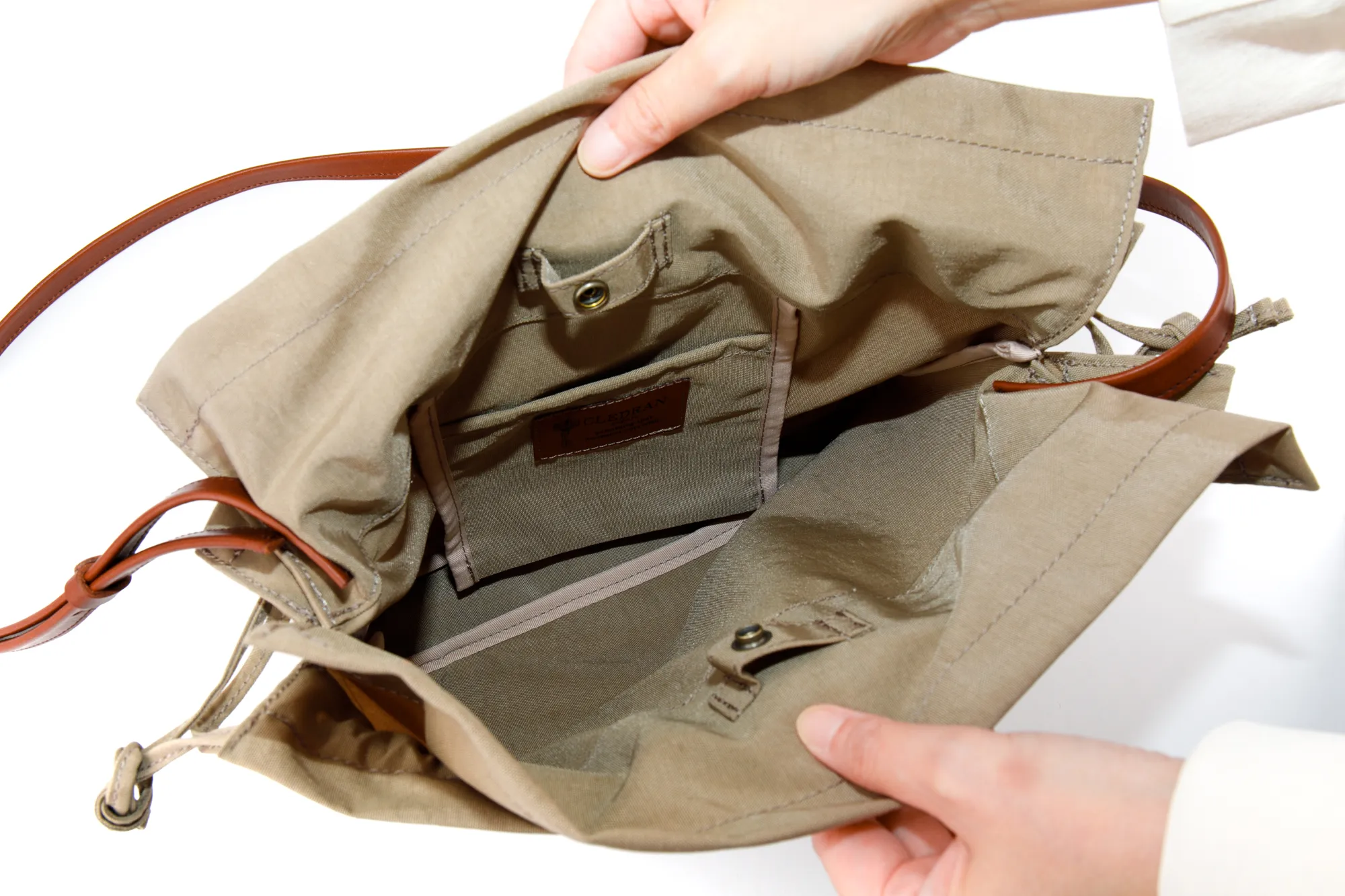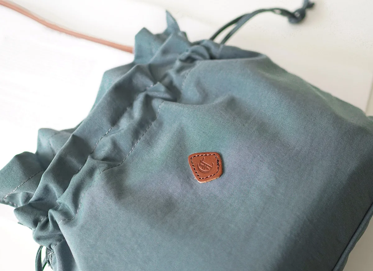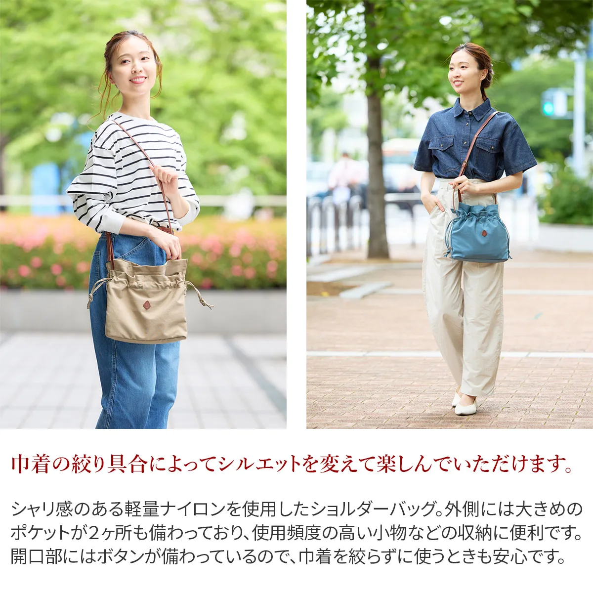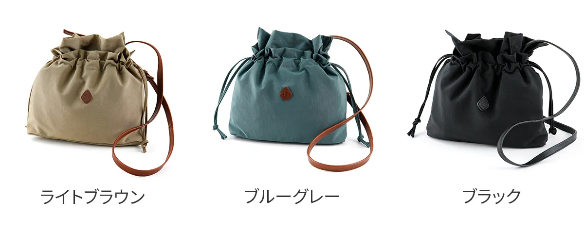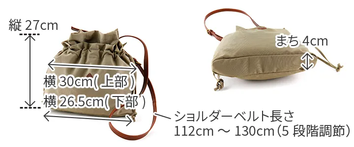 開口部はスナップボタン式ですが、巾着の様に口を絞れるひも付きタイプなので、 荷物をしっかり隠すことができます。また、荷物の大きさやその日の気分によって、 絞り具合を変えてデザインを楽しむことができます。 バッグの外側には、本体と同じ幅があるオープンポケットが備えられているので 使用頻度の高い小物などを収納することが出来ます。