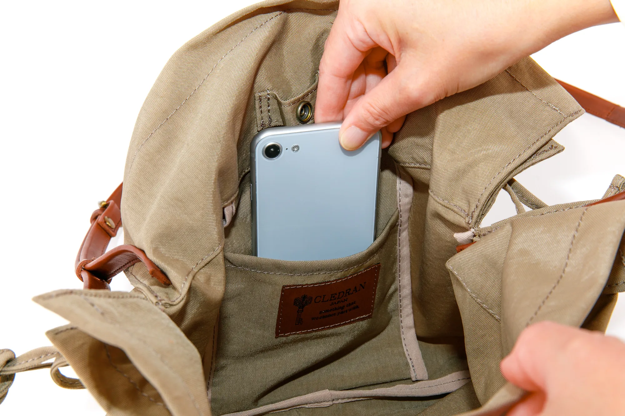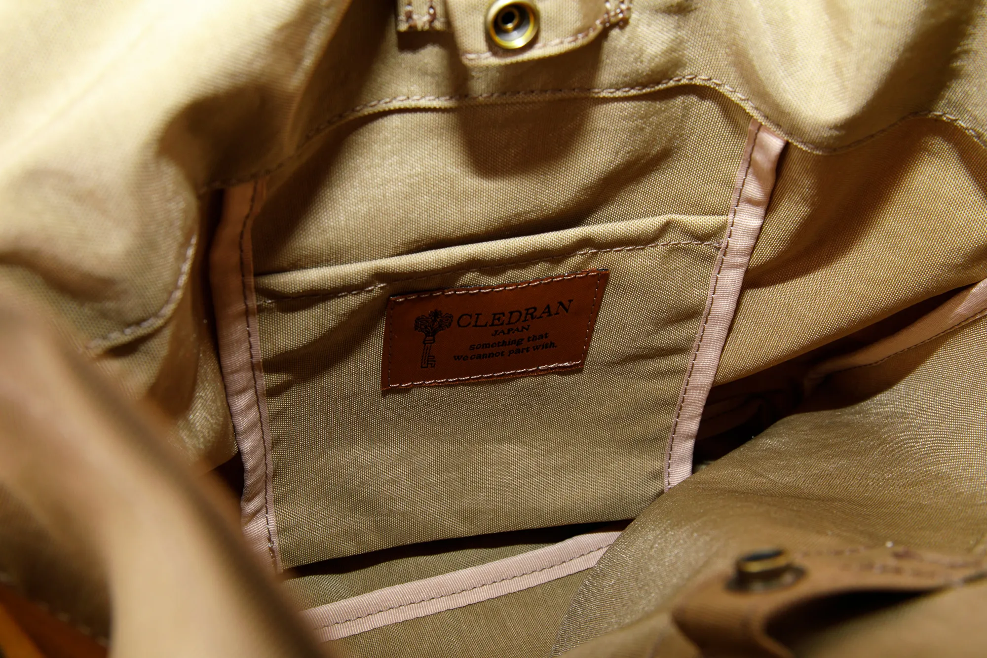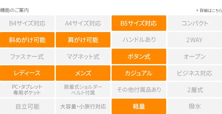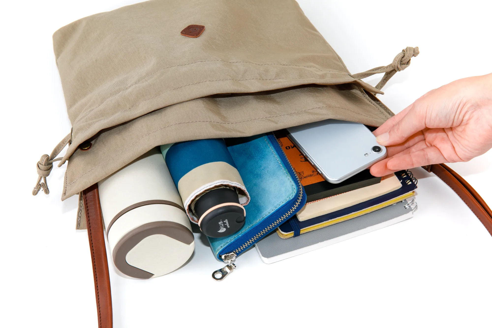開口部はスナップボタン式ですが、巾着の様に口を絞れるひも付きタイプなので、 荷物をしっかり隠すことができます。また、荷物の大きさやその日の気分によって、 絞り具合を変えてデザインを楽しむことができます。 バッグの外側には、本体と同じ幅があるオープンポケットが備えられているので 使用頻度の高い小物などを収納することが出来ます。