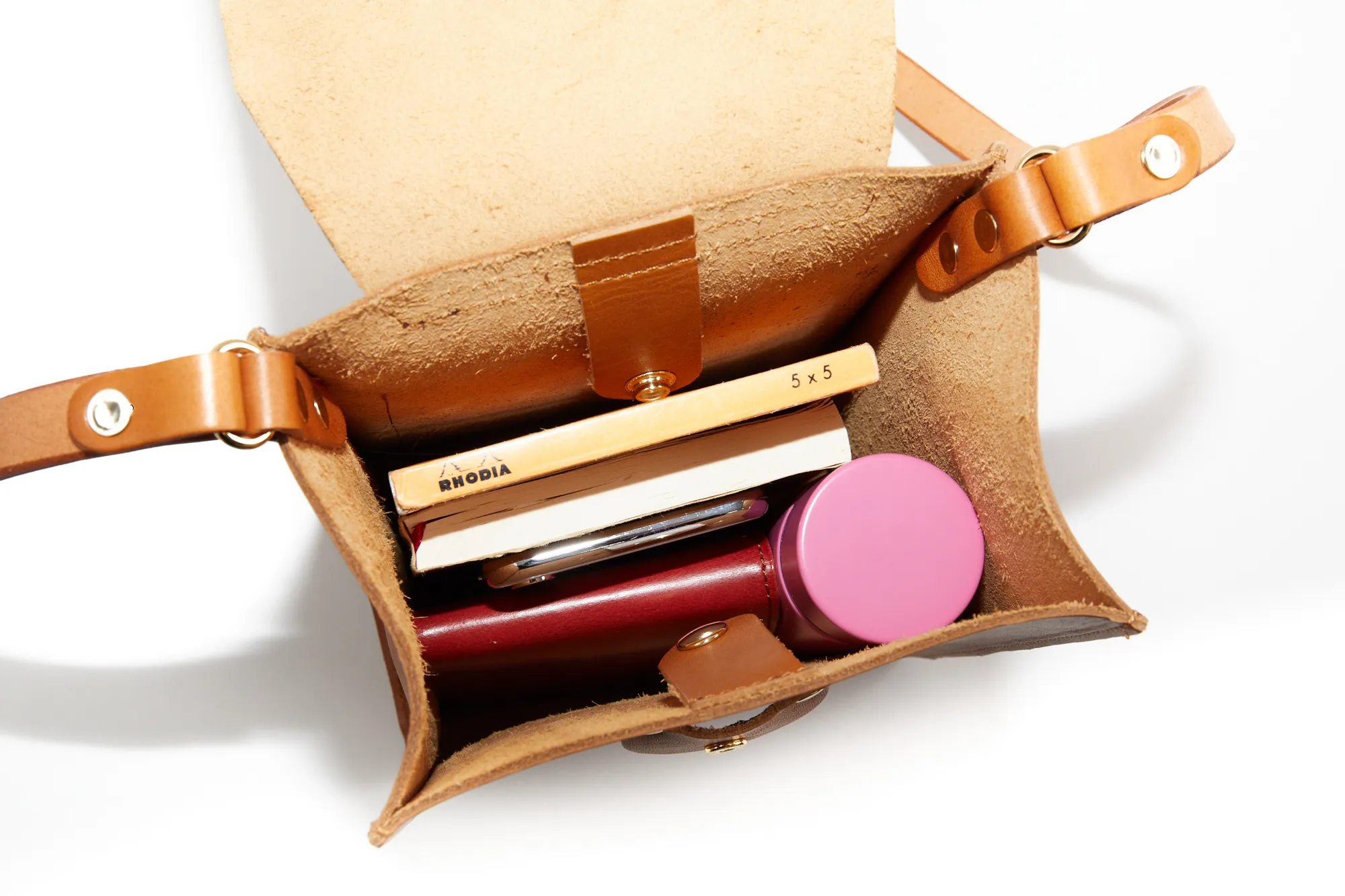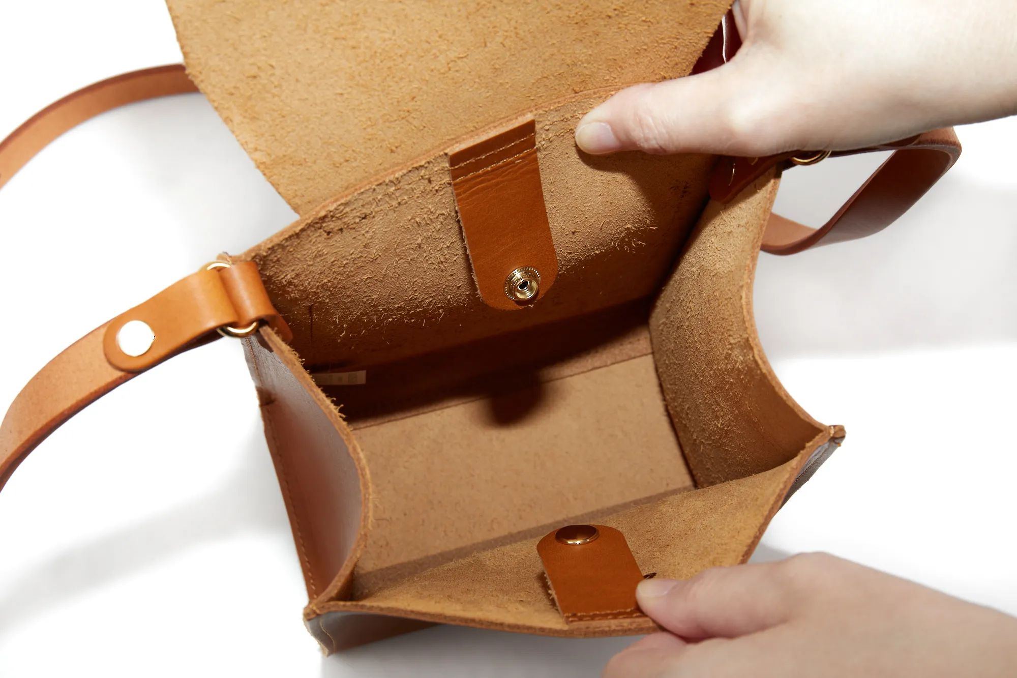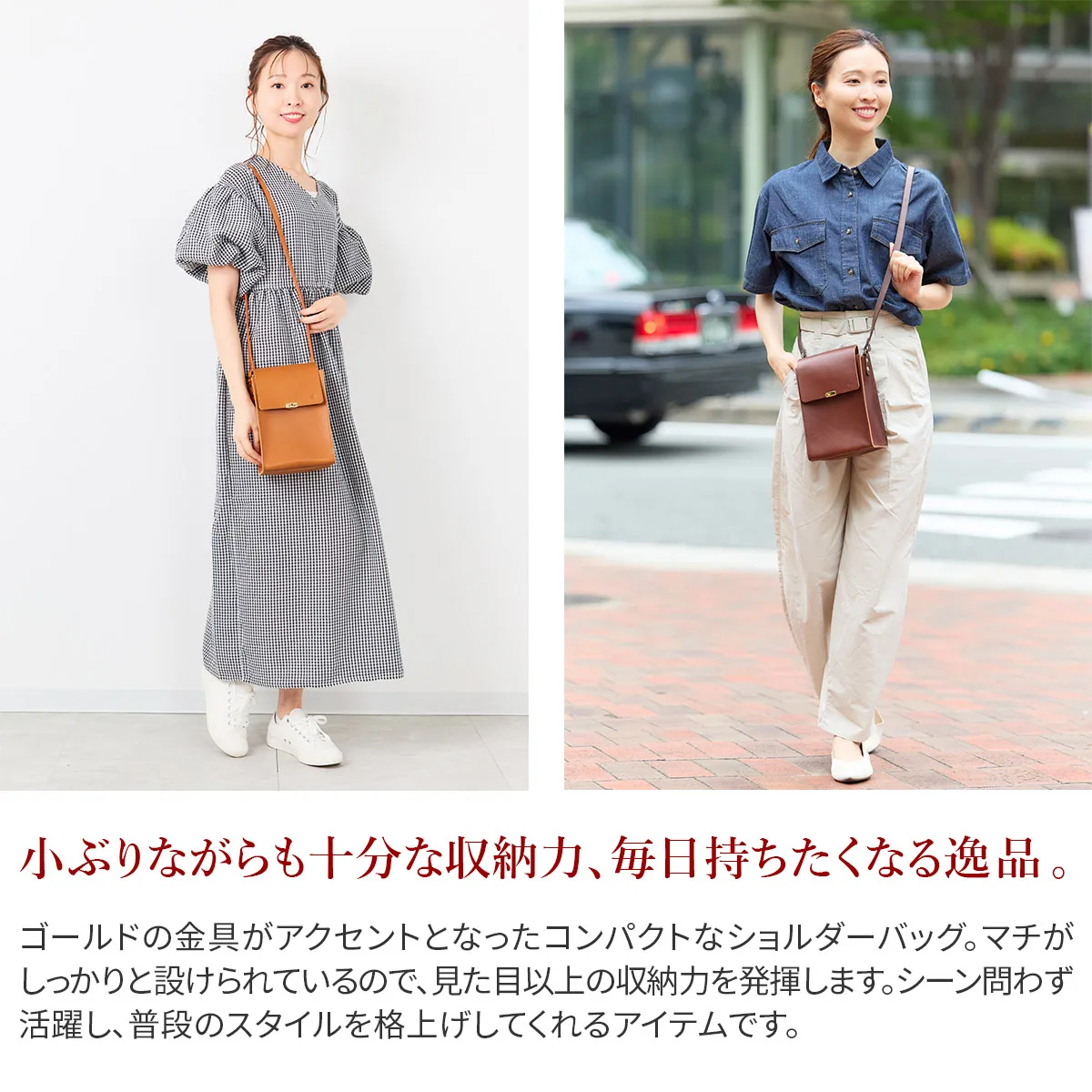 洗練されたスクエアフォルムにゴールド金具がアクセントになったフラップショルダーバッグです。 小ぶりながらマチを広めに設けており、見た目以上の収納力が嬉しいポイントです。 ショルダーベルトは102cm~124cmの間で調節が可能で、スタイリングに合わせて持ち方を自在に楽しめるのも魅力。 背面には定期入れやカード類が入るオープンポケットが備わっています。 ワンマイルなお出かけから旅先など、シーン問わず活躍してくれるアイテムです。