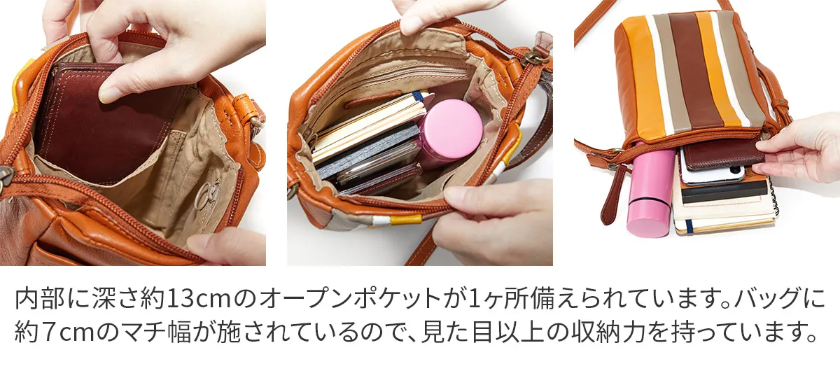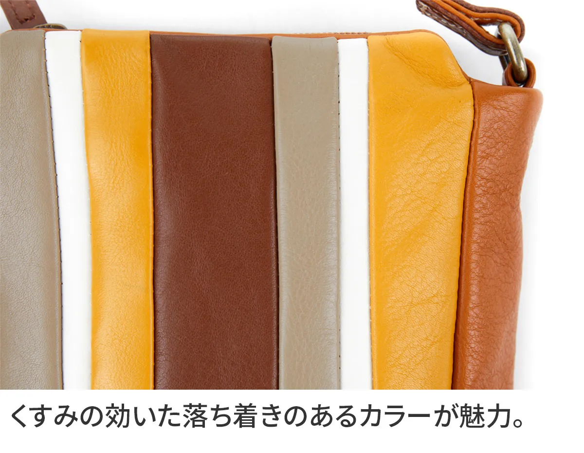 程良いクラフト感がポイントのカラフルなパッチワークシリーズ。可愛すぎないカラーリングが特徴です。持つだけでコーディネートのアクセントになります。 ソフトで手触りの良いレザーを使用した、ストライプ柄のパッチワークが目を惹くアイテム。マットな質感、派手になりすぎないカラー配色で大人カジュアルにお持ちいただけます。ポケットは計3ヶ所備えられており、底マチが広めで見た目以上の収納力を誇ります。普段のコーデに遊び心をプラスしてくれるアイテムです。