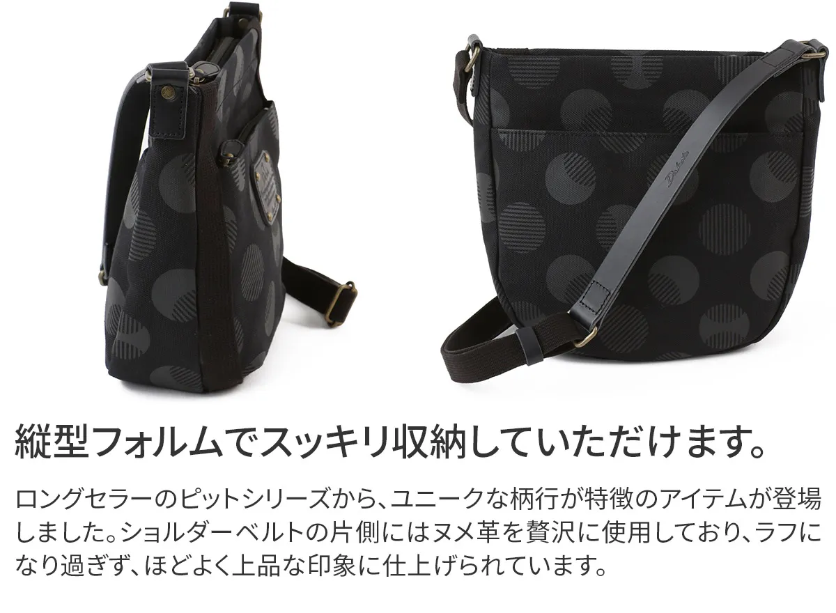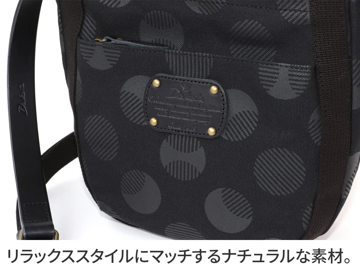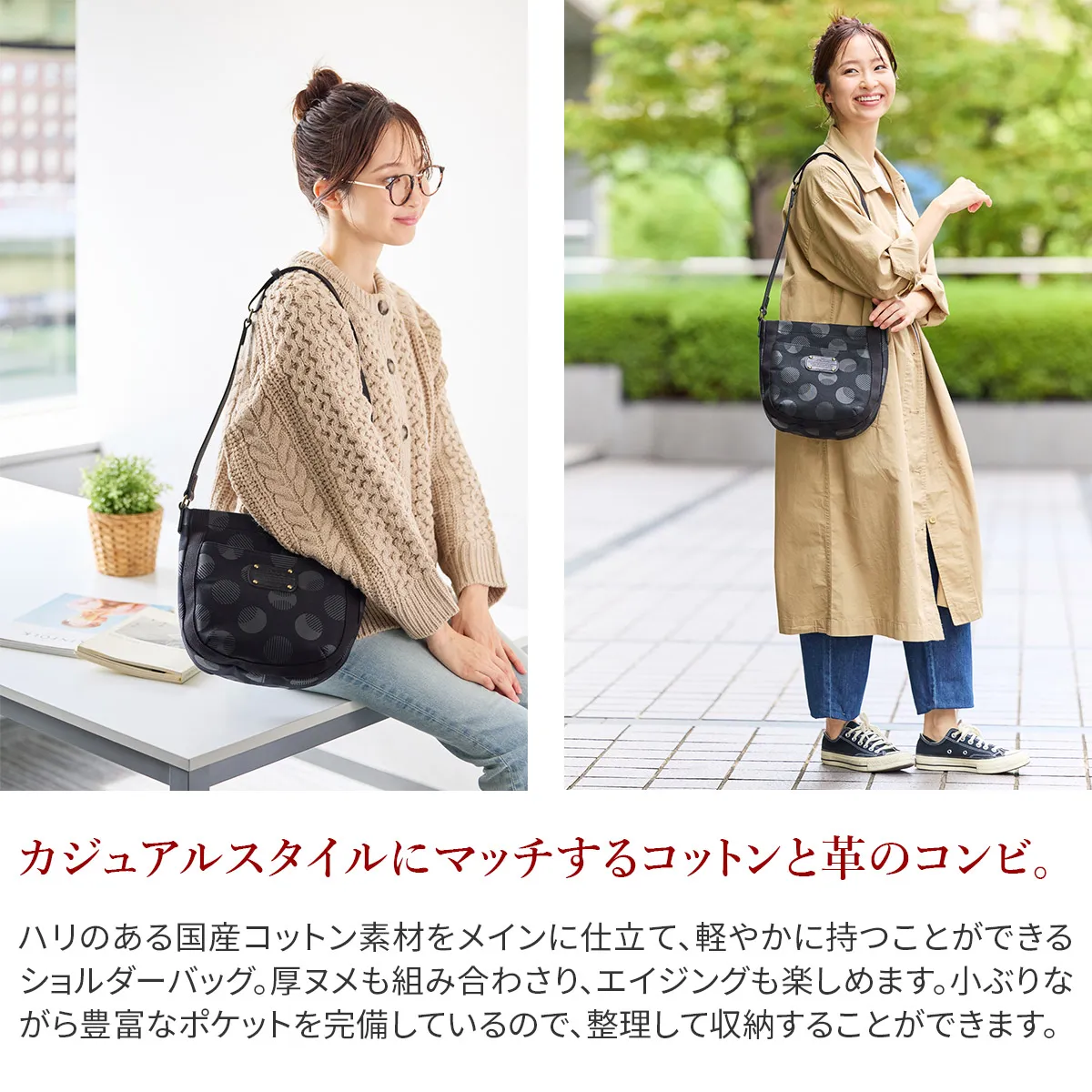 ハリ感のある素材を使用したシリーズ。 デザインのワンポイントに厚ヌメを使用する事でカジュアル感を表現しました。 ドットや北欧風の優しい柄行きがカジュアルスタイルにマッチするショルダーバッグです。軽量で丈夫な帆布をメインに使用しており、気軽にデイリー使いしていただけます。アクセントの厚ヌメは使う程しなやかに変化し、エイジングを楽しめます。