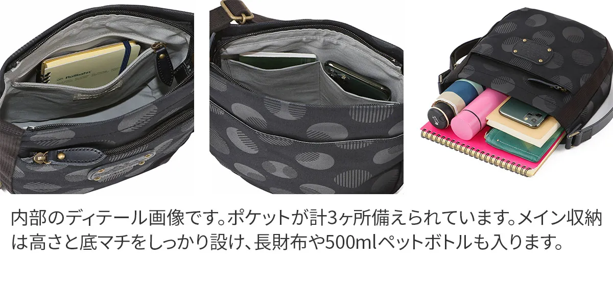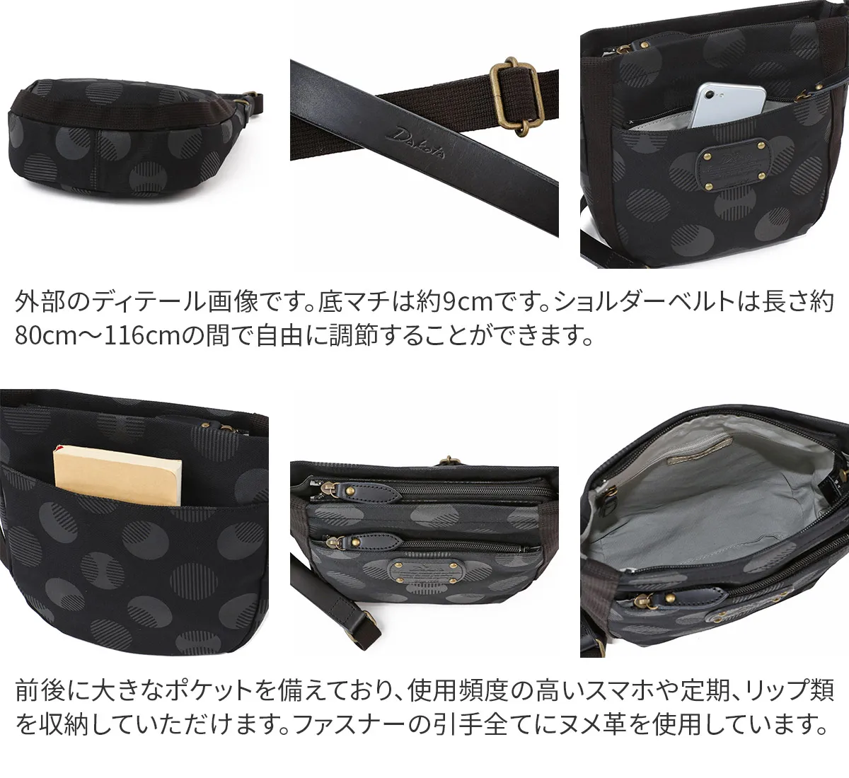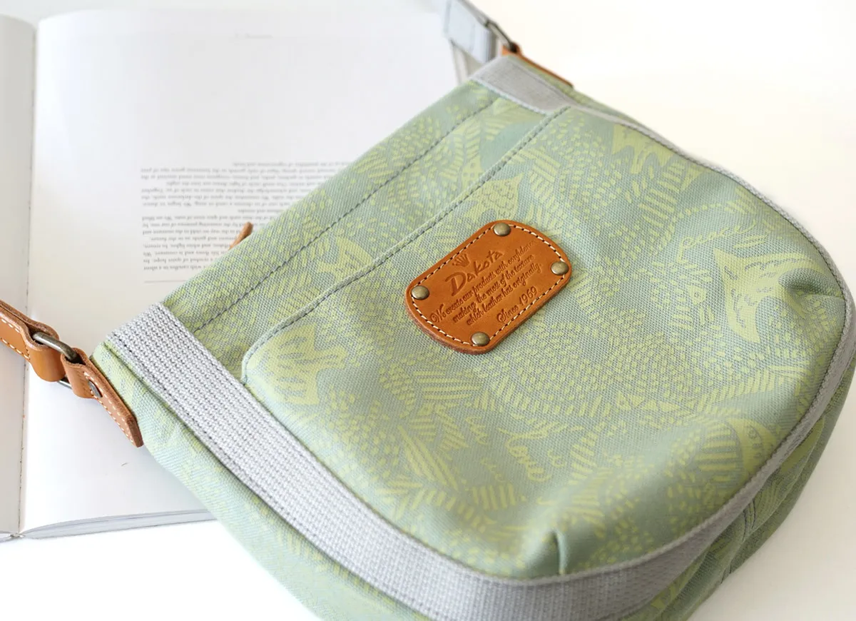 ハリ感のある素材を使用したシリーズ。 デザインのワンポイントに厚ヌメを使用する事でカジュアル感を表現しました。 ドットや北欧風の優しい柄行きがカジュアルスタイルにマッチするショルダーバッグです。軽量で丈夫な帆布をメインに使用しており、気軽にデイリー使いしていただけます。アクセントの厚ヌメは使う程しなやかに変化し、エイジングを楽しめます。