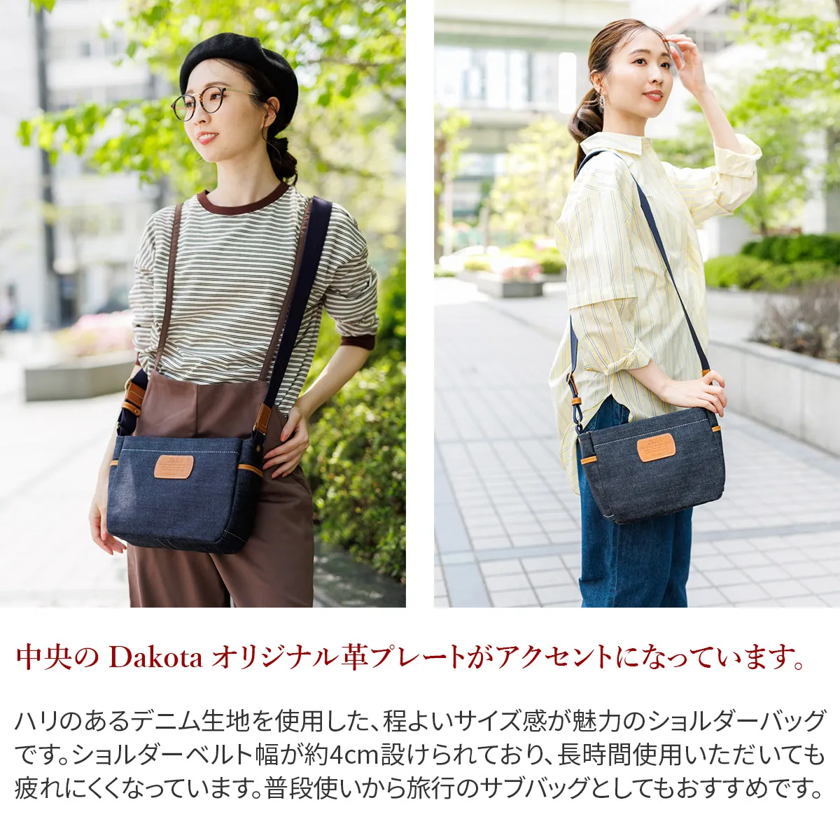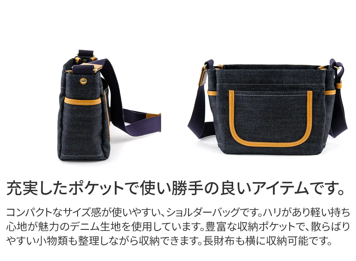 一枚仕立てでカジュアルに使えるデイリーユースシリーズ。しっかりとした厚みのある4号帆布でも裏地がない分軽量に仕上がっています。ポケットを多く配置した使い易さもお勧めのシリーズです。 ハリのあるデニム生地を使用した、程よいサイズ感が魅力のショルダーバッグです。ショルダーベルト幅が約4cm設けられており、長時間使用いただいても疲れにくくなっています。普段使いから旅行のサブバッグとしてもおすすめです。