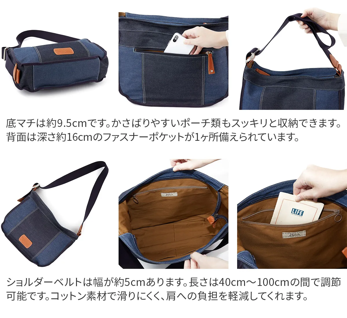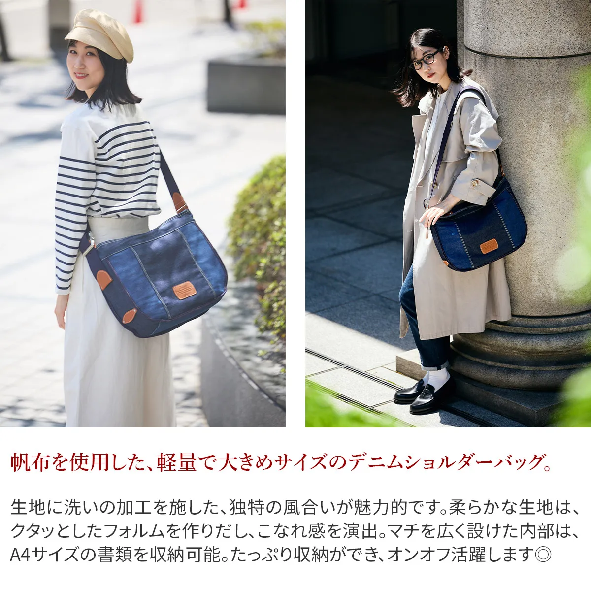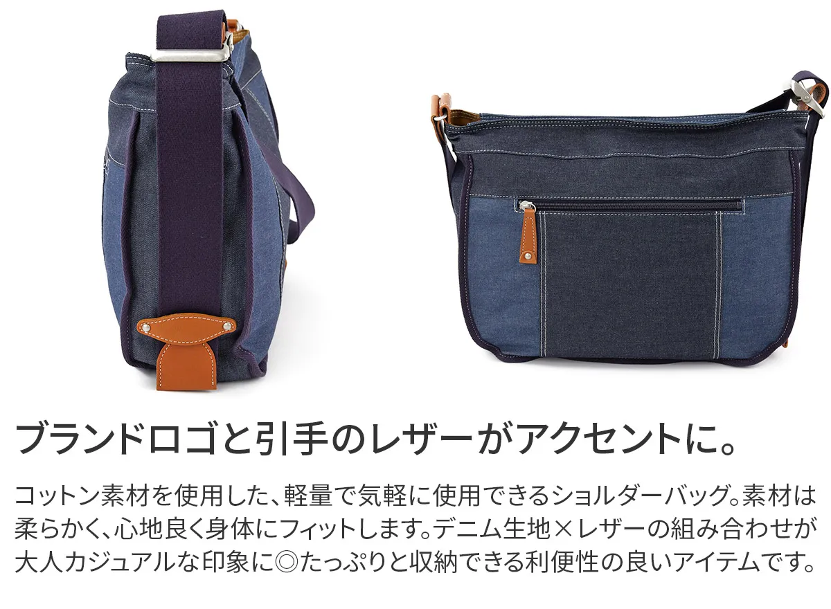 ざっくりとラフに使えるショルダーバッグシリーズ。洗いを施した風合いのある帆布と人気のデニムをカラーコンビにしました。ポイントでもあるバックル使いでワンショルダーから斜め掛けまでジャストな長さで合わせていただけます。 濃淡の異なるデニムをパッチワークしたデザインが特徴です。A4サイズ対応で、ポケットは計5ヶ所備えられており、大容量に収納が可能です。太めのショルダー紐で肩への当たりが優しく、安定感があります。使い込むほどに、風合いが変化するのも魅力です。