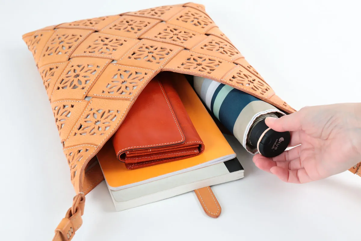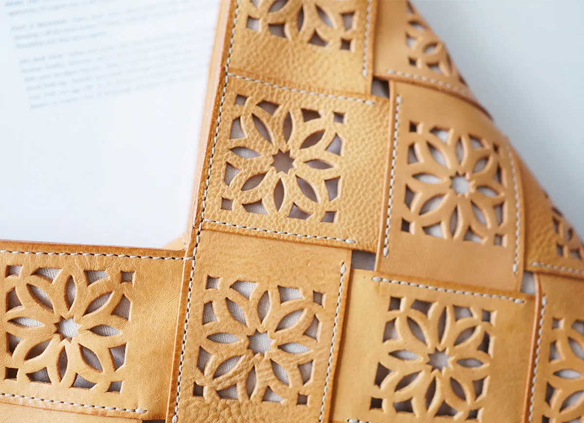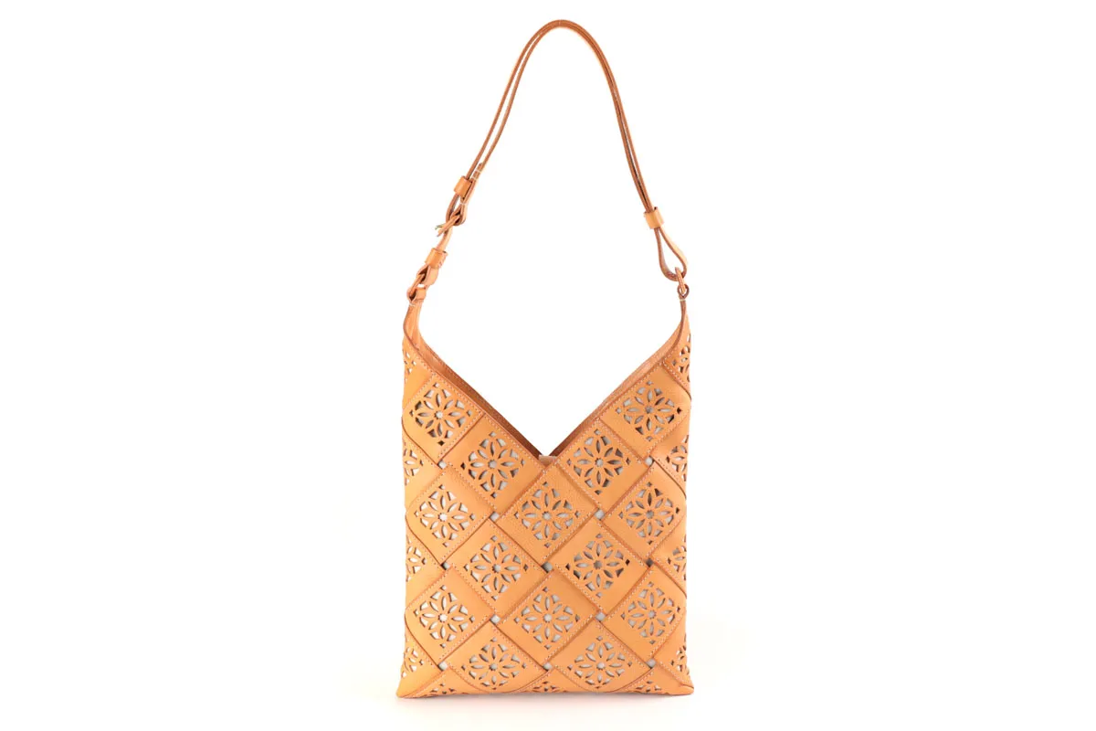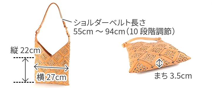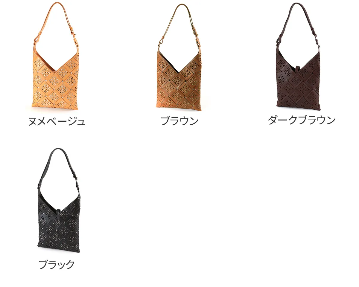 定番の正方形のカットワーク柄を正菱形に。工芸品を彷彿させる美しい佇まいと、機能性を有した「サスティナブル・カットワーク」。 一枚一枚の形状の異なる革からバッグパーツを抜き出し、革を使い切ることは、非常に難しい課題ですが、gentenでは、通常10前後から成るバッグのパターン数を50前後まで細かいパーツを考案し、革を極力隅々まで裁断しきれるように取り組みました。 genten定番素材のミネルヴァボックスの小さな革を、ひとパーツごとに花模様の抜きを入れ、コバを磨き、焼きねんを施し、丁寧に一つ一つ縫製しています。ひと手間ひと手間を惜しむことなく仕上げることでクラフト感に品性を生み出しています。 「切り目のせ」の手法により、潔い革の断面が洗練さを際立たせてくれます。柔らかさが引き立つ丸編みのような独特の構造感覚も魅力です。 本体から持ち手の曲線美は、肩かけや肘が入れやすく、口元の差し込み機能もまた、金具に頼らない風情があります。裏地付きなので安心してお使い頂けます。保管されている革は一つひとつ表情、色が微妙に異なります。 経年変化もまた異なり、持つほどに唯一無二のバッグへと変化してゆきます。環境に配慮し、持つだけでなく観ても愉しめる、持つ人に穏やかな安らぎを与えてくれるシリーズです。 〈素材の特性・メリット〉 水染みになりやすいので、急な水濡れの際は素早く布などで拭いていただき風通しの日陰でゆっくり乾燥させてください。多少の爪傷は柔らかい綿の布で爪傷の方向に合わせて拭くとある程度でしたら取れます。深い傷の場合は取れません。タンニン鞣しの特性上、日焼け、経年変化が多くみられますが、それも味としてお楽しみください。 こだわりが詰まったカットワークと、美しいフォルムが目を惹くショルダーバッグです。 全体的に薄マチのシルエットでシンプルながらも、V字カッティングが印象的なデザインに仕上げられています。 メイン開口部のべろさしの先端には「genten」の刻印が施されており、細かい部分にもこだわりを感じられます。 ショルダーは10段階調節が可能で、身長や服装に応じて様々な持ち方をお選びいただけます。 コーデの主役になるデザインで、休日のお出かけにはもちろん、日々のお買い物にピッタリなバッグです。