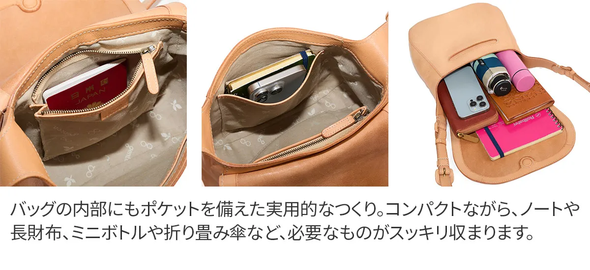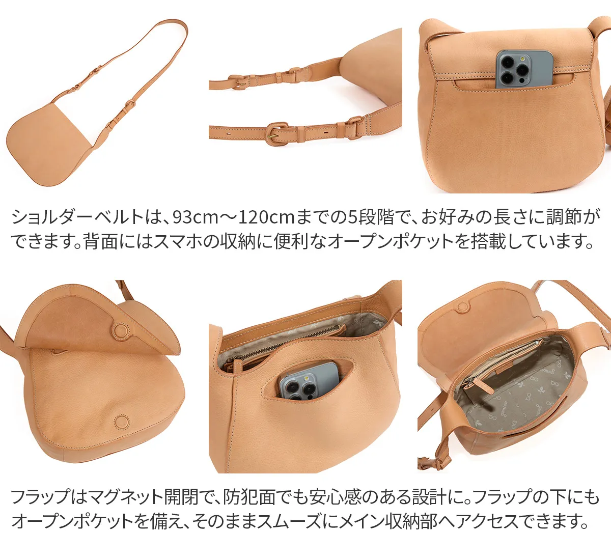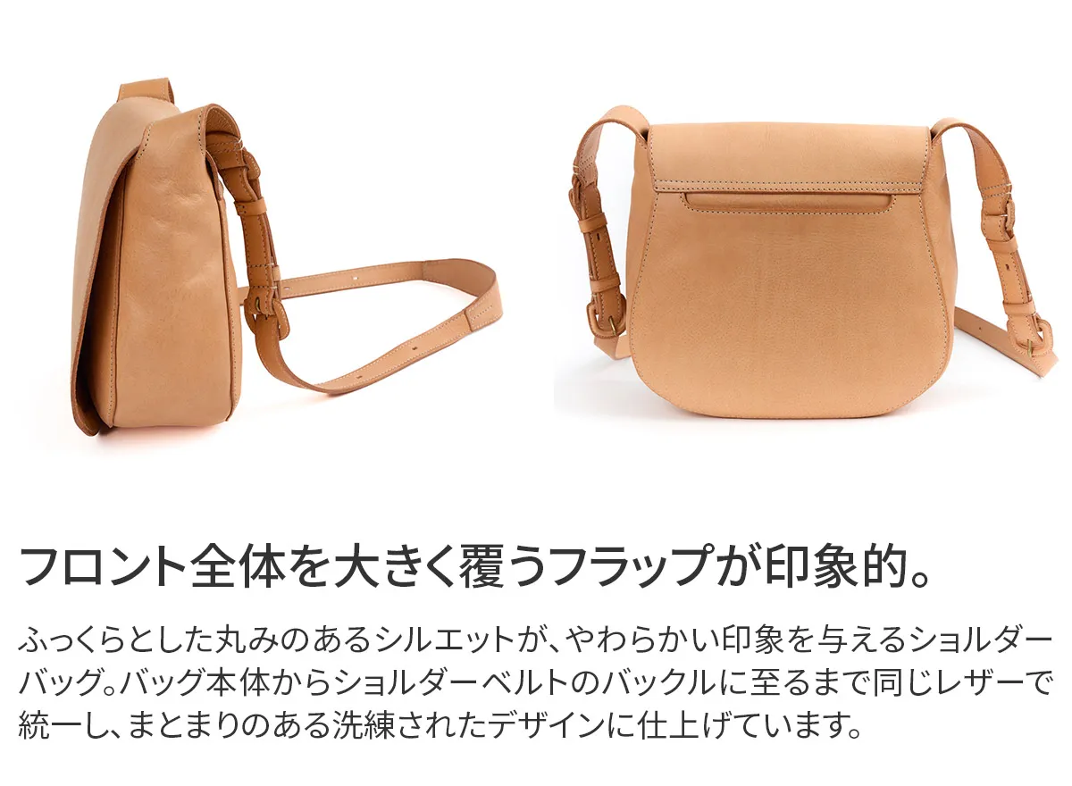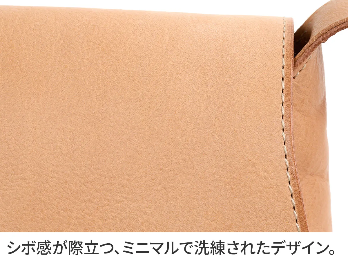 完全な無染色の白ヌメならではの、“綺麗な経年変化”を、存分にお楽しみいただけるシリーズ。 本革の証である、キズ、シミもそのまま活かし、あるがままの革の風合いを引き立たせるよう、ミニマムかつシンプルなフォルムとデザインにまとめました。 良質なイタリアトスカーナ産の革ならではの、奥深いエイジングを存分に楽しめるやさしいヌメ色でありながらも、急な雨や水濡れでも安心して使えるところもポイントです。 《素材の特性》 フィレンツェトスカーナのタンナーで鞣されたダブルショルダーを使用。 cuoioのヌメ革は、水が付いてもしばらくは染みこまないため焦らずに拭き取ることができます。 水染みが残りにくいため、白ヌメ革を普段使いに気兼ねなくいお楽しみいただけます。 キズやムラも含め、牛革本来の自然な風合いをそのまま取り込んでいます。使用頻度と日焼け等にあわせ、より本革ならではの深いエイジングの魅力を高めてくれます。 優しい丸みを持たせたフォルムが印象的な、フラップ付きのショルダーバッグ。くせのないデザインでコーデの幅が広いところも魅力。