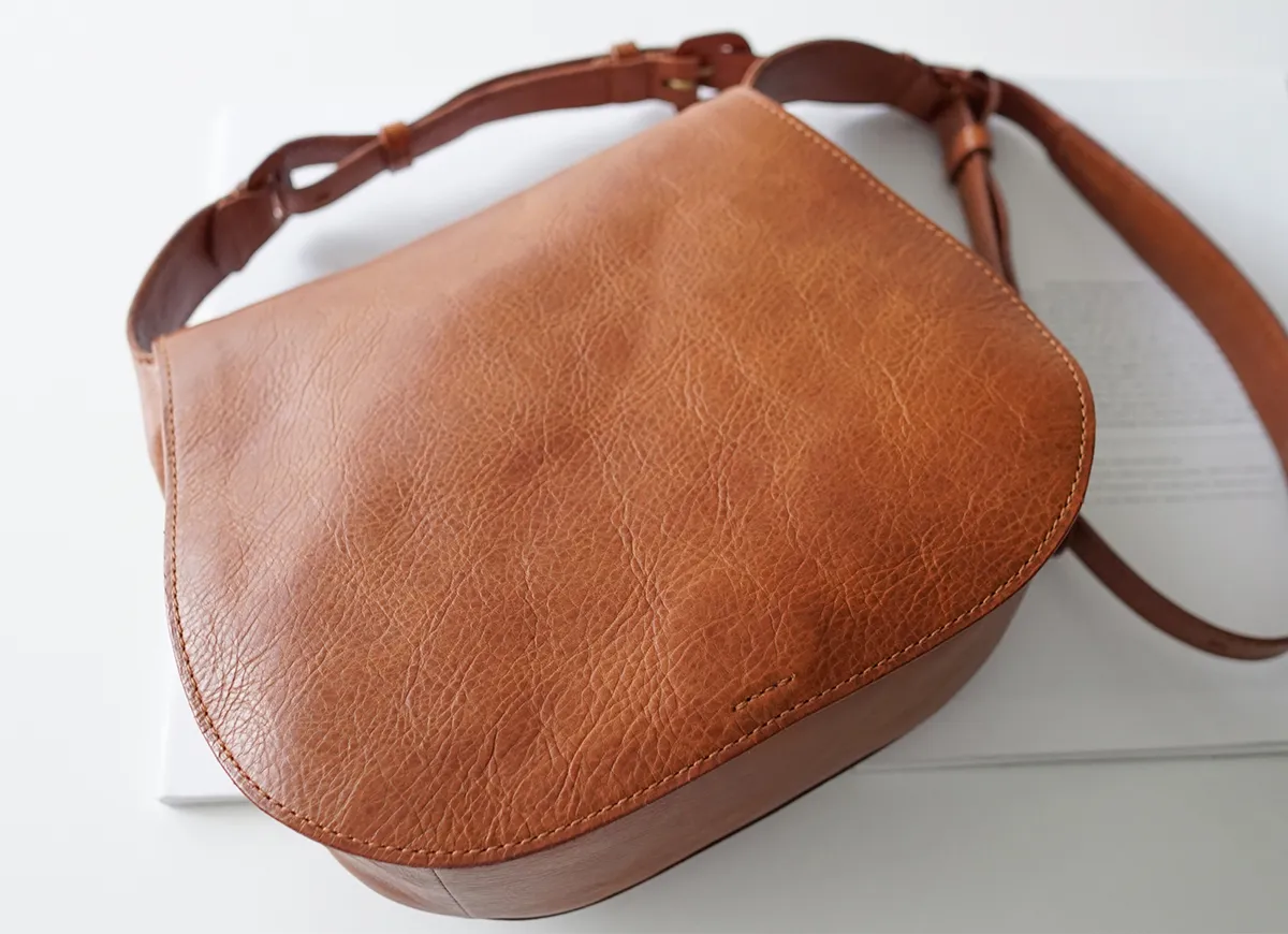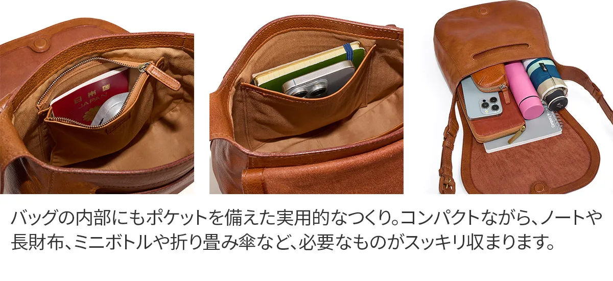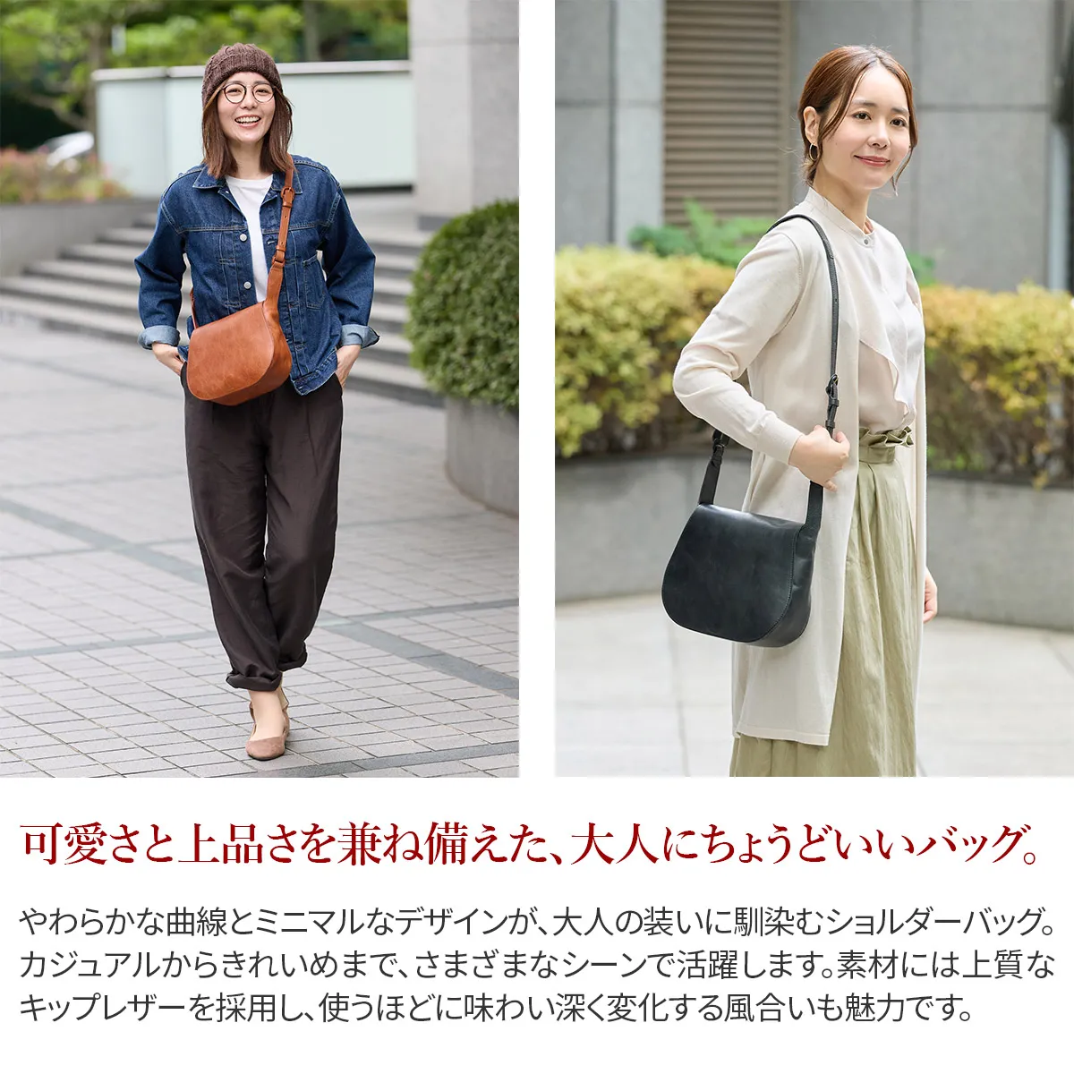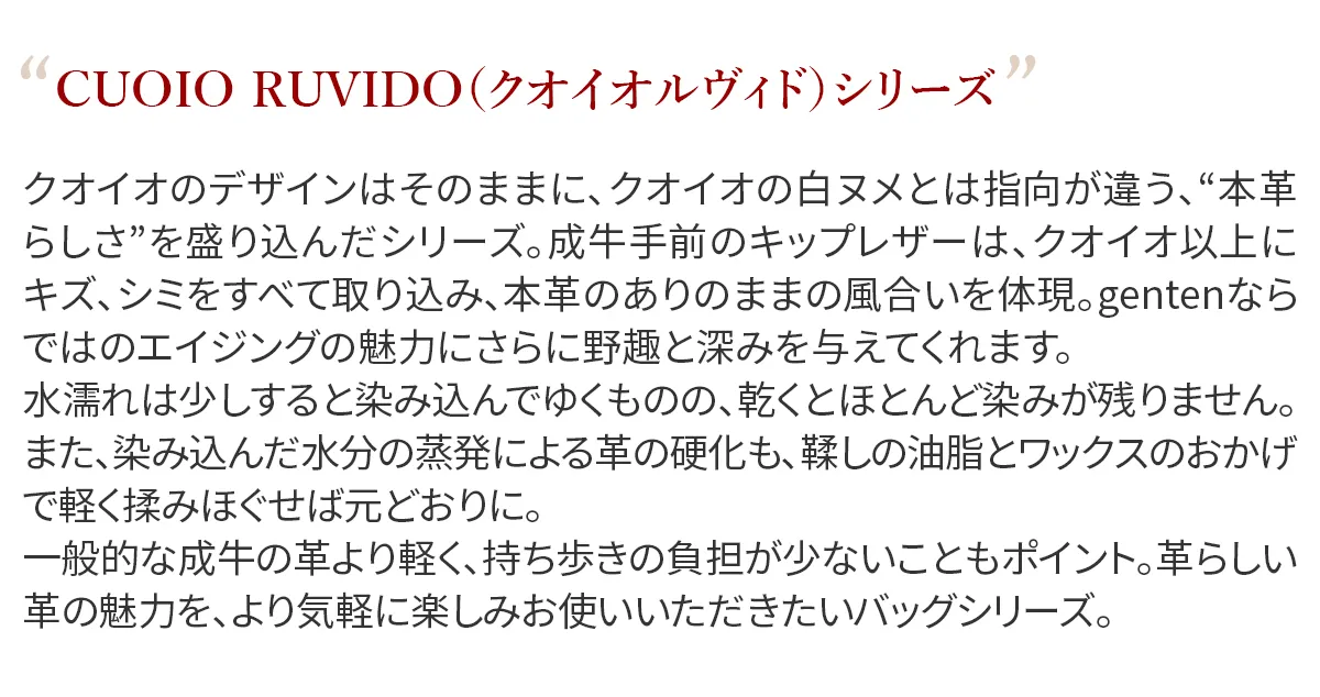 クオイオのデザインはそのままに、クオイオの白ヌメとは指向が違う“本革らしさ”を盛り込んだシリーズ。 成牛手前のキップレザーは、クオイオ以上にキズ、シミをすべて取り込み、本革のありのままの風合いを体現。gentenならではのエイジングの魅力にさらに野趣と深みを与えてくれます。 水濡れは少しすると染み込んでゆくものの、乾くとほとんど染みが残りません。また、染み込んだ水分の蒸発による革の硬化も、鞣しの油脂とワックスのおかげで軽く揉みほぐせば元どおりに。 一般的な成牛の革より軽く、持ち歩きの負担が少ないこともポイント。革らしい革の魅力を、より気軽に楽しみお使いいただきたいバッグシリーズ。 《素材の特性》 ・キップレザーならではの銀面の強さで、傷の付きにくい ・油分の多いプルアップ加工のため、汚れが目立ちにくい ・余計なコーティングなどをしない素揚げ調の仕上がりで、“本革らしさ”を楽しめる ・本革でも水染み跡がほとんど残らず、持ち歩きの際に気軽に使える ・使いはじめは光沢感が少なくマットだが、経年変化で銀面の光沢感が増す やさしい丸みが印象的なフラップ付きのショルダーバッグ。くせのないデザインでコーデ幅が広いところも魅力。ショルダーベルトの肩に当たる部分は幅広に作られており、肩への負担を軽減してくれそう。