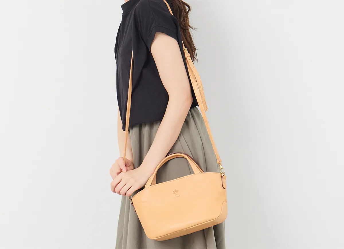 「自然を大切にしたい」はALBEROのフィロソフィー。 Naturaleは、それを象徴するシリーズ。 牛革ショルダー部を植物タンニンでなめし染色を施さず使う程に飴色に変化して光沢が増す素材。 小ぶりなサイズ感が上品な印象の、ヌメ革仕立ての2WAYショルダーバッグ。 ナチュラルな革の風合いを楽しめる、シンプルなデザインが魅力となっています。 前後にあおりポケットを設けた3室構造の為、荷物の整理がしやすく取り出しもスムーズに行えます。 2WAY仕様となっており、コーデや様々なシーンに対応し重宝する逸品です。
