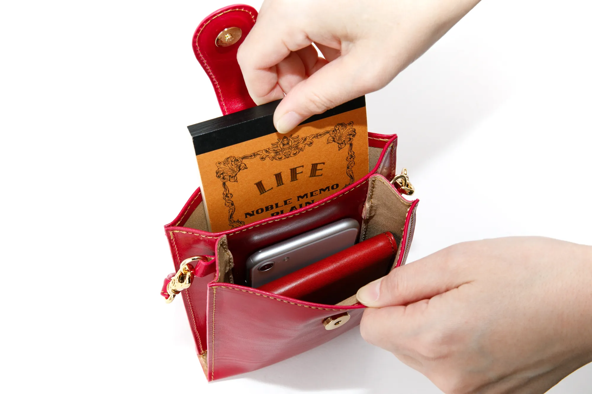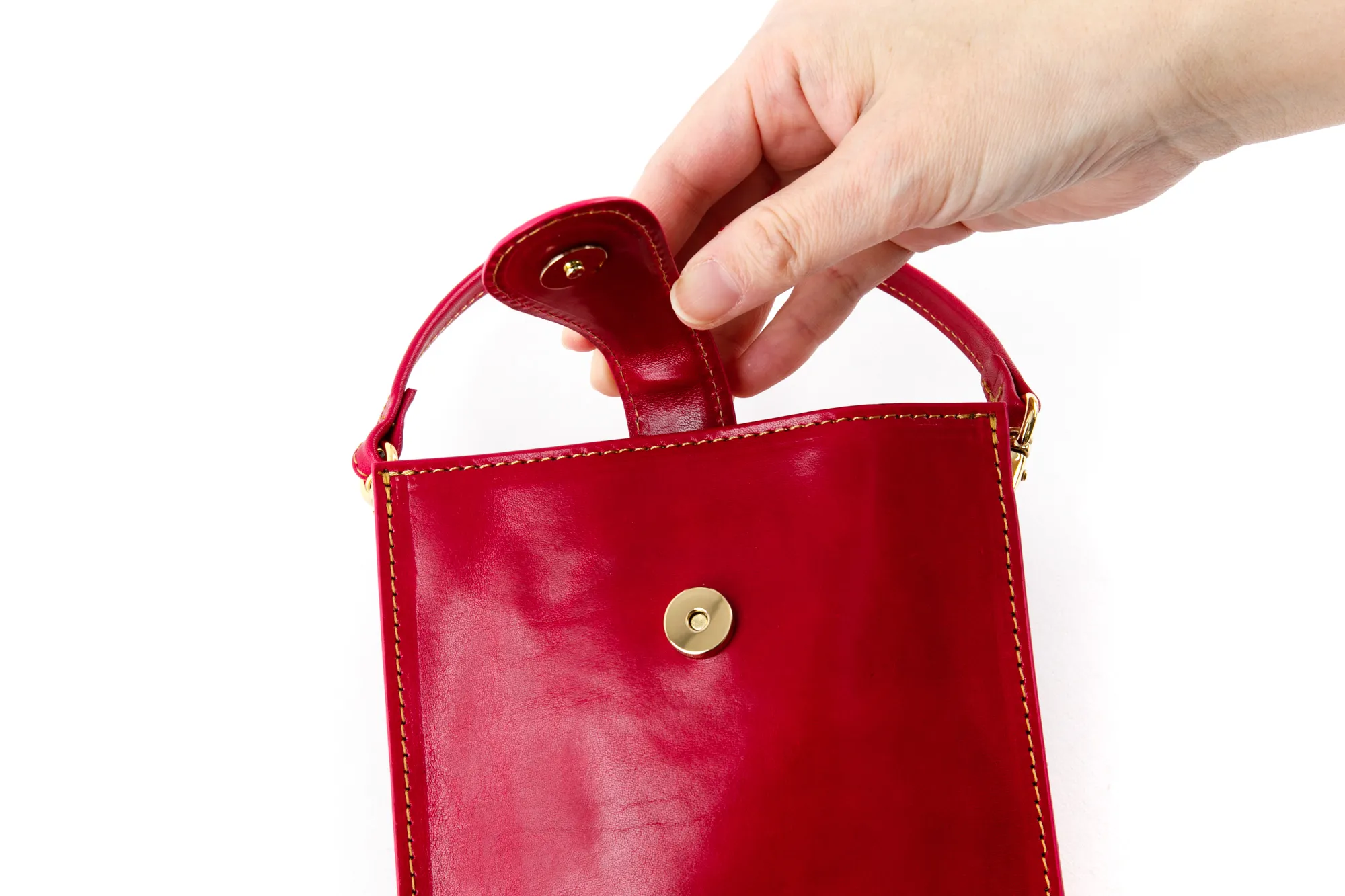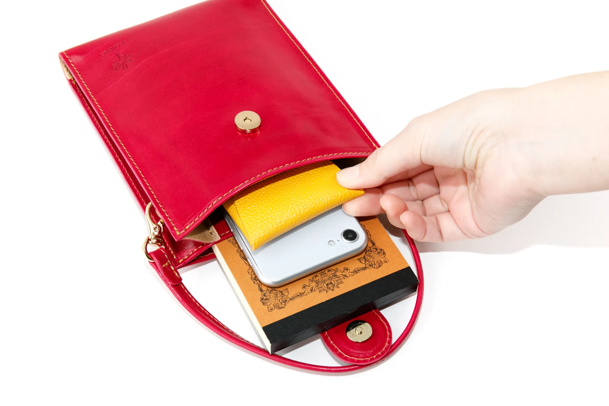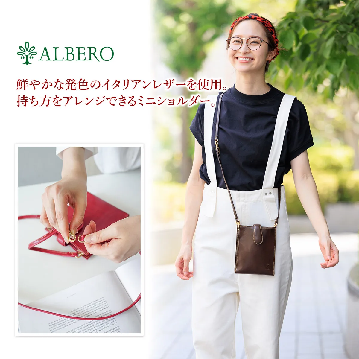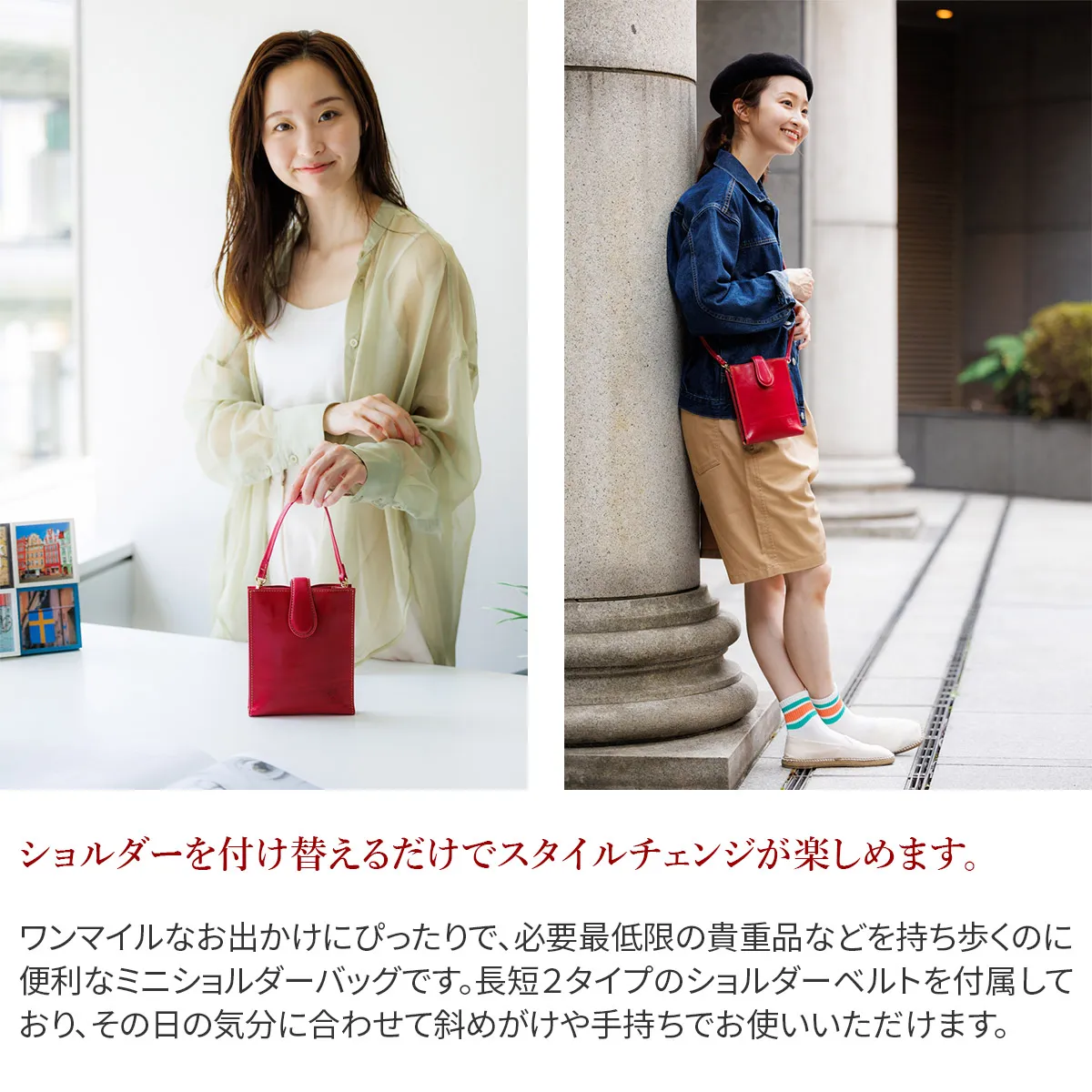 Tamponatoと呼ばれるトスカーナ地方の伝統技法による手染めの革を使用。 光沢としわ感が特徴の牛フロント(背中)部分をタンニンで鞣したソフトなヌメ革。 すっきりとしたスクエアフォルムが印象的なミニショルダーバッグです。 開口部はマグネット付きなので、ワンアクションで開閉でき、中身の出し入れがしやすくストレスを感じさせません。 コンパクトなお財布やスマートフォンなど、貴重品を気軽に持ち歩くシーンなどに便利です。 長短2タイプのショルダーベルトが付属しており、付け替えることで手持ちや斜めがけなど持ち方をアレンジしていただけます。 ワンマイルなお出かけから、旅行先まで幅広く対応します。