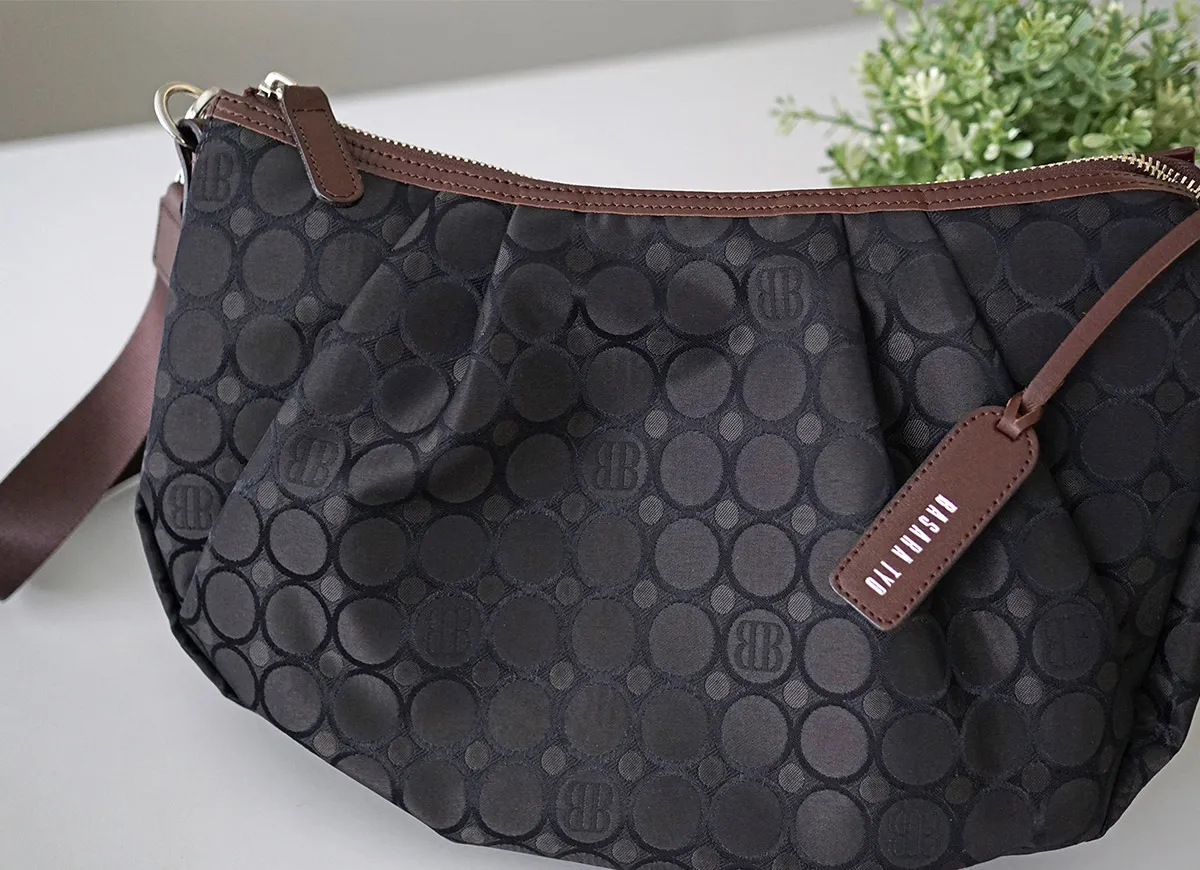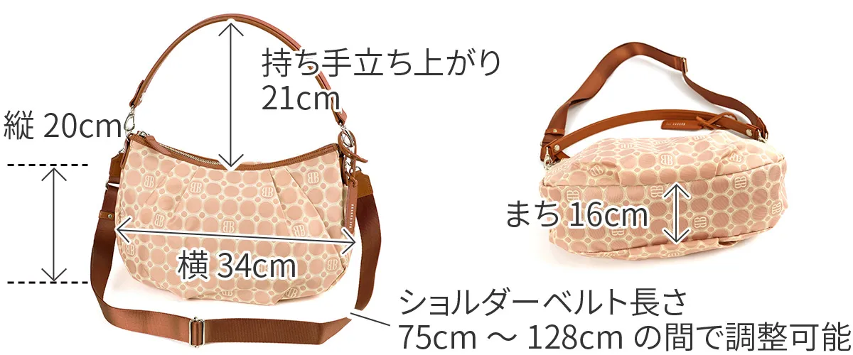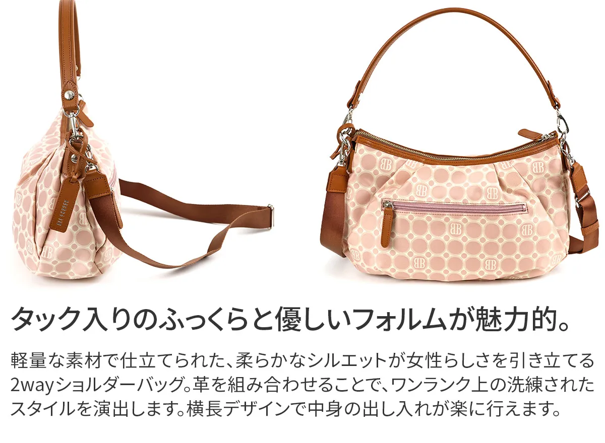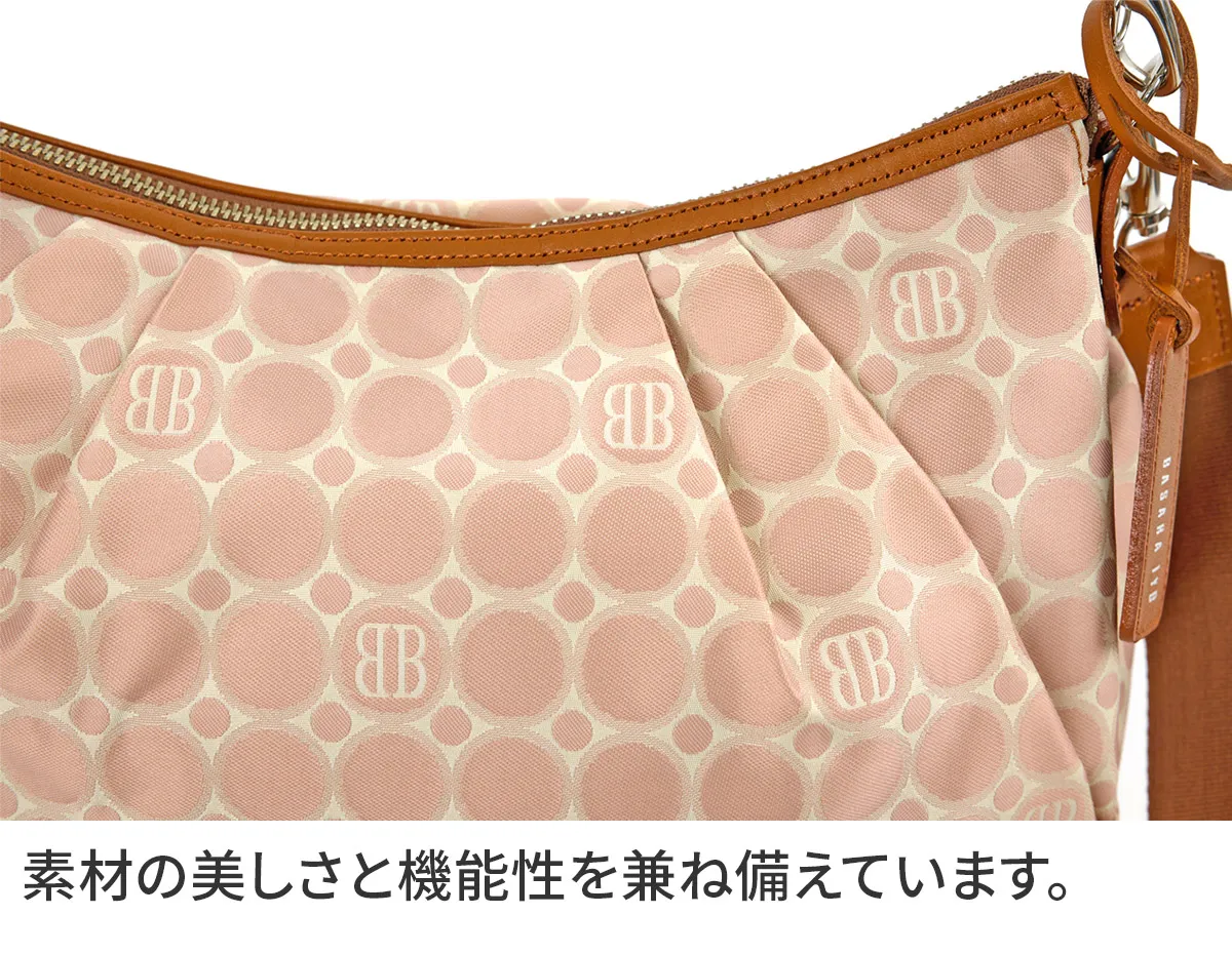 技術が詰まったオリジナルジャガード生地と牛革を使用。高級感のあるデイリーシリーズ。職人の技術が詰まったBASARA TYOオリジナルジャガード生地に付属部分は牛革を使用。軽量で使い勝手抜群ながらも、高級感溢れるシリーズです。バッグの仕立ては日本製です。 《素材の特性》 織物の産地である福井県で丁寧に織り上げたジャガード生地です。2色の先染めの糸と染めていない糸を織り上げた後、生地の状態で更に1色染め工程を加えて3配色に。織物の産地である福井県の職人の方々と何度も試行錯誤して作り上げられました。 《Attention》 長い時間シワが寄った状態で置いておくと、シワが消えにくくなる場合がございます。ハンドルの牛革は天然素材です。取り扱いにご注意下さい。消毒用のアルコールやジェル、ハンドクリークなどによる色落ち、劣化などにも十分ご注意ください。 やわらかなフォルムにタックを添えて、女性らしさと気品を纏う2wayショルダーバッグ。長財布や500mlのペットボトルが横向きに入ります。取り外し可能なハンドルとショルダーストラップも付いているため、さまざまなシーンでお使いいただけます。