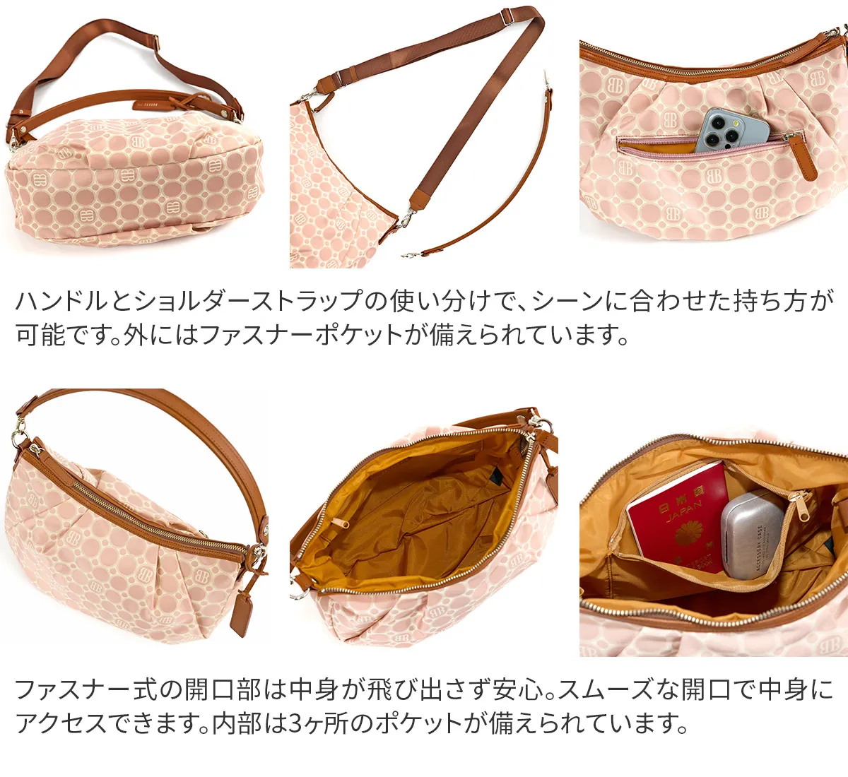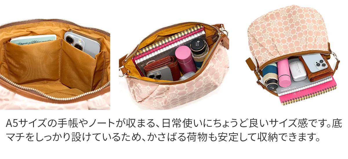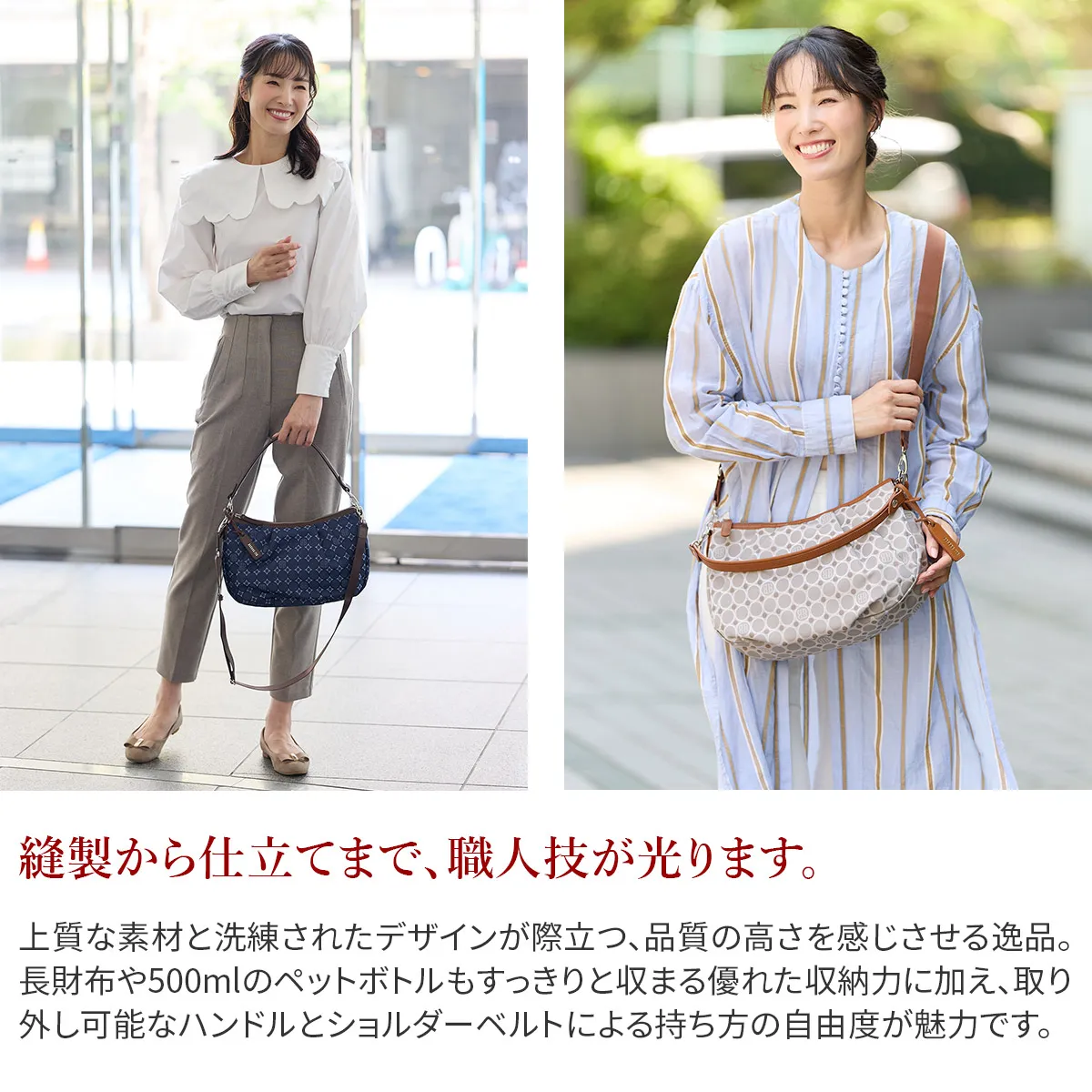 技術が詰まったオリジナルジャガード生地と牛革を使用。高級感のあるデイリーシリーズ。職人の技術が詰まったBASARA TYOオリジナルジャガード生地に付属部分は牛革を使用。軽量で使い勝手抜群ながらも、高級感溢れるシリーズです。バッグの仕立ては日本製です。 《素材の特性》 織物の産地である福井県で丁寧に織り上げたジャガード生地です。2色の先染めの糸と染めていない糸を織り上げた後、生地の状態で更に1色染め工程を加えて3配色に。織物の産地である福井県の職人の方々と何度も試行錯誤して作り上げられました。 《Attention》 長い時間シワが寄った状態で置いておくと、シワが消えにくくなる場合がございます。ハンドルの牛革は天然素材です。取り扱いにご注意下さい。消毒用のアルコールやジェル、ハンドクリークなどによる色落ち、劣化などにも十分ご注意ください。 やわらかなフォルムにタックを添えて、女性らしさと気品を纏う2wayショルダーバッグ。長財布や500mlのペットボトルが横向きに入ります。取り外し可能なハンドルとショルダーストラップも付いているため、さまざまなシーンでお使いいただけます。