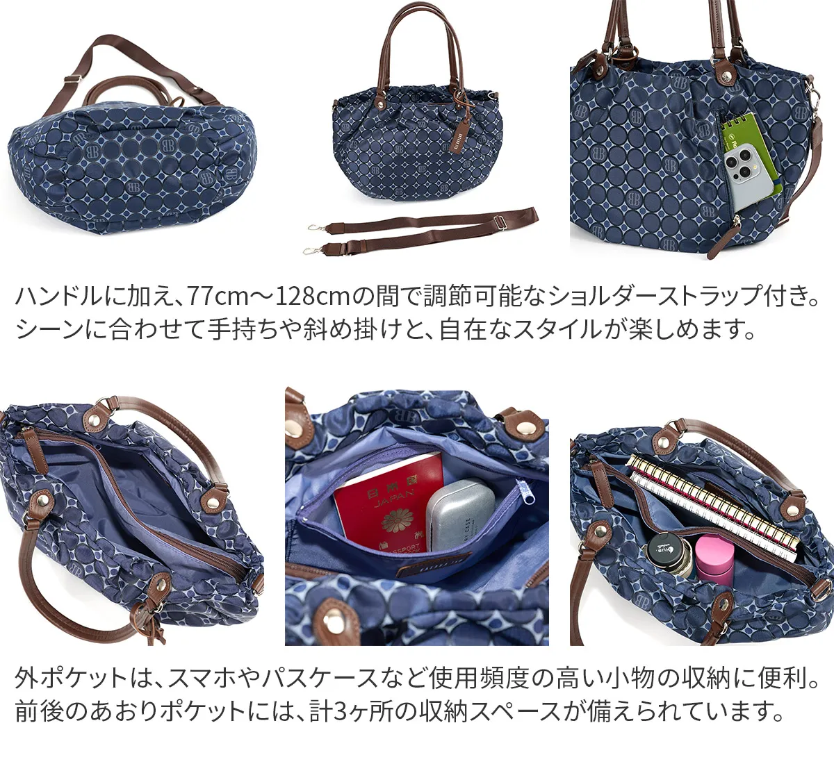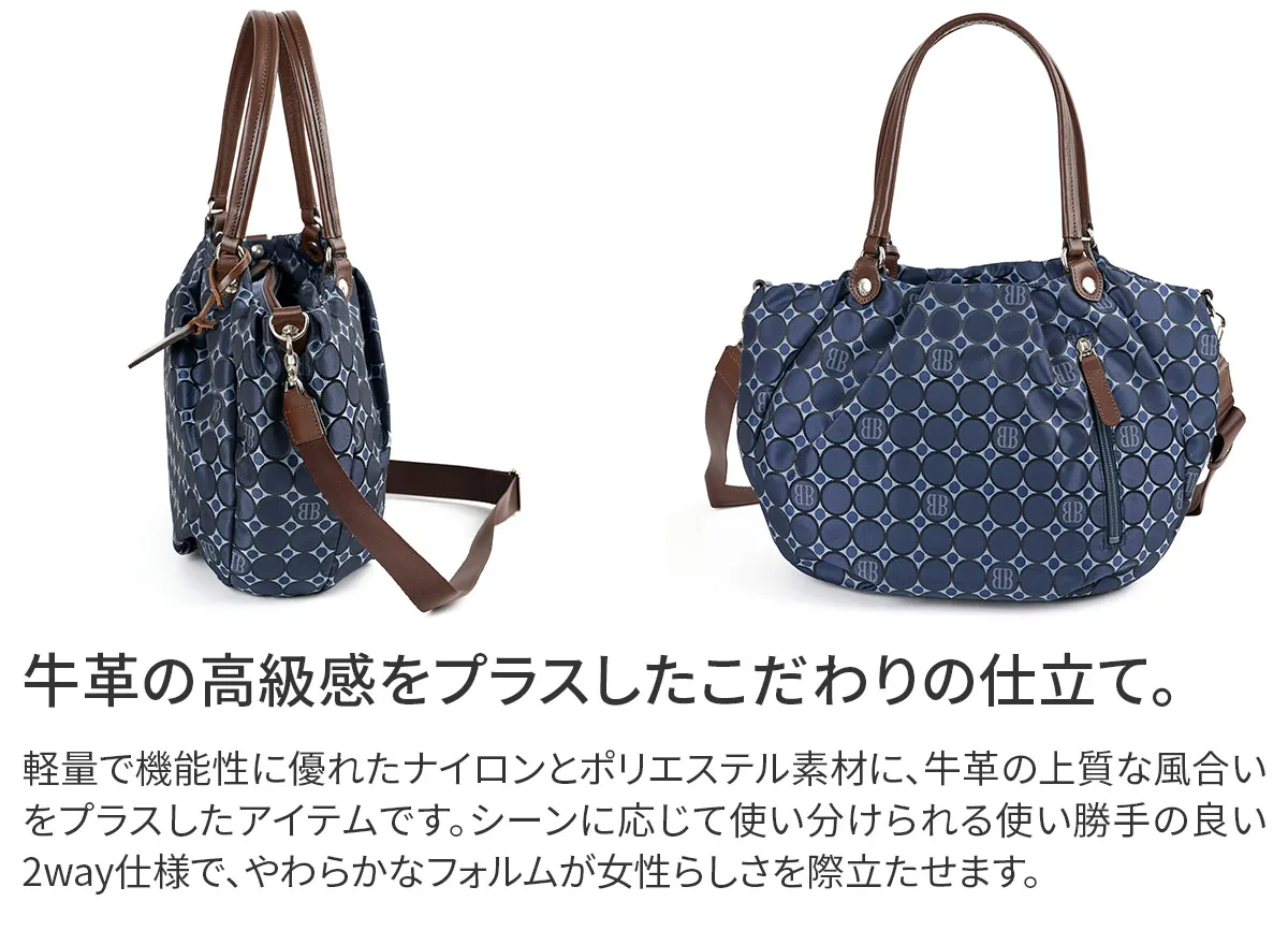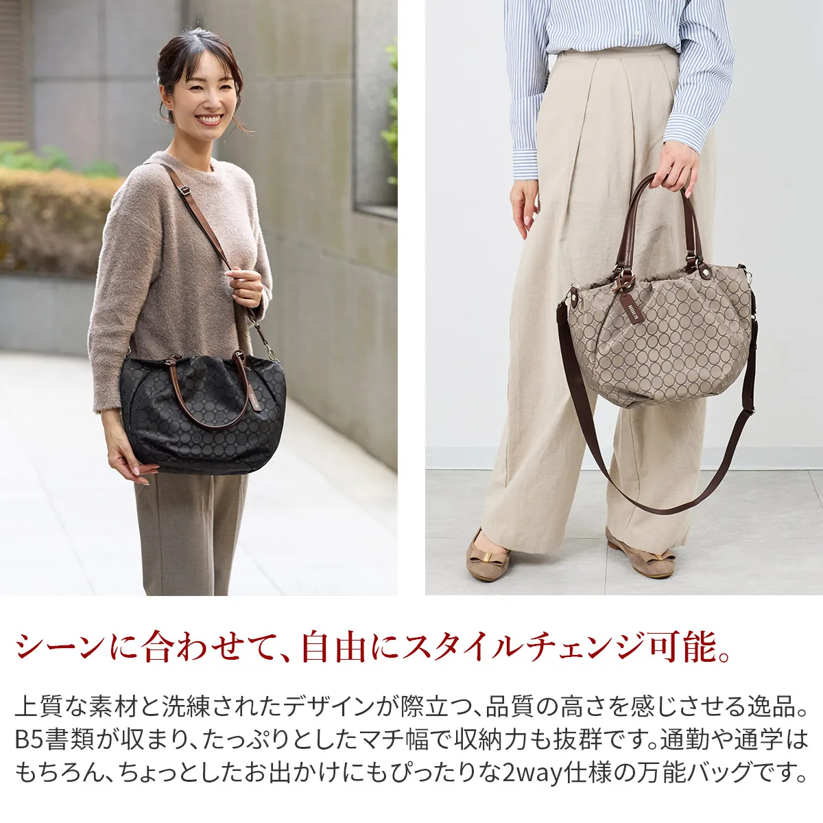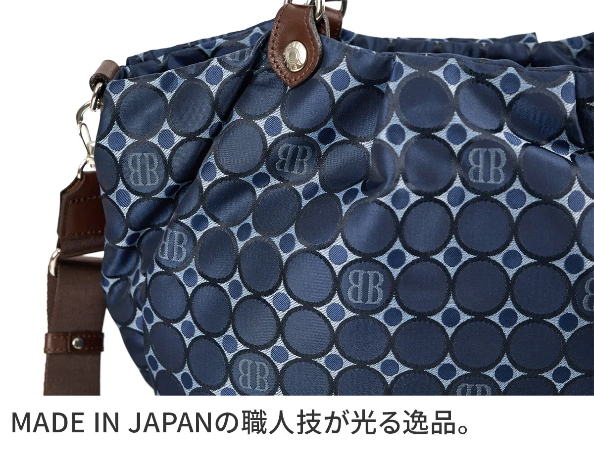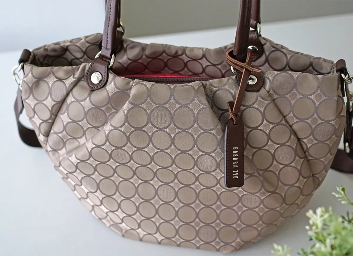 技術が詰まったオリジナルジャガード生地と牛革を使用。高級感のあるデイリーシリーズ。職人の技術が詰まったBASARA TYOオリジナルジャガード生地に付属部分は牛革を使用。軽量で使い勝手抜群ながらも、高級感溢れるシリーズです。バッグの仕立ては日本製です。 《素材の特性》 織物の産地である福井県で丁寧に織り上げたジャガード生地です。2色の先染めの糸と染めていない糸を織り上げた後、生地の状態で更に1色染め工程を加えて3配色に。織物の産地である福井県の職人の方々と何度も試行錯誤して作り上げられました。 《Attention》 長い時間シワが寄った状態で置いておくと、シワが消えにくくなる場合がございます。ハンドルの牛革は天然素材です。取り扱いにご注意下さい。消毒用のアルコールやジェル、ハンドクリークなどによる色落ち、劣化などにも十分ご注意ください。 やわらかなフォルムにタックを添えて、女性らしさと気品を纏う2wayショルダーバッグ。取り外しのできるショルダーが付いており、用途に合わせてお使いいただけます。B5サイズが入り、マチもたっぷりあるため、荷物が多い方にもおすすめです。