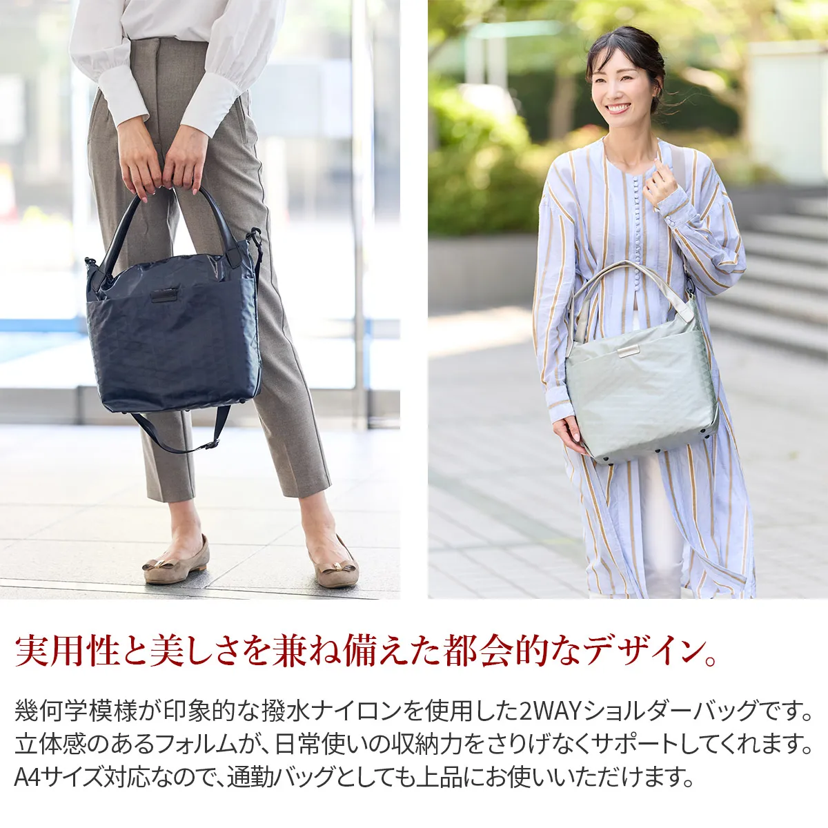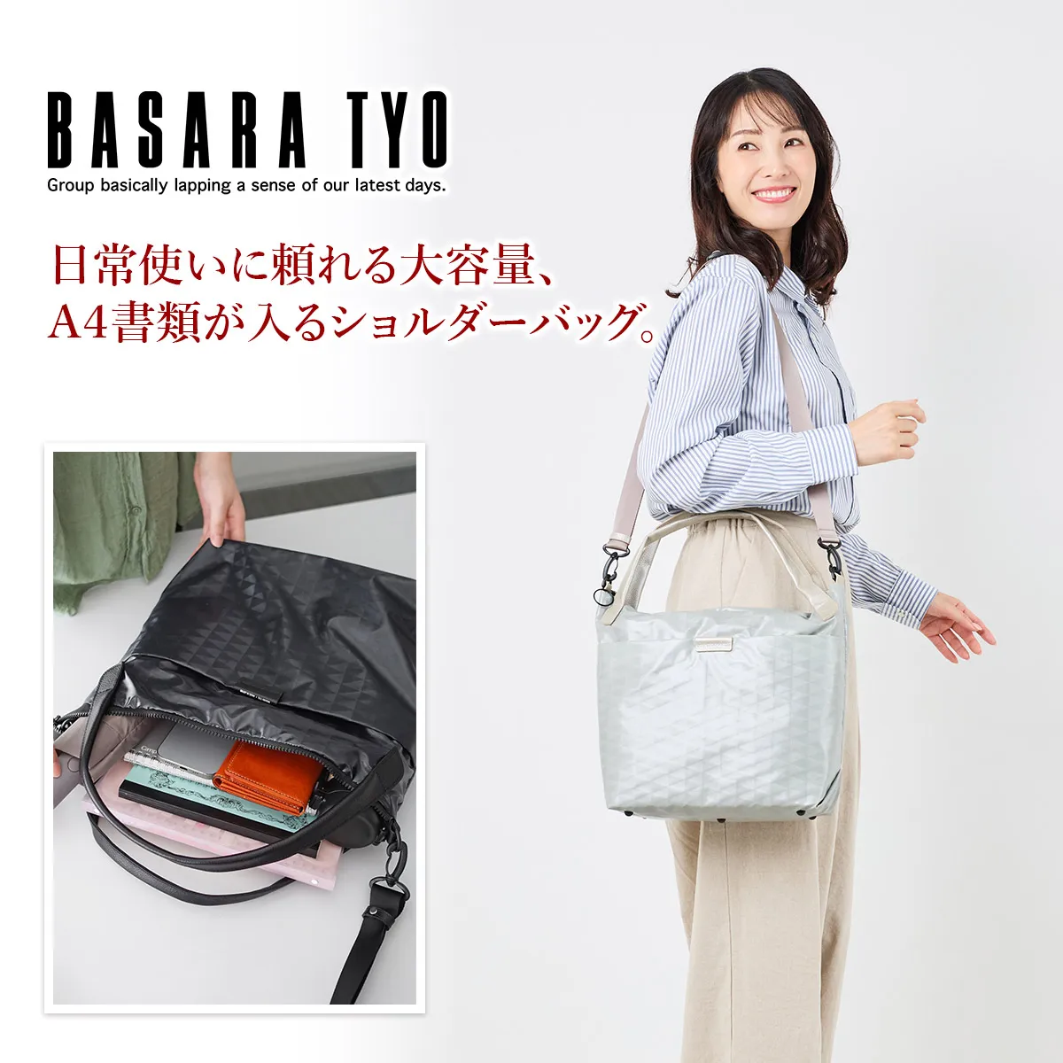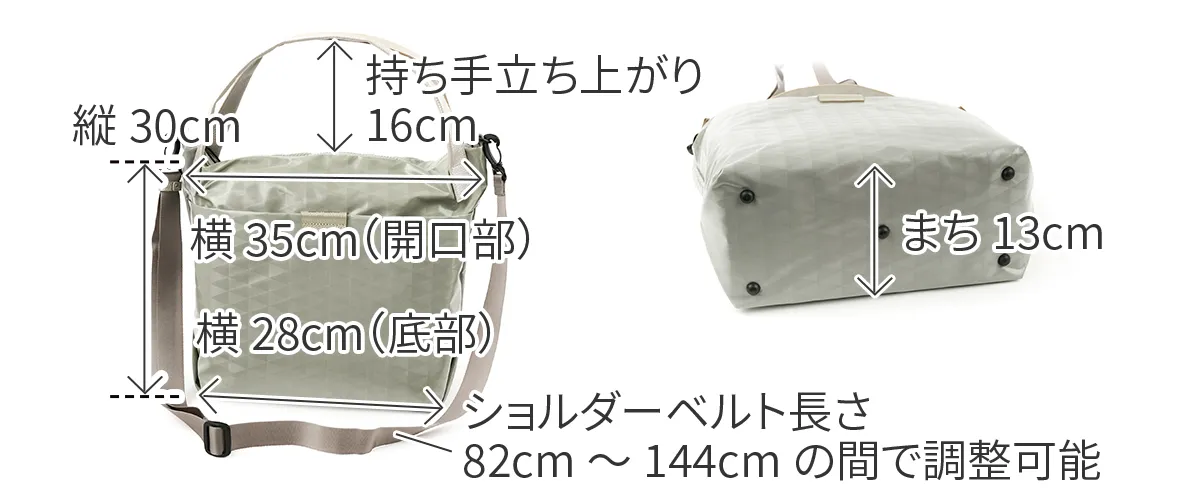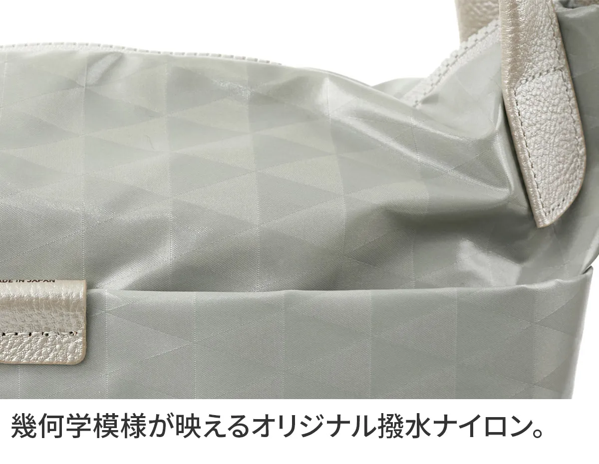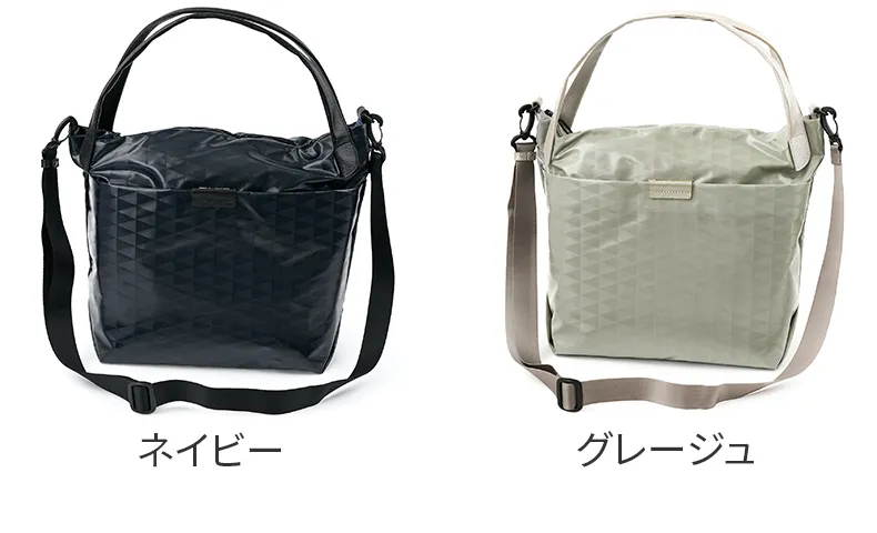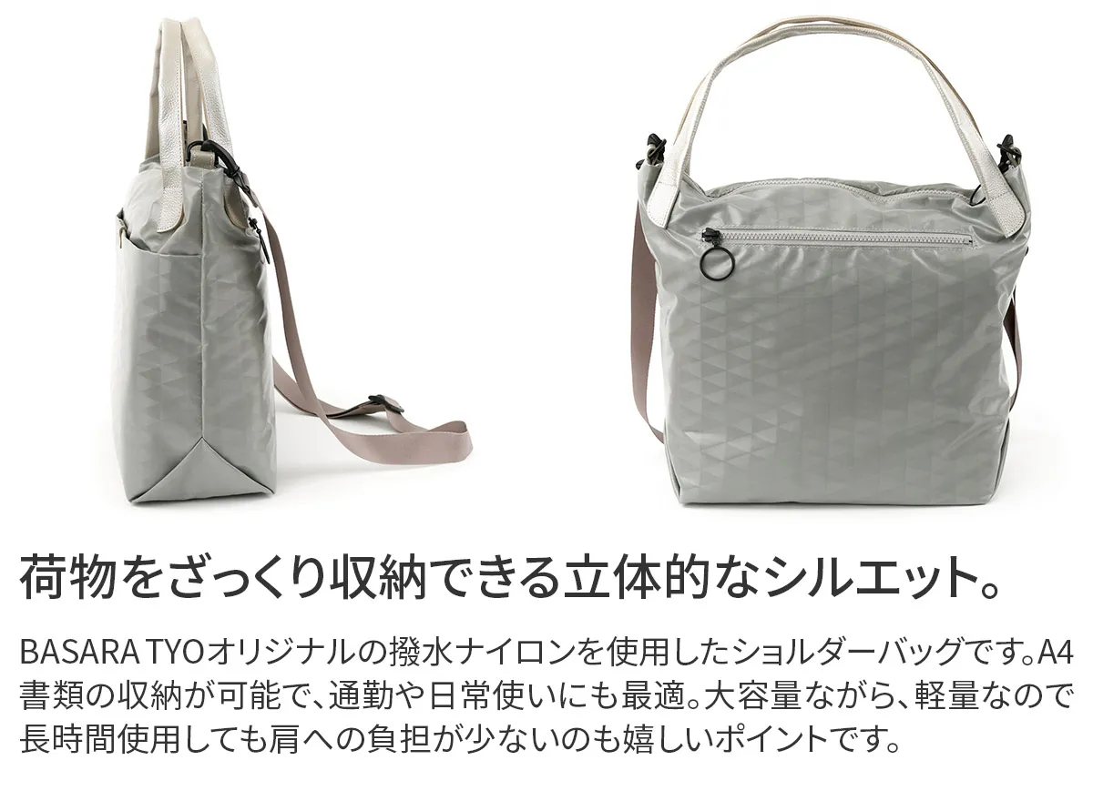 BASARAベーシックアイテムのスタンダード[撥水&軽量] 上品な艶を纏うコーディング生地は立体的にも見えるBASARA TYOオリジナル幾何柄デザインです。 幾何学模様が印象的な大容量2WAYショルダーバッグ。非常に軽く、マチがしっかりあるので、アウトドアでも活躍するアイテムです。 ファスナーの引き手は、リングタイプを採用しているため、荷物の出し入れがしやすく使い心地の良い仕様となっています。 ところどころにレザーがあしらわれているため、より上品さが感じられます。 表面と裏地でバイカラーになっているのも魅力の逸品です。
