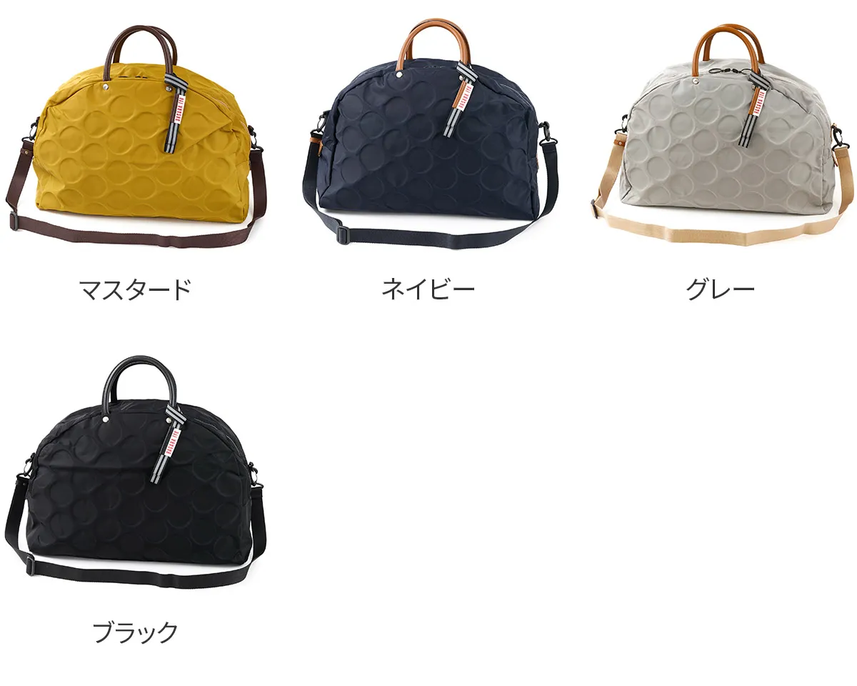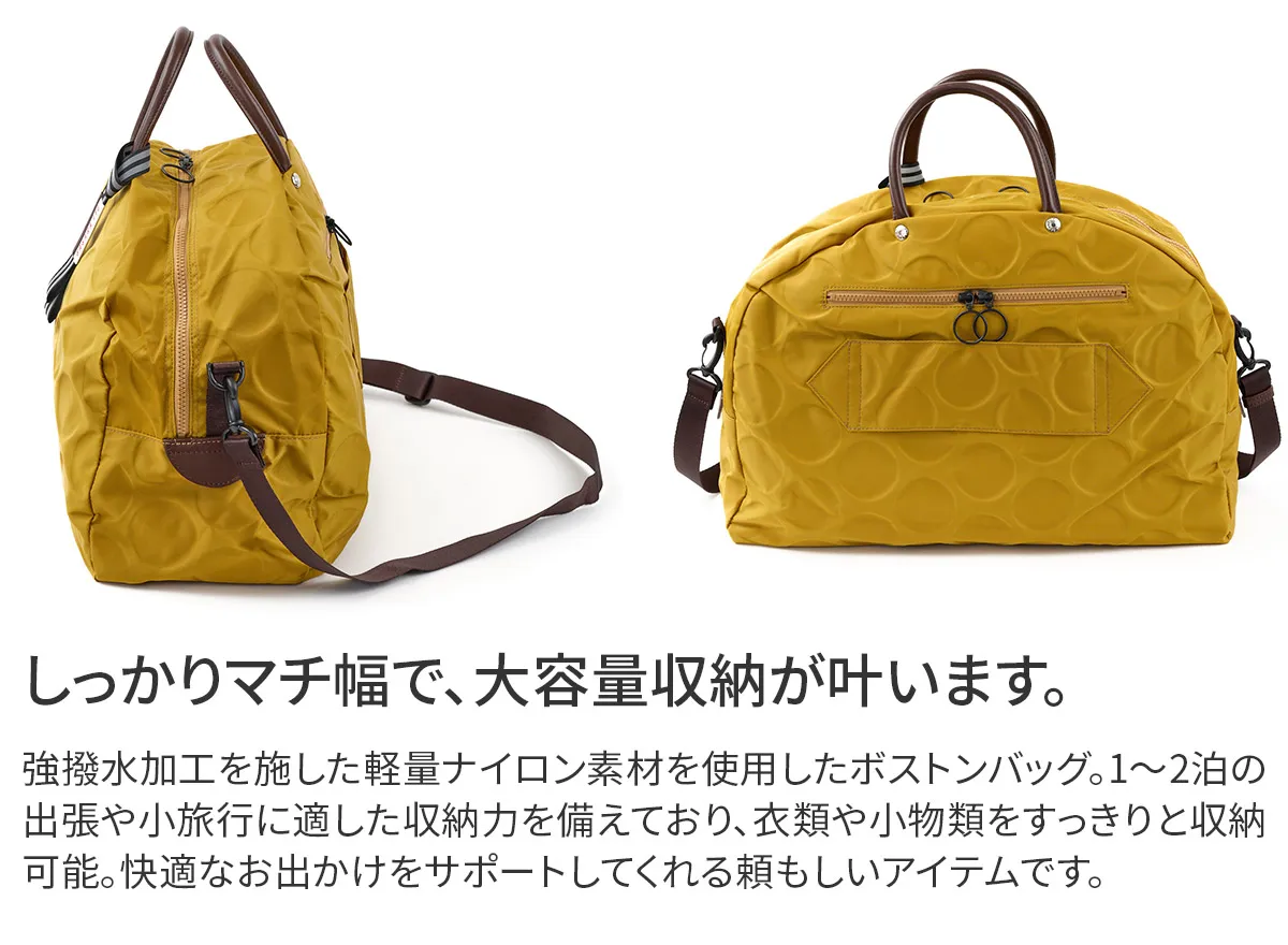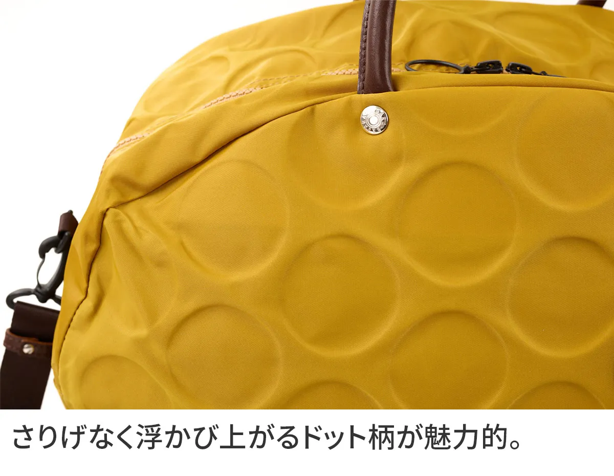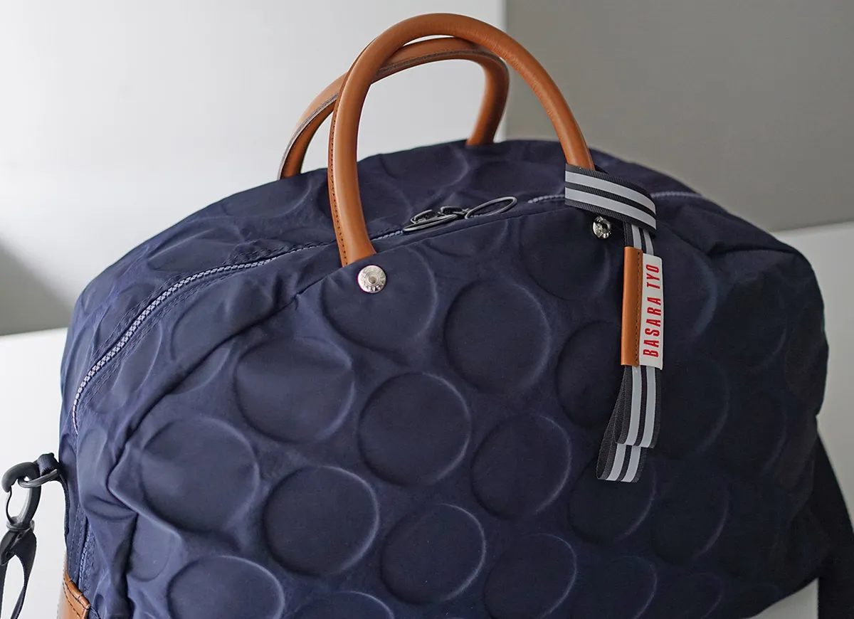 日本が誇る織物の名産地、福井県で丁寧に作られた BASARA TYO オリジナルナイロン。何度も試行錯誤して作られた生地はさらっとした肌触りも魅力。強撥水加工を施しており、雨でも安心してお使い頂けます。付属の牛革も日本産を使用、日本で職人さんが縫製したこだわりのMADE IN JAPANシリーズです。 ドット柄がアクセントになった、軽量ナイロン仕立ての2WAYボストンバッグ。暗い場所でライトに反射して光るチャームや、底面の汚れや傷を防ぐ底鋲など、細部までこだわりが光ります。リング仕様のダブルファスナーは、滑らかな引き心地で開閉も快適。メイン収納部はB4サイズがすっきり収まり、大容量ながらスマートな印象を保ちます。軽量かつ撥水性に優れているため、天候を気にせず気軽に持ち歩ける、頼れるアイテムです。