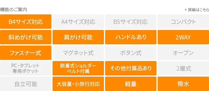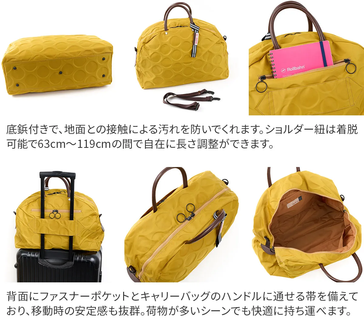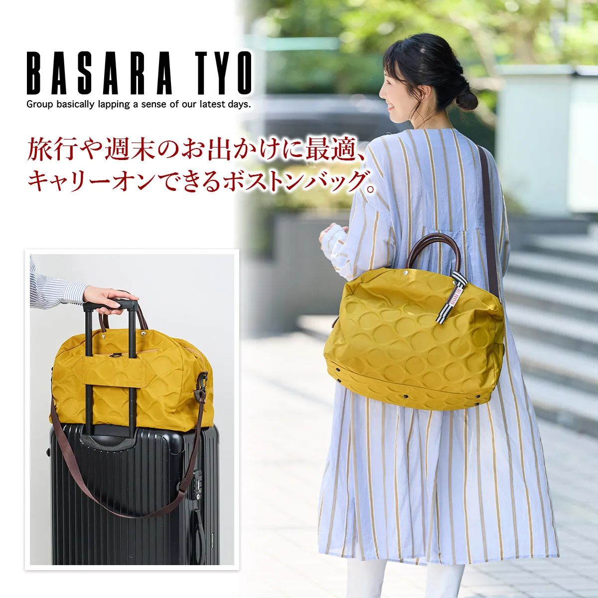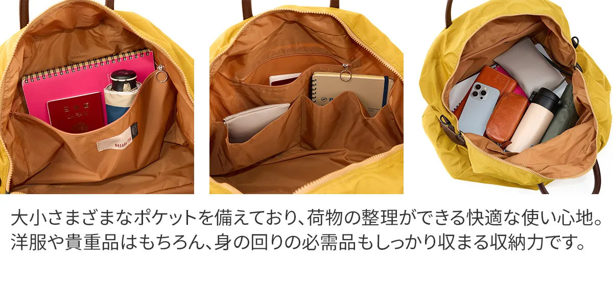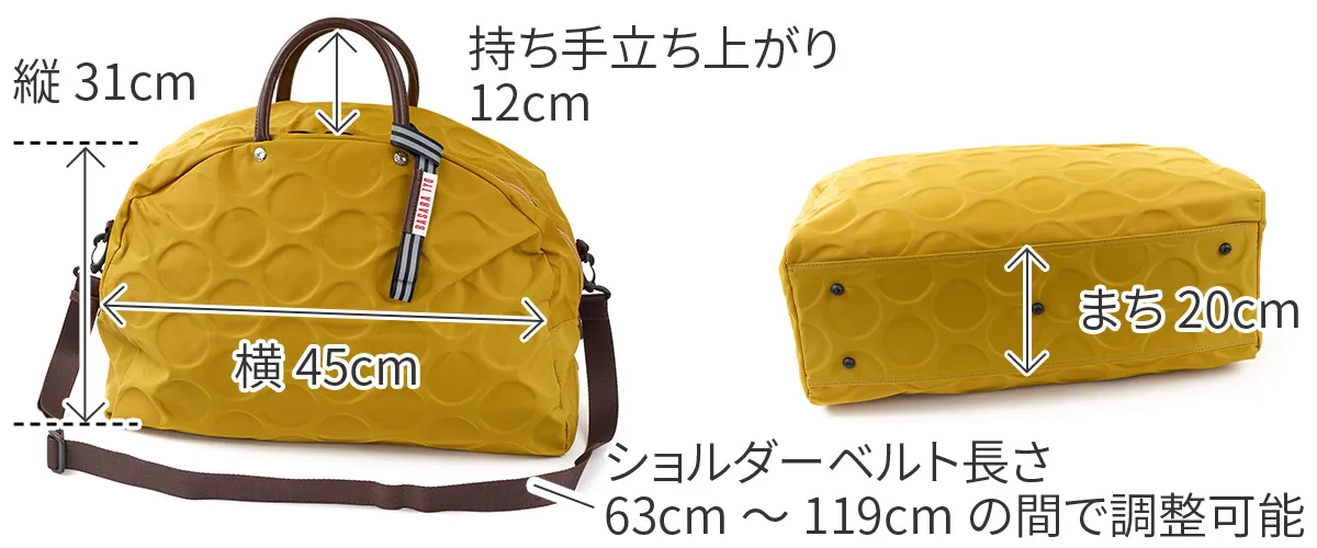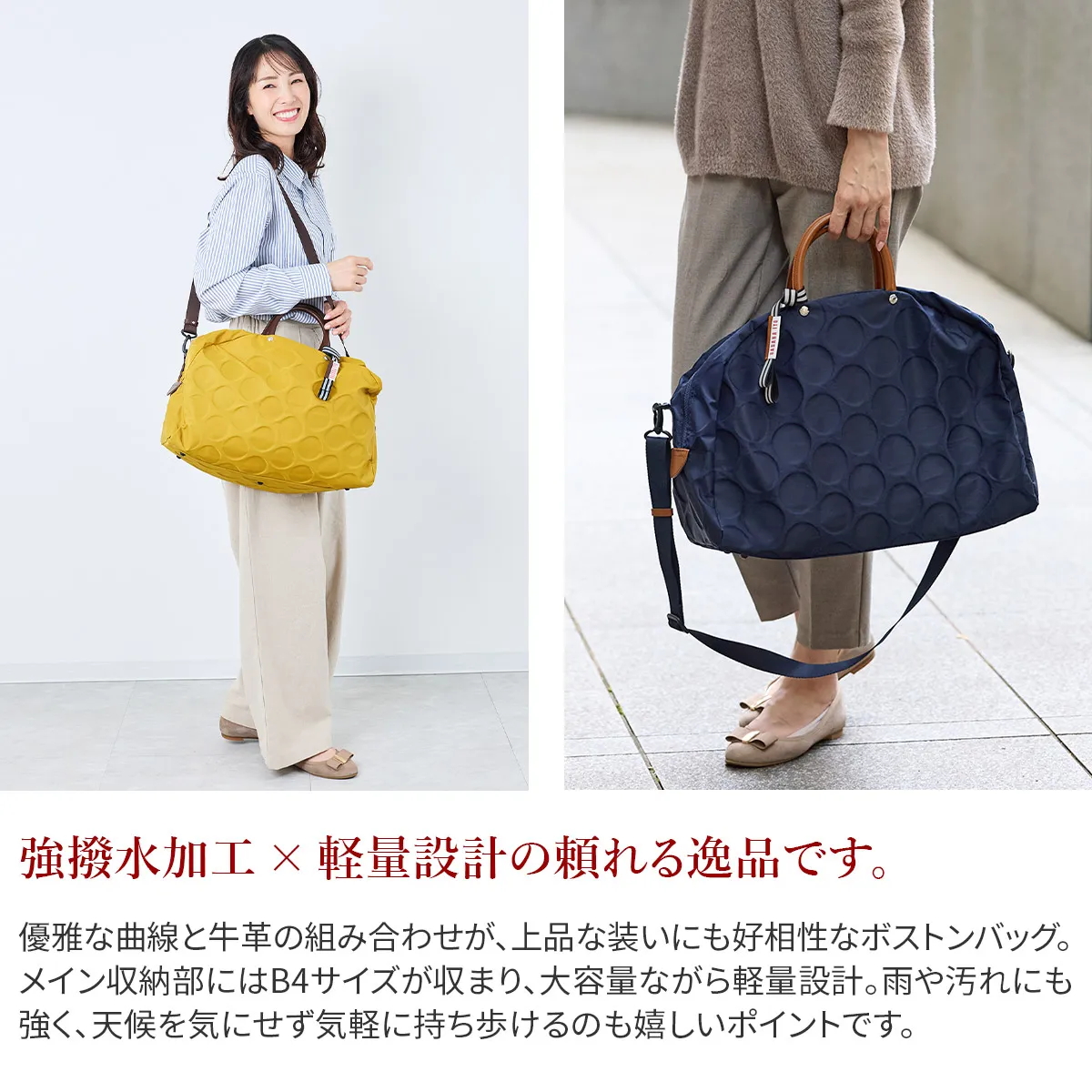 日本が誇る織物の名産地、福井県で丁寧に作られた BASARA TYO オリジナルナイロン。何度も試行錯誤して作られた生地はさらっとした肌触りも魅力。強撥水加工を施しており、雨でも安心してお使い頂けます。付属の牛革も日本産を使用、日本で職人さんが縫製したこだわりのMADE IN JAPANシリーズです。 ドット柄がアクセントになった、軽量ナイロン仕立ての2WAYボストンバッグ。暗い場所でライトに反射して光るチャームや、底面の汚れや傷を防ぐ底鋲など、細部までこだわりが光ります。リング仕様のダブルファスナーは、滑らかな引き心地で開閉も快適。メイン収納部はB4サイズがすっきり収まり、大容量ながらスマートな印象を保ちます。軽量かつ撥水性に優れているため、天候を気にせず気軽に持ち歩ける、頼れるアイテムです。