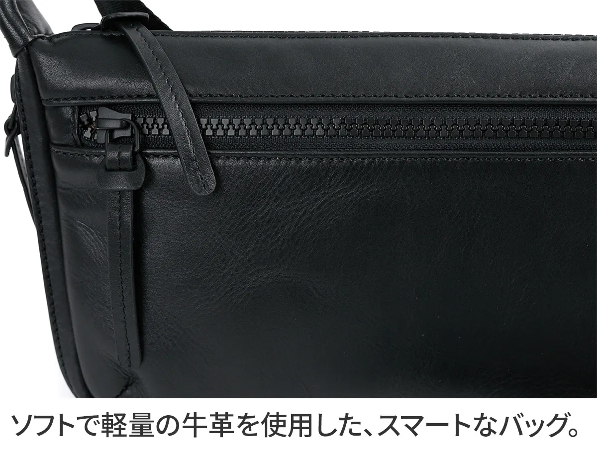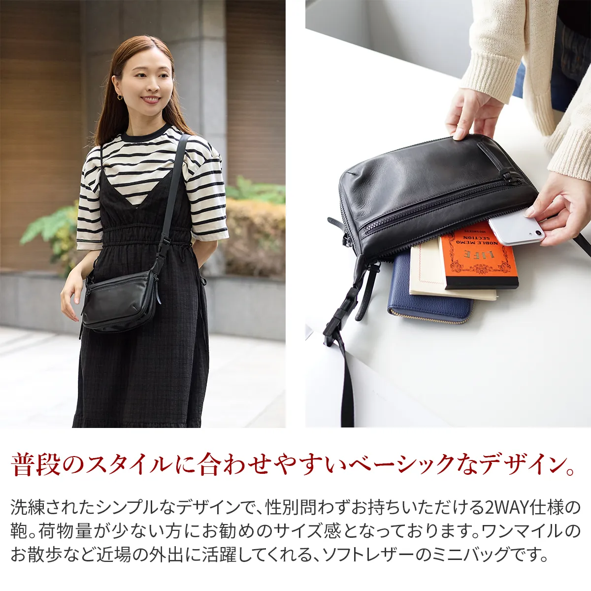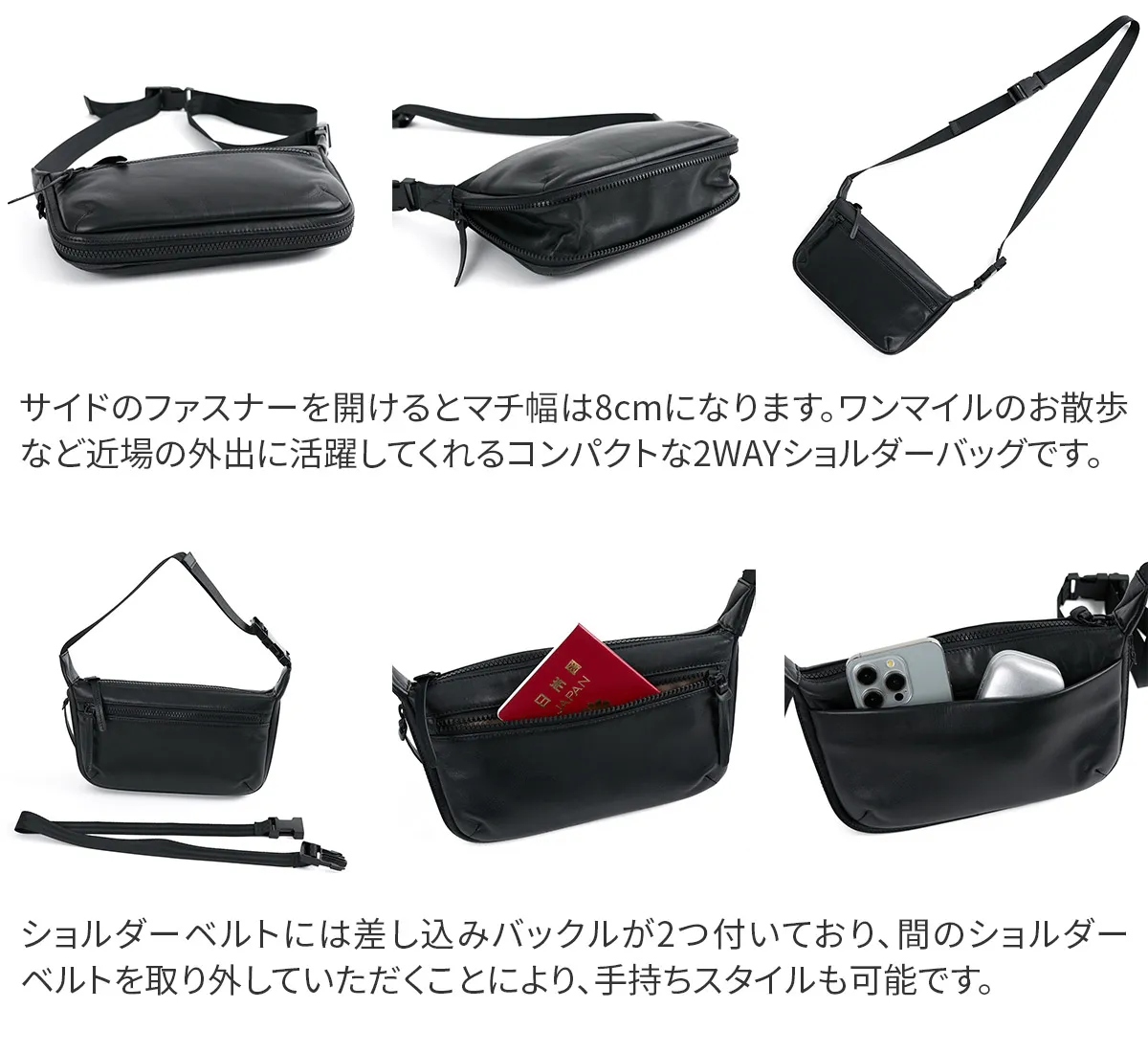 ソフトで軽量の牛革を使用しています。サイドのファスナーを開けると、マチが広がり収納力がアップします。コンパクトになるので、旅行のバッグとしてスーツケースに収納することもできます。 シンプルなデザインで性別問わずお持ちいただける2WAYショルダーバッグ。ショルダーベルトには差し込みバックルが2つ付いており、間のショルダーベルトを取り外していただくことにより、手持ちスタイルにアレンジしていただけます。荷物量が少ない方にお勧めのサイズ感となっております。ワンマイルのお散歩など近場の外出に活躍してくれるミニバッグです。