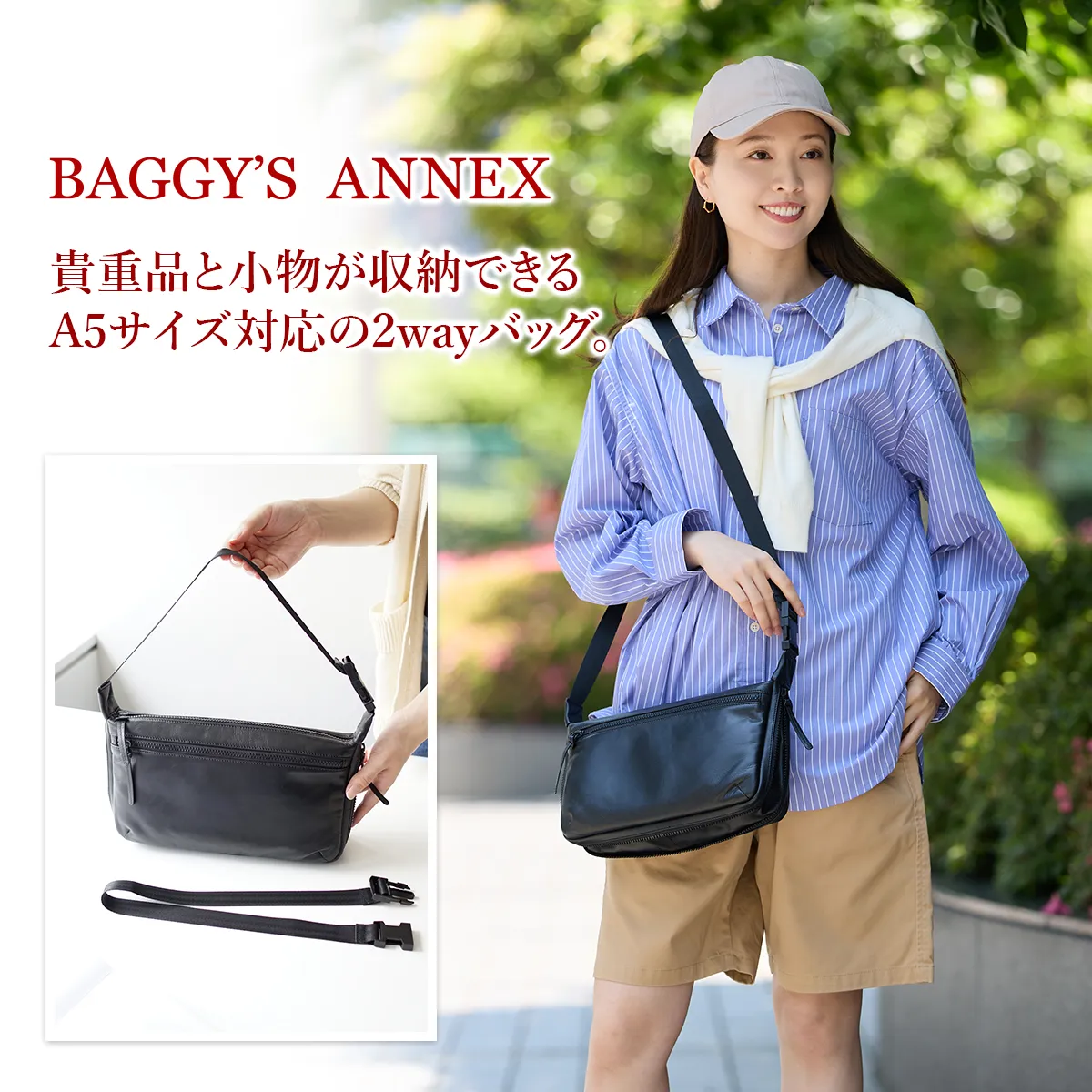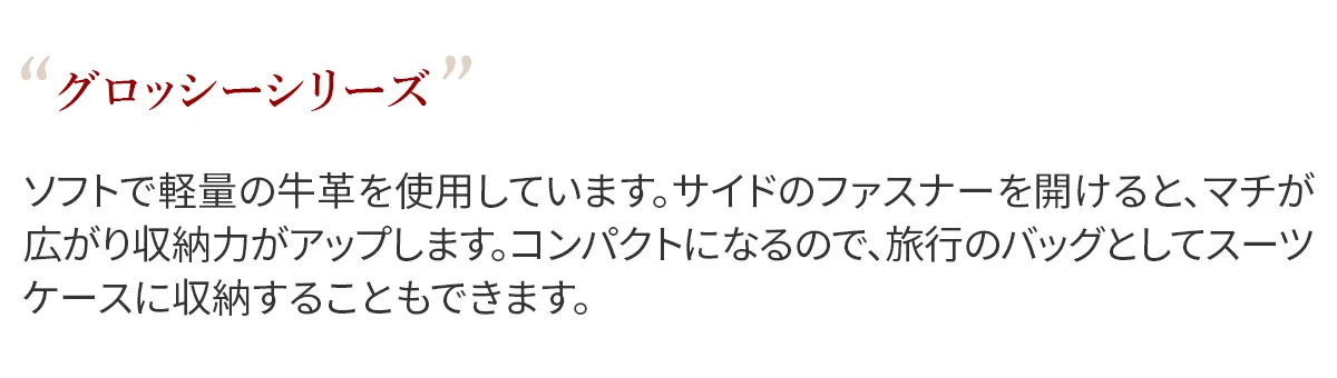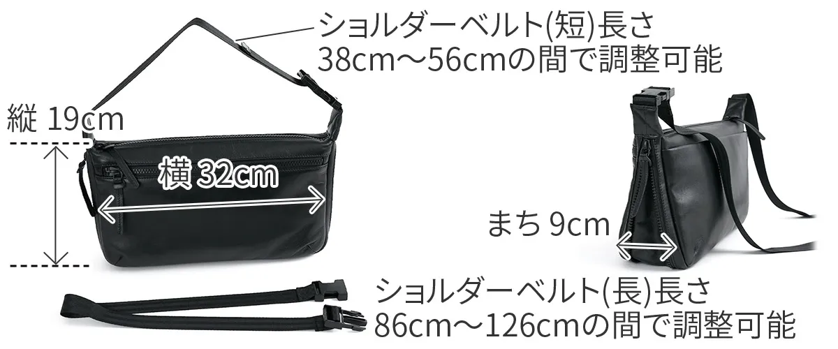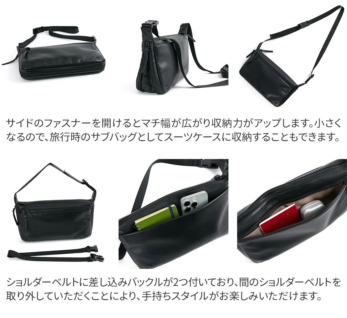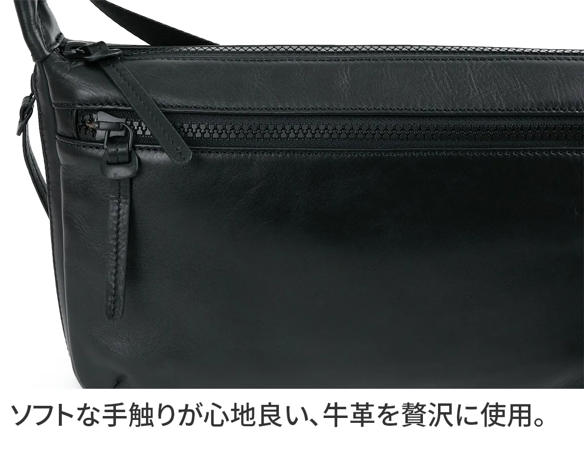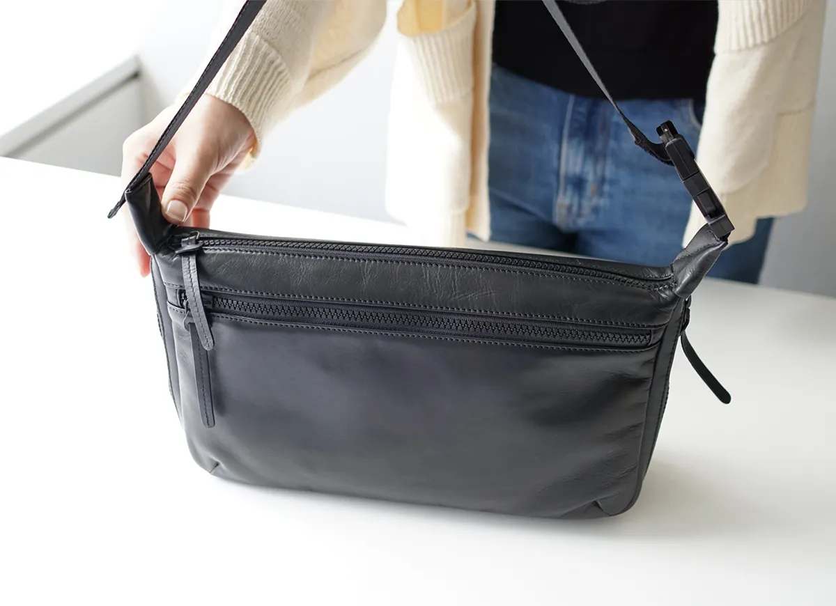 ソフトで軽量の牛革を使用しています。サイドのファスナーを開けると、マチが広がり収納力がアップします。コンパクトになるので、旅行のバッグとしてスーツケースに収納することもできます。 シンプルなデザインで性別問わずお持ちいただける2WAYショルダーバッグ。A5サイズの書類が余裕を持って収納できるサイズ感となっております。ショルダーベルトには差し込みバックルが2つ付いており、間のショルダーベルトを取り外していただくことにより手持ちスタイルがお楽しみいただけます。持ち方のアレンジができるので、ご家族やパートナーの方と共有してお持ちいただくのもお勧めです。