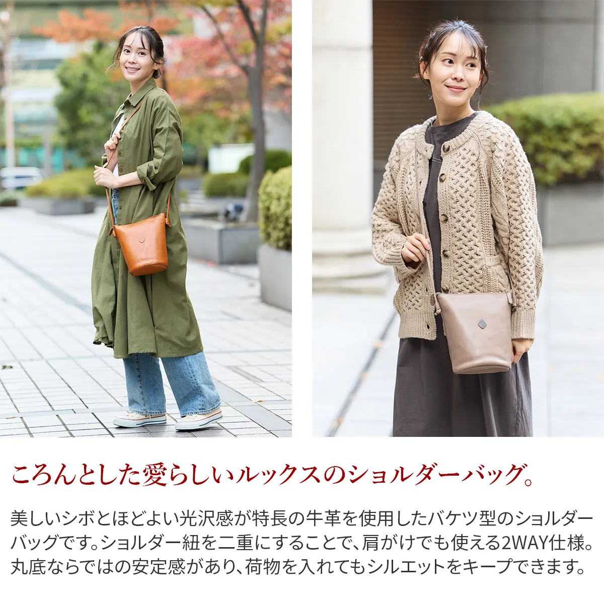 ソフトな質感と自然な風合いのレザーが魅力の2WAYショルダーバッグです。 たっぷりと底マチを備えており、見た目以上の収納力を持っています。 ファスナー式でスムーズに開閉ができ、中身が見えず安全面でも安心。 ショルダー紐を二重にすると、肩掛けしやすい長さに変えることができます。 軽量で小ぶりなサイズ感が、どこへ行くにも持ち運びがしやすく使い勝手の良いアイテムです。