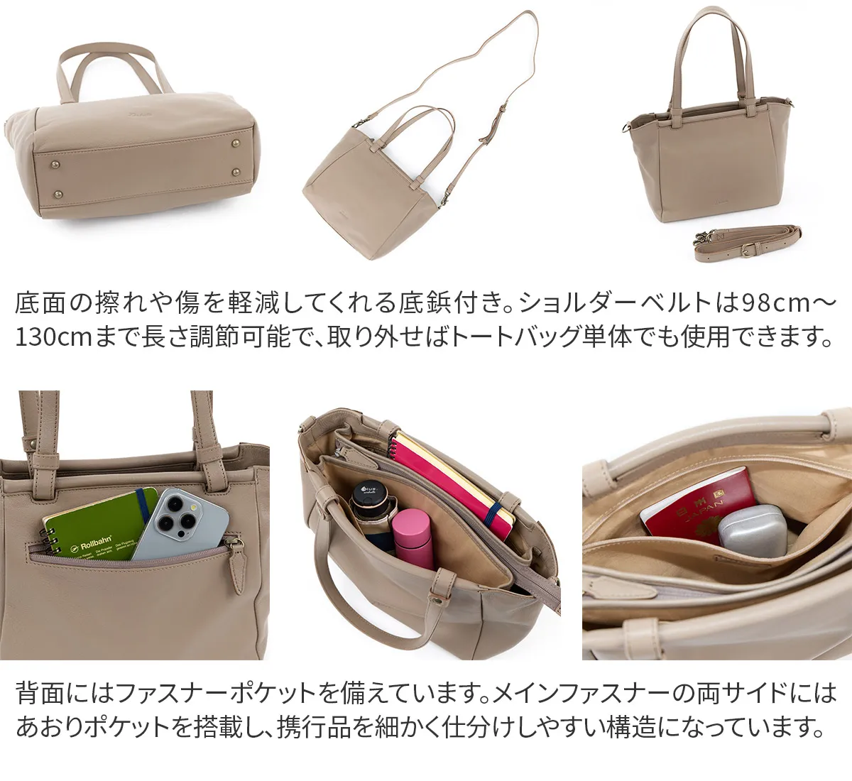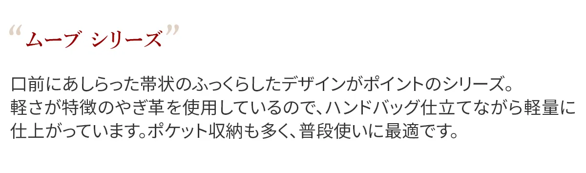 口前にあしらった帯状のふっくらしたデザインがポイントのシリーズ。 軽さが特徴のやぎ革を使用しているので、ハンドバッグ仕立てながら軽量に仕上がっています。 ポケット収納も多く、普段使いに最適です。 軽量でキズが付きにくく、毎日のお仕事バッグとしても最適な2WAYトートバッグ。 上品なデザインにベーシックなカラーバリエーションを備えており、コーデに合わせやすく使い勝手抜群◎ メイン収納部の前後にはあおりポケットを配置しており、荷物の整理がしやすく機能的です。