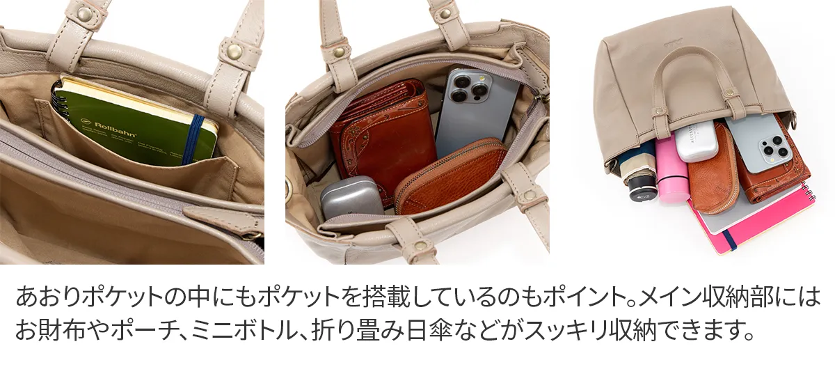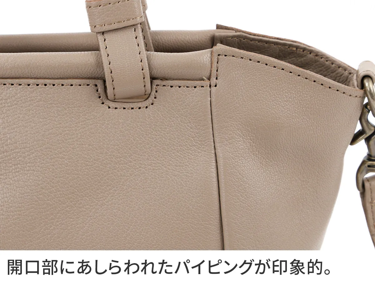 口前にあしらった帯状のふっくらしたデザインがポイントのシリーズ。 軽さが特徴のやぎ革を使用しているので、ハンドバッグ仕立てながら軽量に仕上がっています。 ポケット収納も多く、普段使いに最適です。 軽量でキズが付きにくく、デイリーユースとしても最適な2WAYトートバッグ。 トレンドに左右されないデザイン性と小ぶりなサイズ感は大人可愛い印象に。 コンパクトながらメイン収納部の前後にはあおりポケットを配置。 機能的な仕様で使い心地の良いアイテムとなっています。
