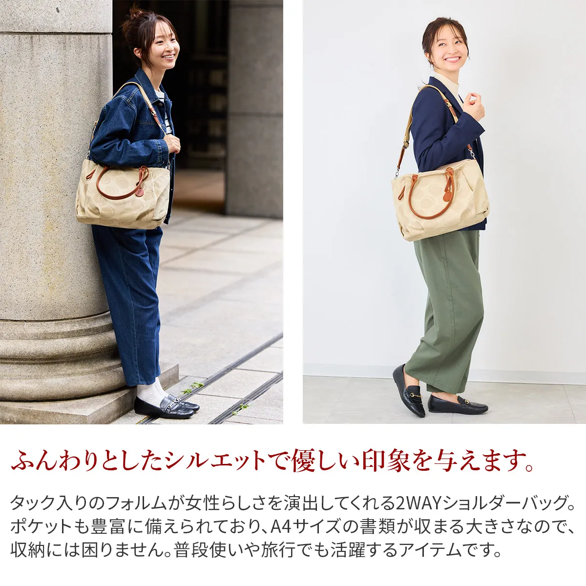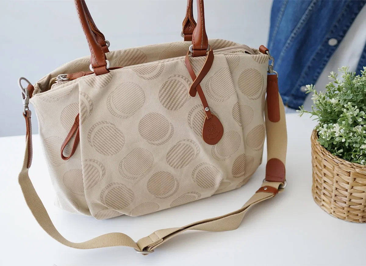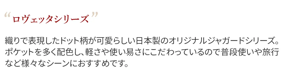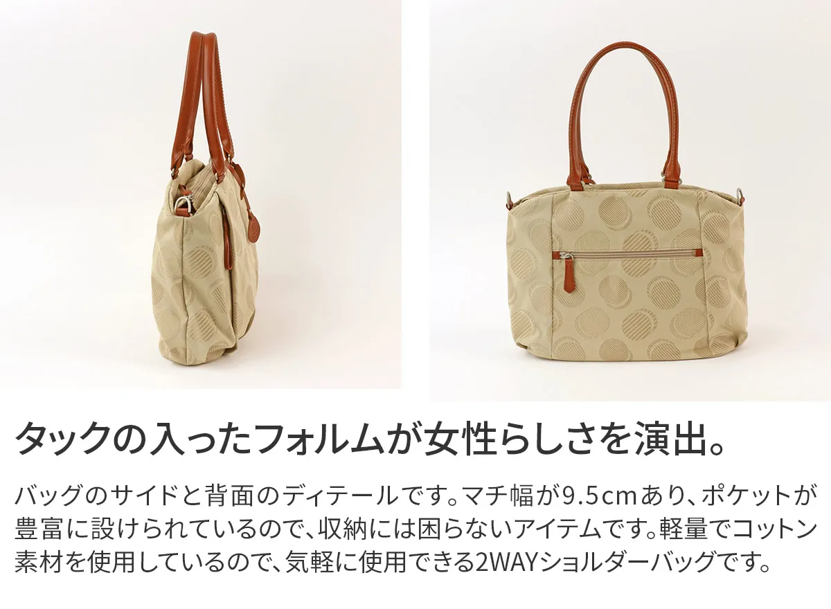 織りで表現したドット柄が可愛らしい日本製のオリジナルジャガードシリーズ。 ポケットを多く配色し、軽さや使い易さにこだわっているので普段使いや旅行など様々なシーンにおすすめです。 軽量で気軽に使用できるコットン素材を使用した、ドット柄が愛らしいバッグです。 ふんわりとタックの入ったフォルムが女性らしさを演出。 豊富なポケットが備えられているので、小物を特定の位置に収納でき把握がしやすい構造です。 内部はA4書類が収まるサイズ感で、オンオフ問わず活躍します。 持ち手は長めに設定されており、ショルダーベルトも備えられているので、 手持ち、肩掛けから斜め掛けまでお好きな持ち方をお選びいただけます。